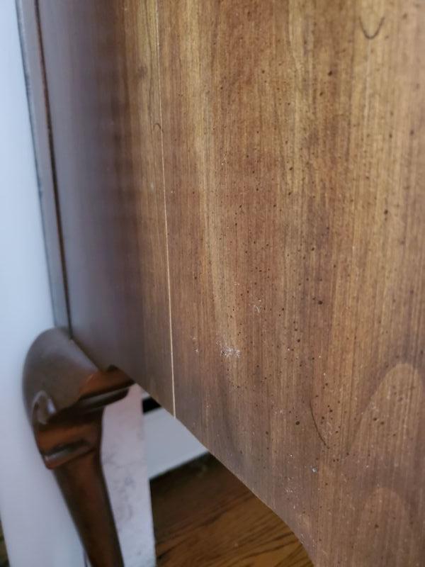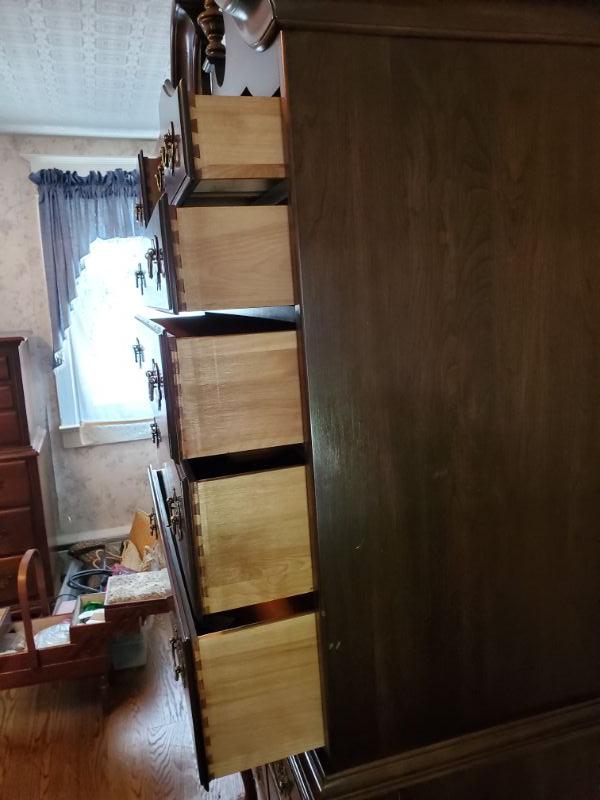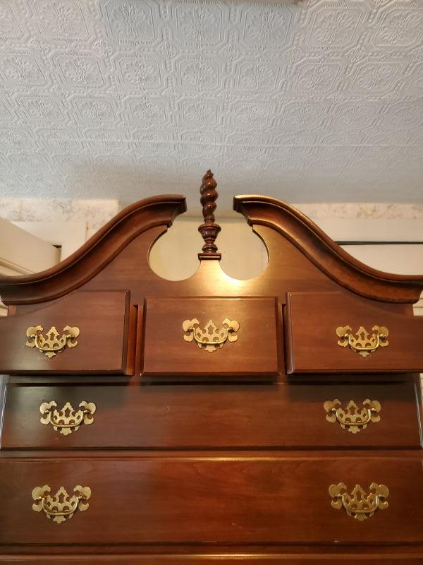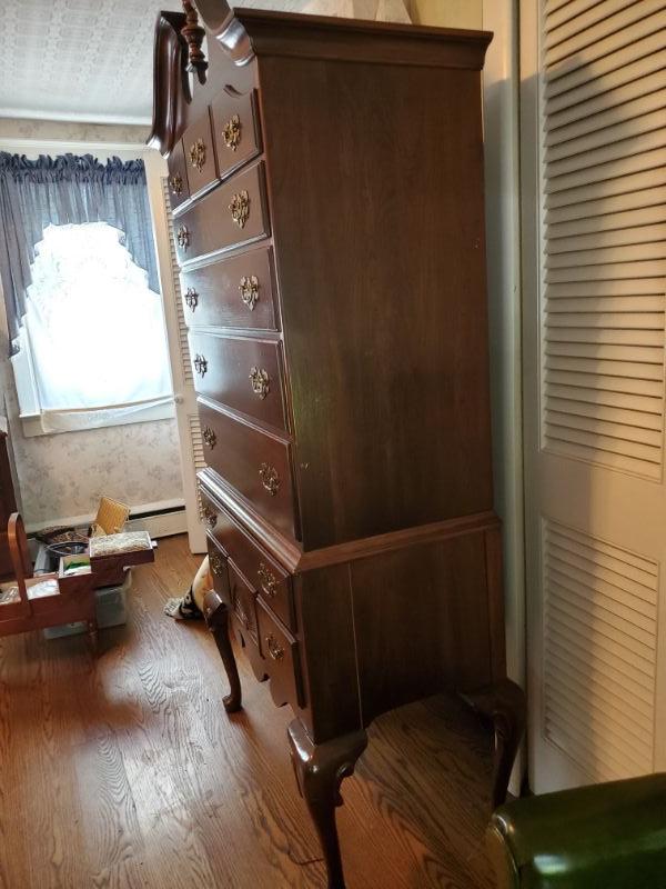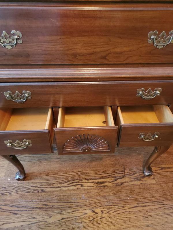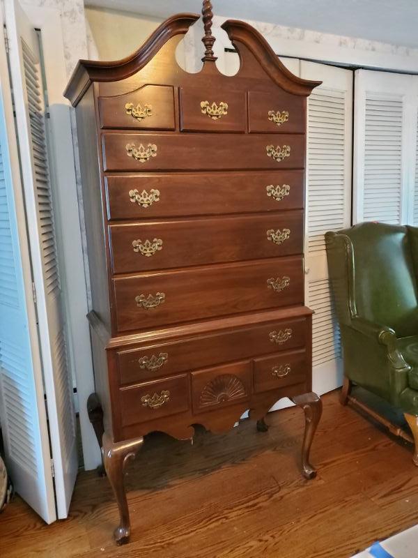 Ethan Allen tall boy dresser. Three small drawers across top and across bottom. Split in veneer on one side. 36x21x80 Bring help to move from second floor.