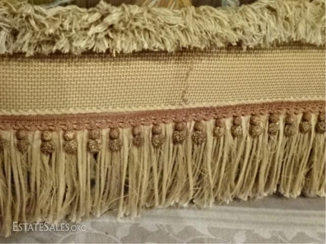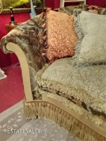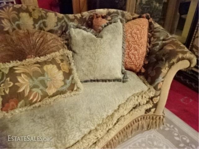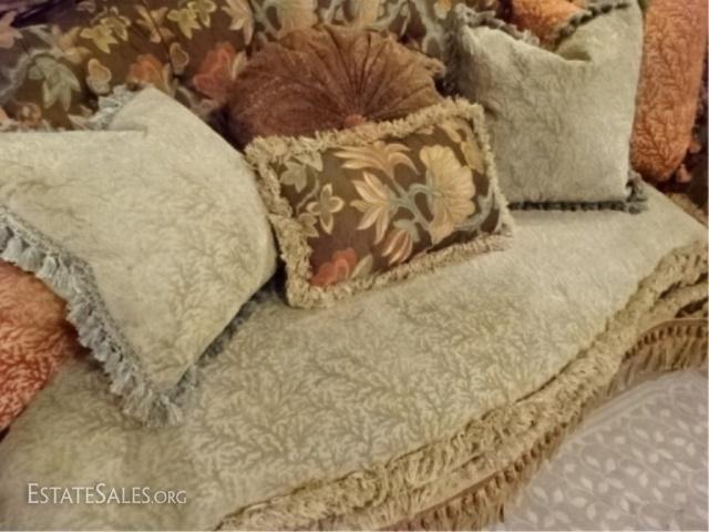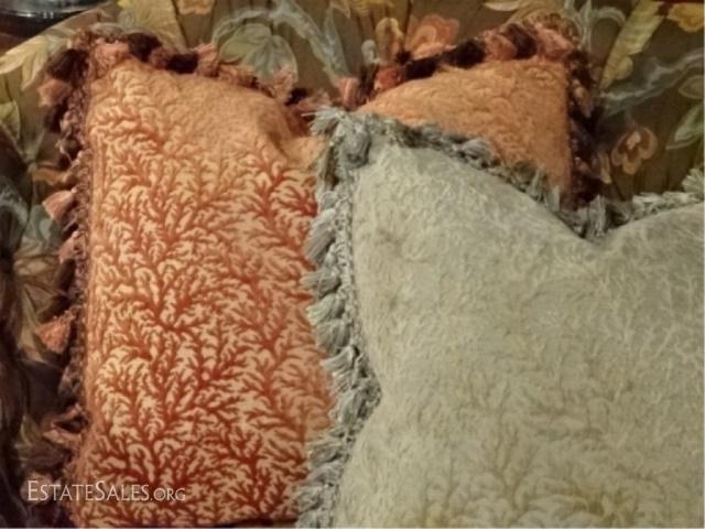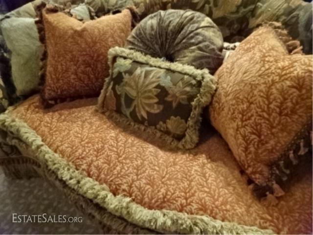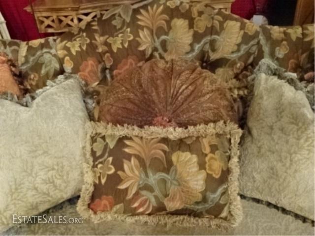 LOT 54: CAROL HICKS BOLTON EJ VICTOR SOFA, UPHOLSTERED WITH 7 PILLOWS, SEAT CUSHION IS REVERSIBLE PALE GREEN ON ONE SIDE, TERRA COTTA ON REVERSE, #1 OF TWO ALMOST IDENTICAL SOFAS AVAILABLE THIS AUCTION (THIS SOFA HAS A PALE GREEN STRIPE KIDNEY PILLOW) EXCELLENT LIGHTLY USED CONDITION, NO STAINS OR RIPS, LABELED, 102"W X 52"D X 40"H