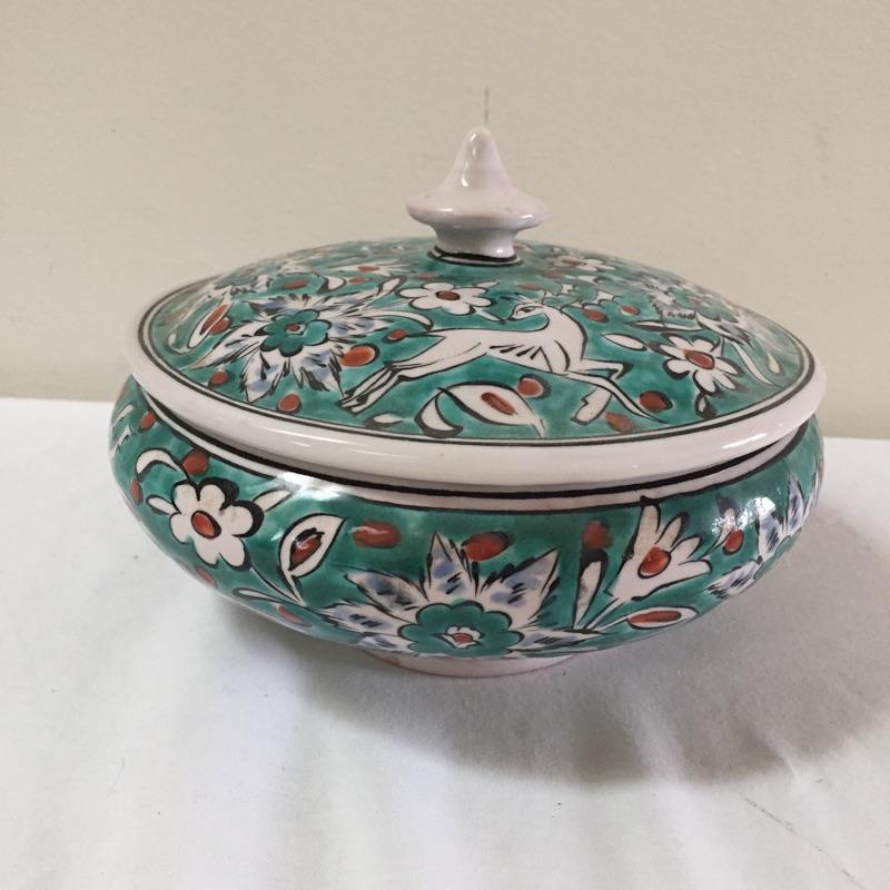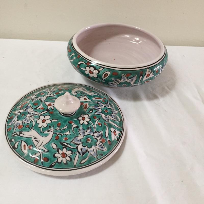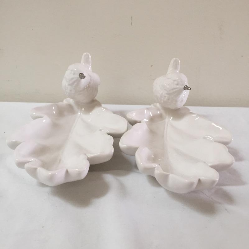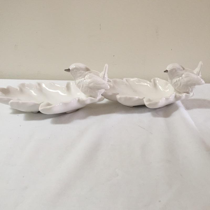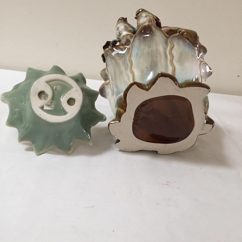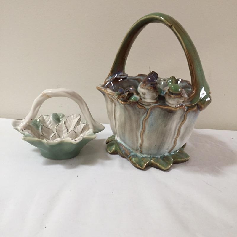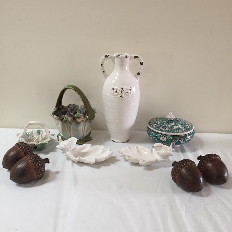 Ceramic collection includes vase , bowl with lid , two baskets , pair of dishes with birds and four acorns(possibly heavy plastic). Vase measures 12” tall.