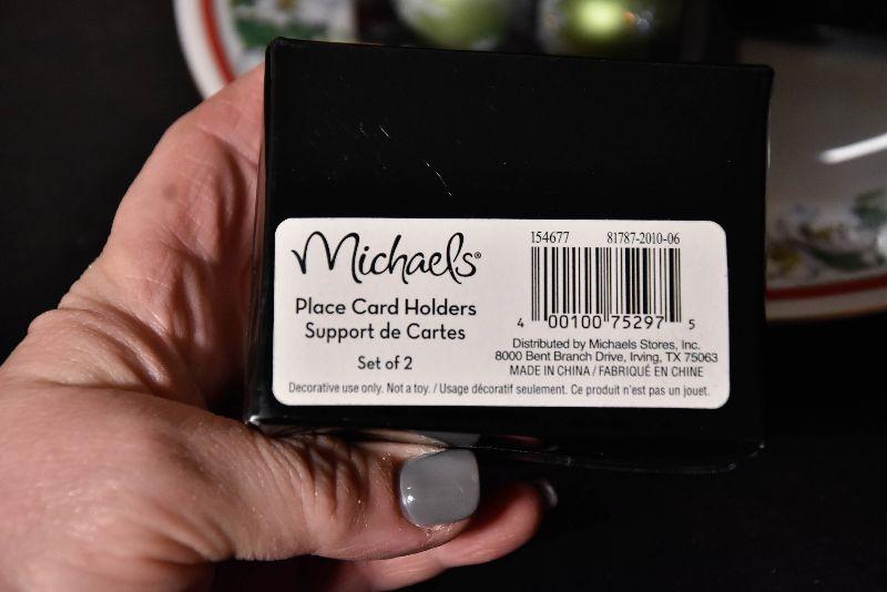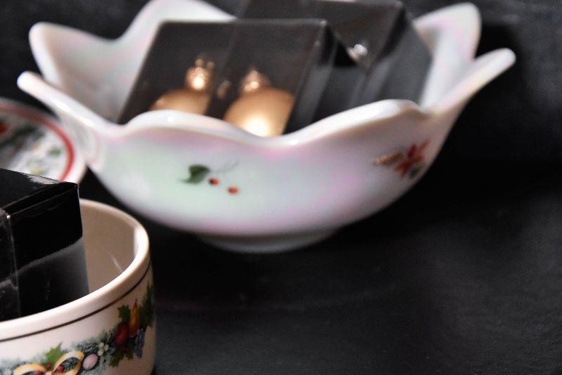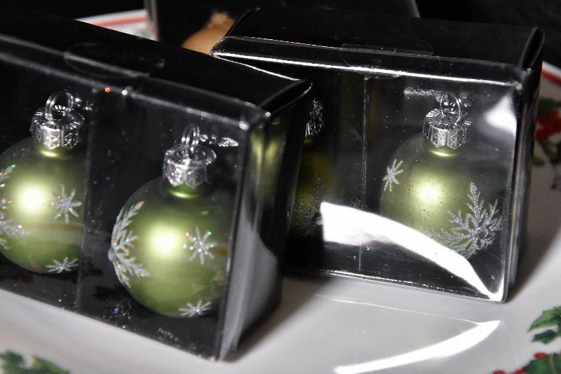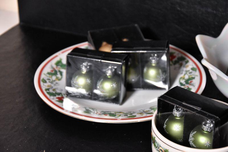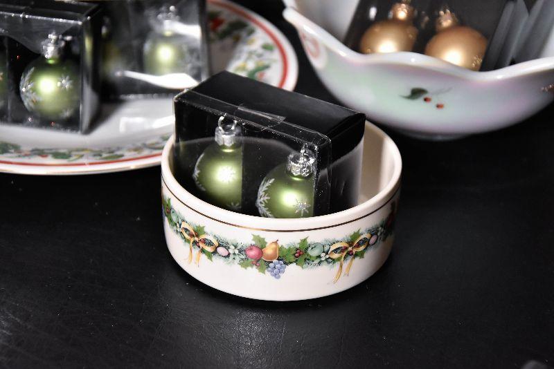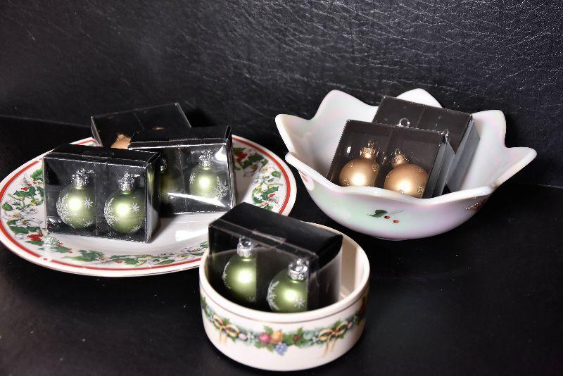 Two bowls, and one plate along with 6 sets (12) Place Holder ornaments