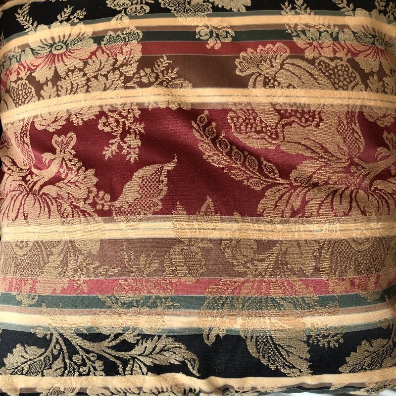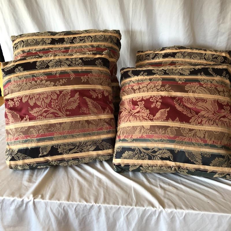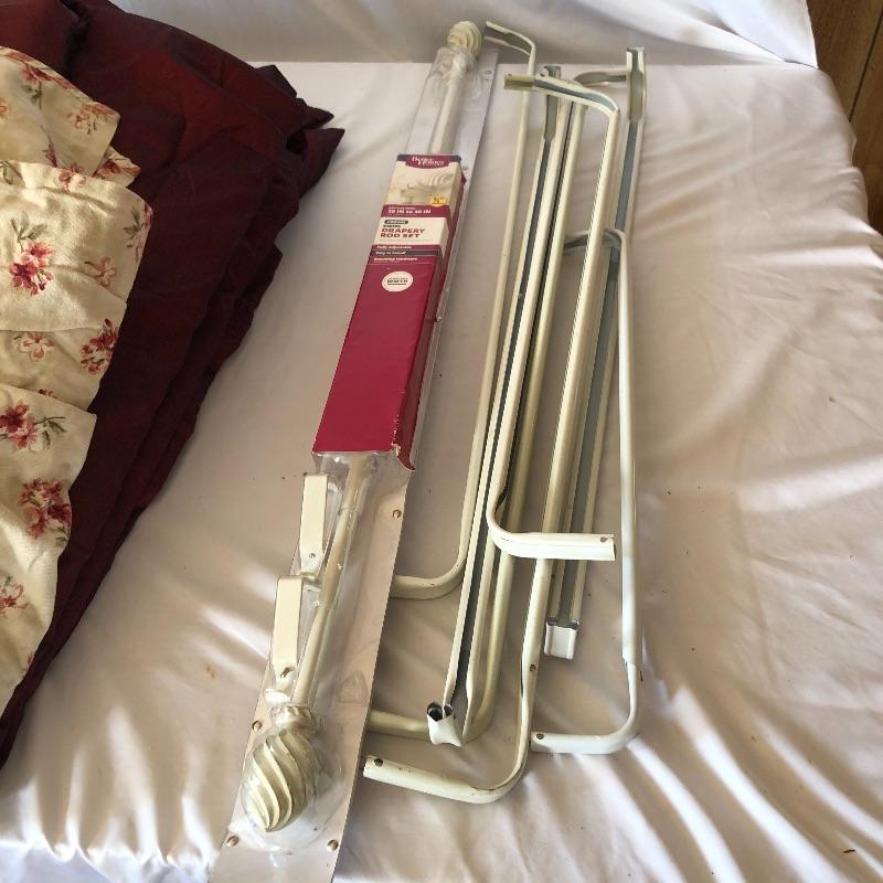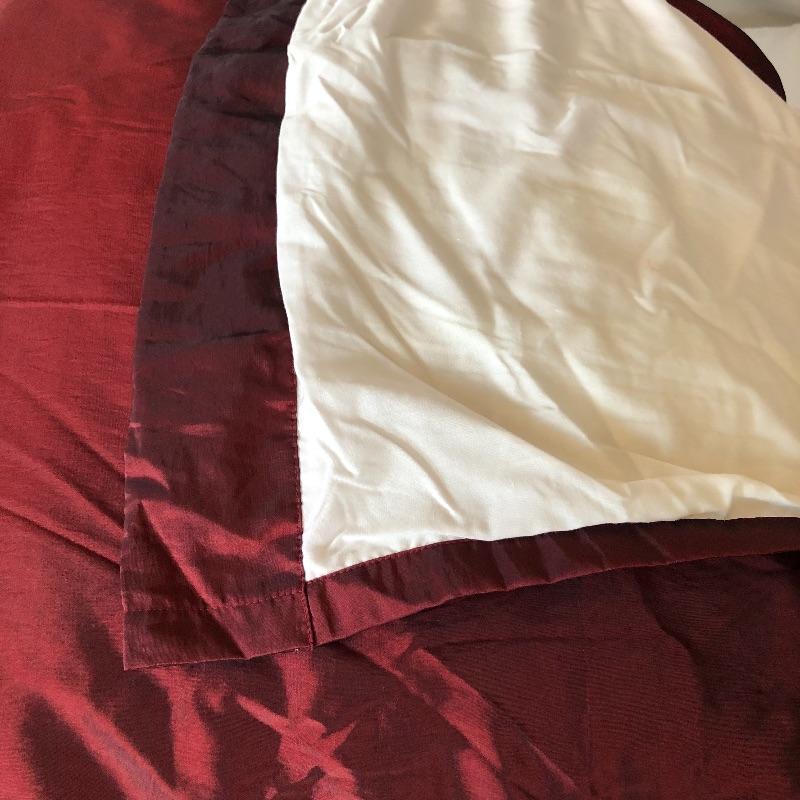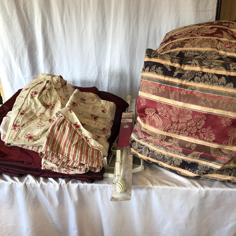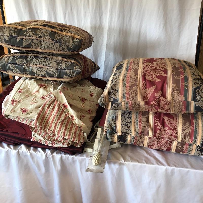 Adorn your house in these lined rich burgundy/maroon looking curtains. There are eight lined panels measuring 53.5”x 93”. The four valances will brighten any window and each measure 70”x 15.5” The pillows are sure to be a focal point of any couch. There are four pillows with the largest 21 “x 21” and the other three are slightly smaller. Lot includes curtain rods with one being decorative. Local pick up only.