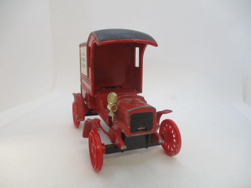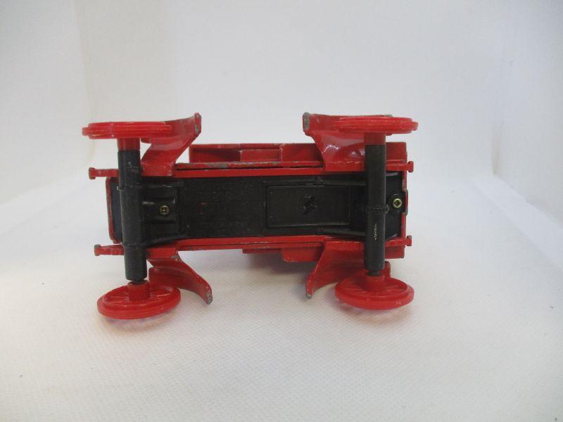 This bank has quite a bit of character, but it also has some issues. The rubber tires are missing and one of the light/lamps is missing from the front of the car. There is also paint wear. While those are issues, I think that they add to the character of the metal bank. It is 5" wide and about 3.75" tall.