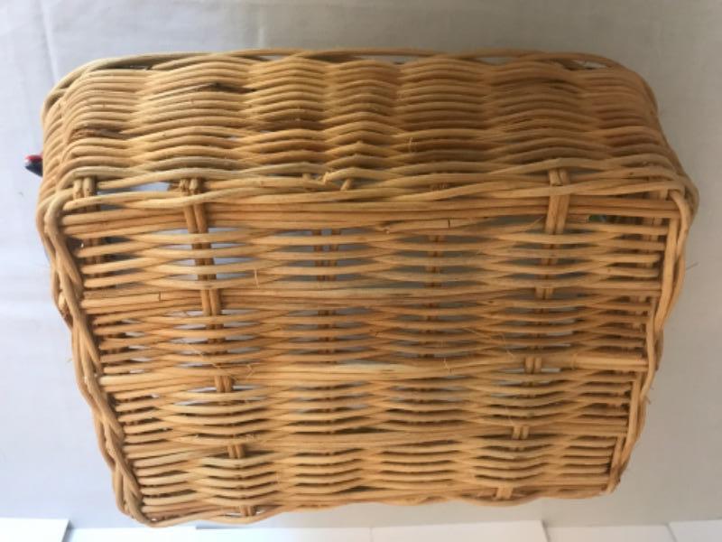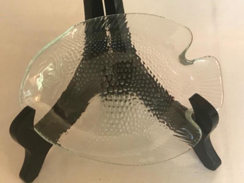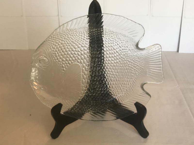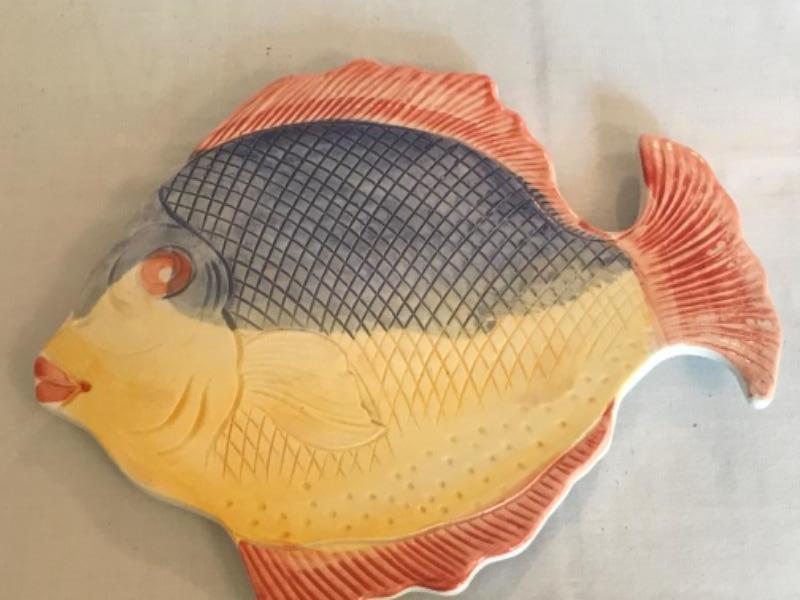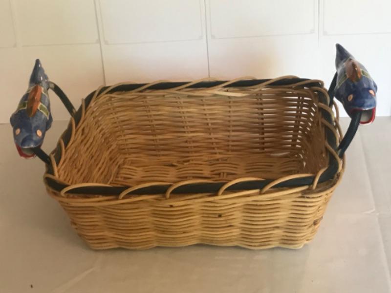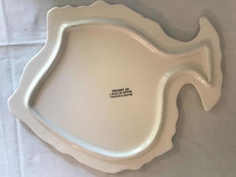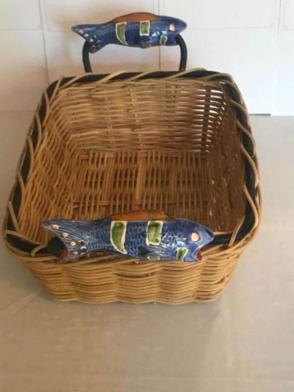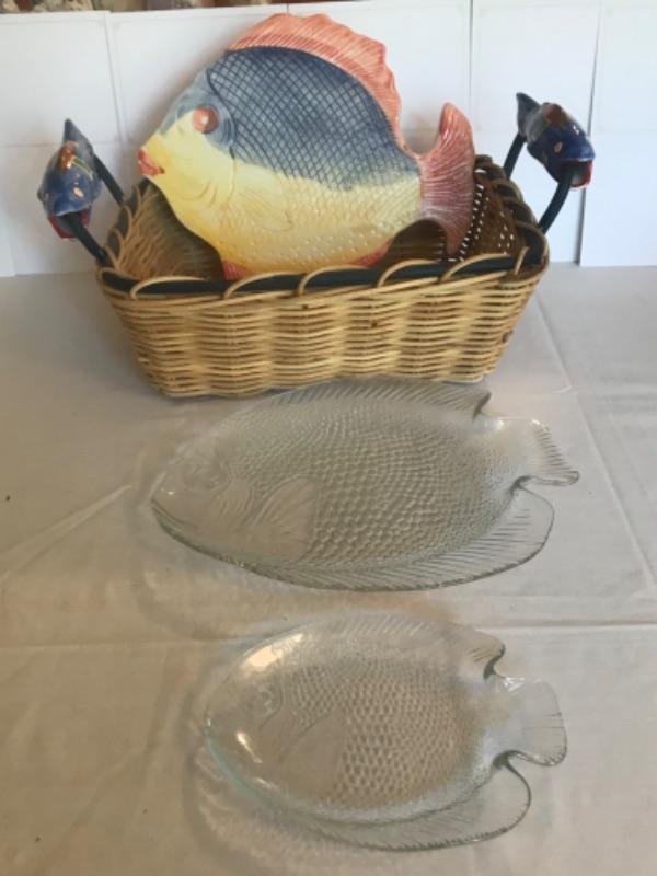 Basket with porcelain fish handles. Pair of Arcoroc France glass fish plates measuring 10”x9” and 6-1/2”x5”. Hand painted fish trivet by: Ancora made in Italy 11-1/4”x9”