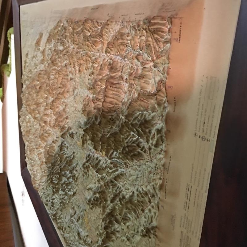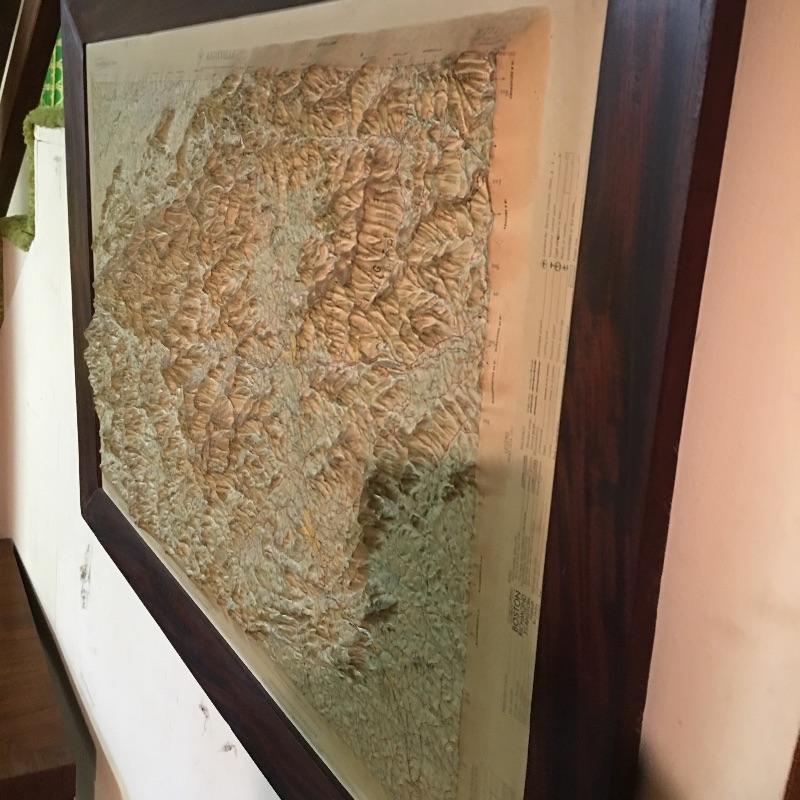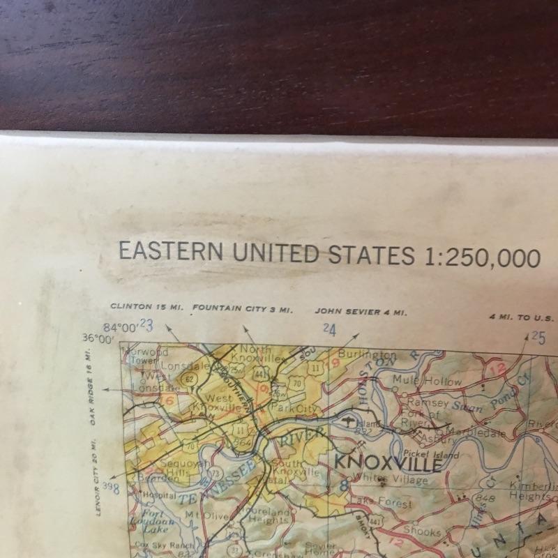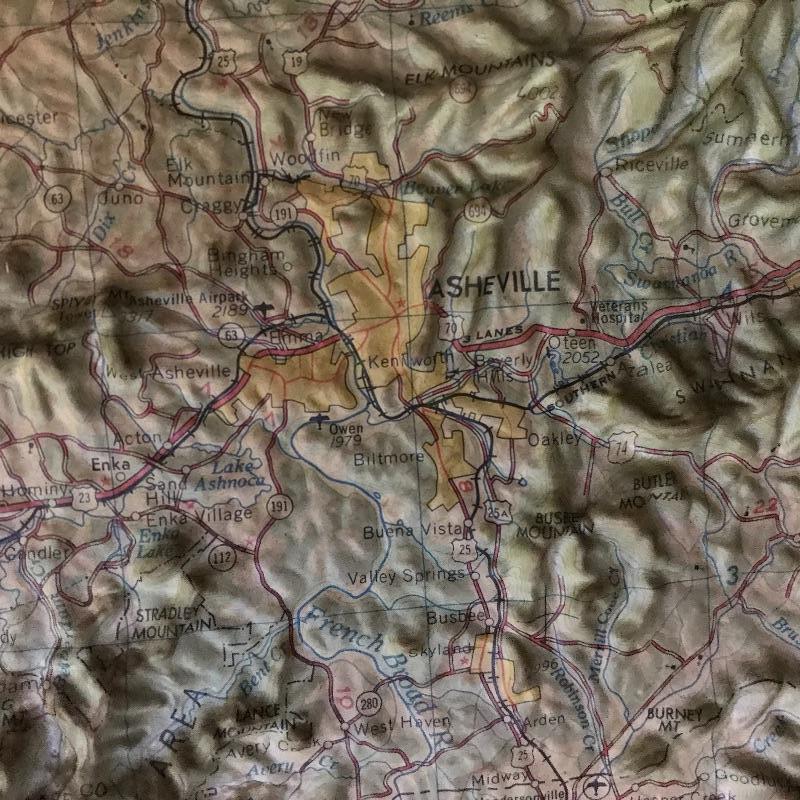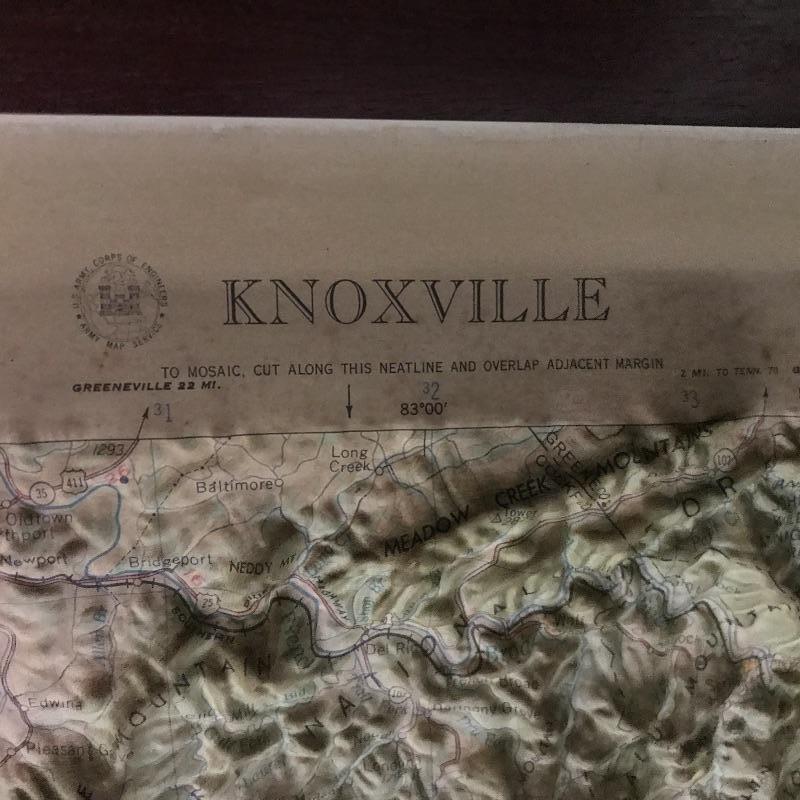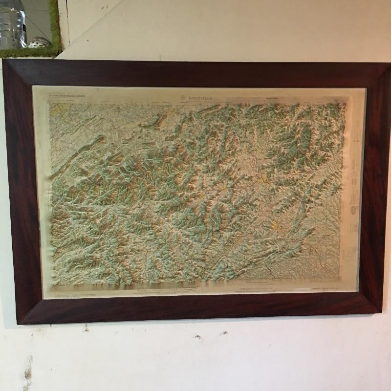 Asheville is included in this large framed topographical relief map of Knoxville. A great way to show your kids or friends the different elevations in the area. Frame measures 35” x 37”.