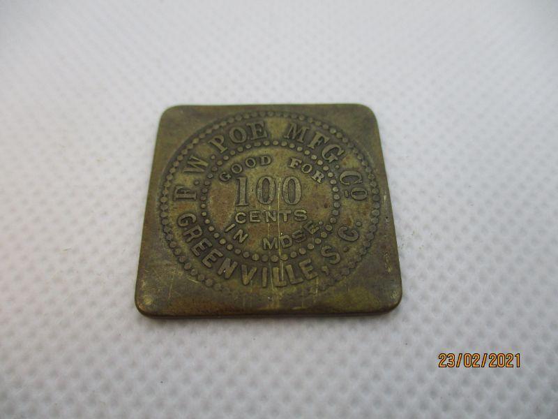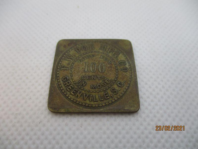 This token was good for 100 cents in the F.W. Poe Company Mercantile Store.