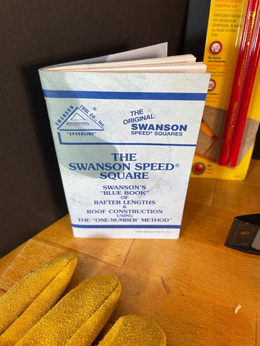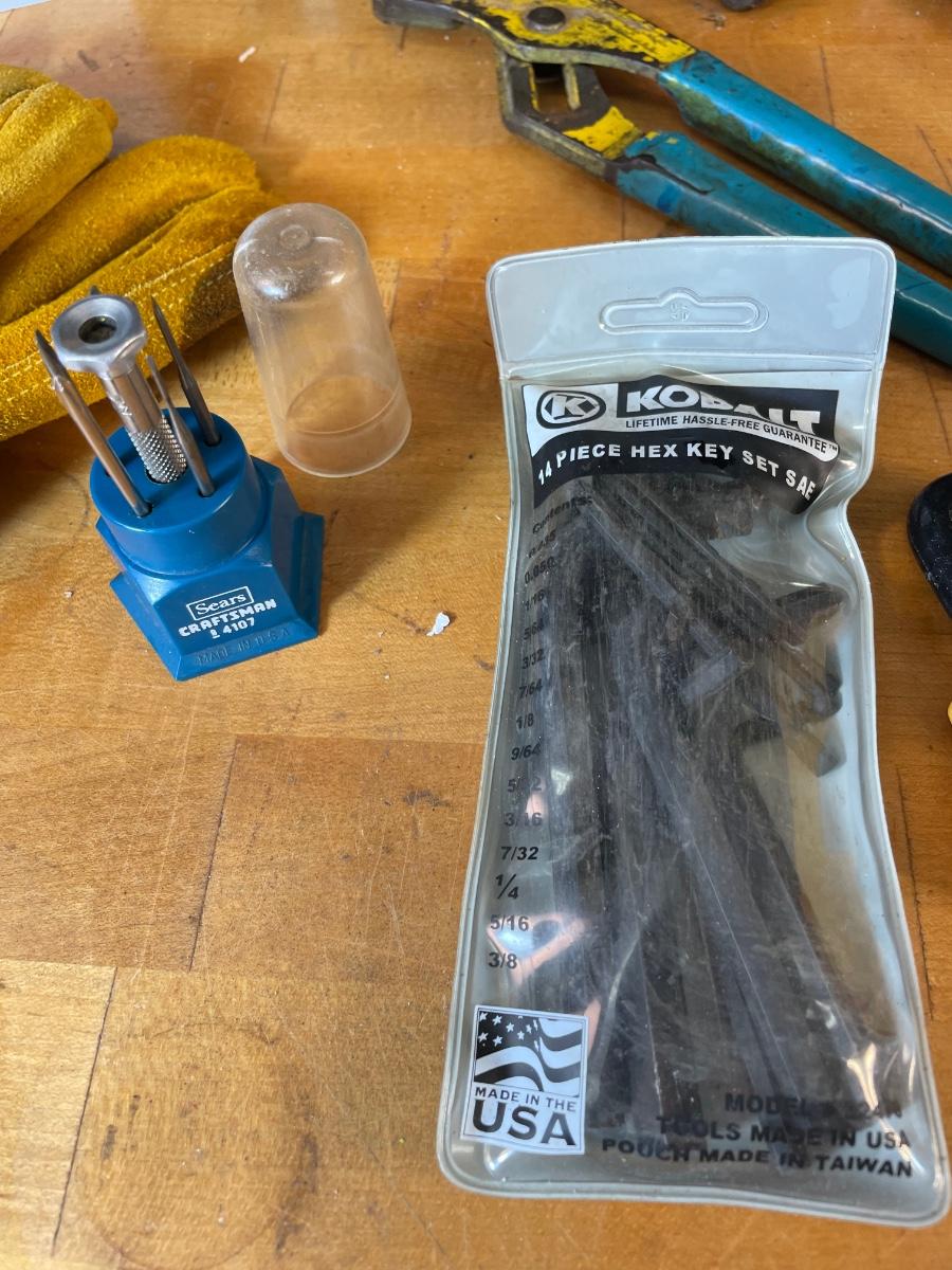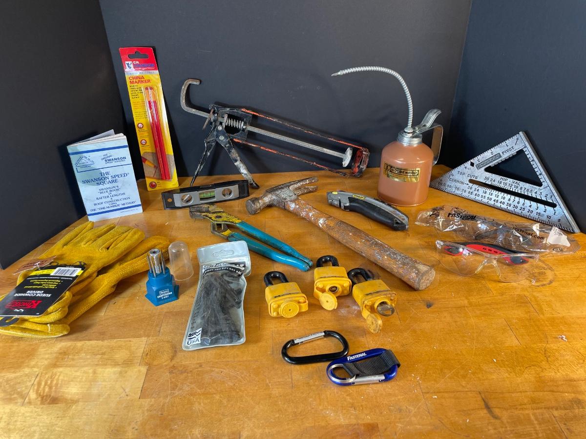 Oil can, caulk gun, 3 padlocks, hammer, box cutter, pliers, leather work gloves, safety goggles, Swanson Speed Square, hex key set, Craftsman tiny screwdriver set.