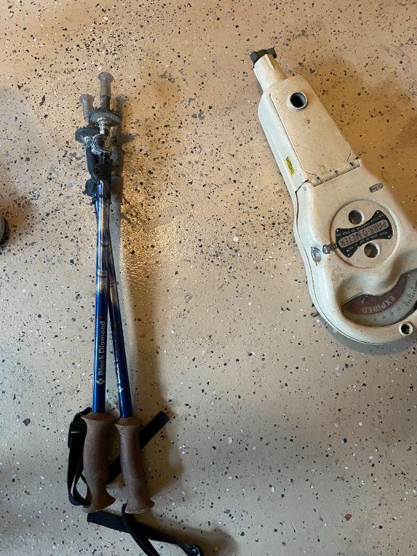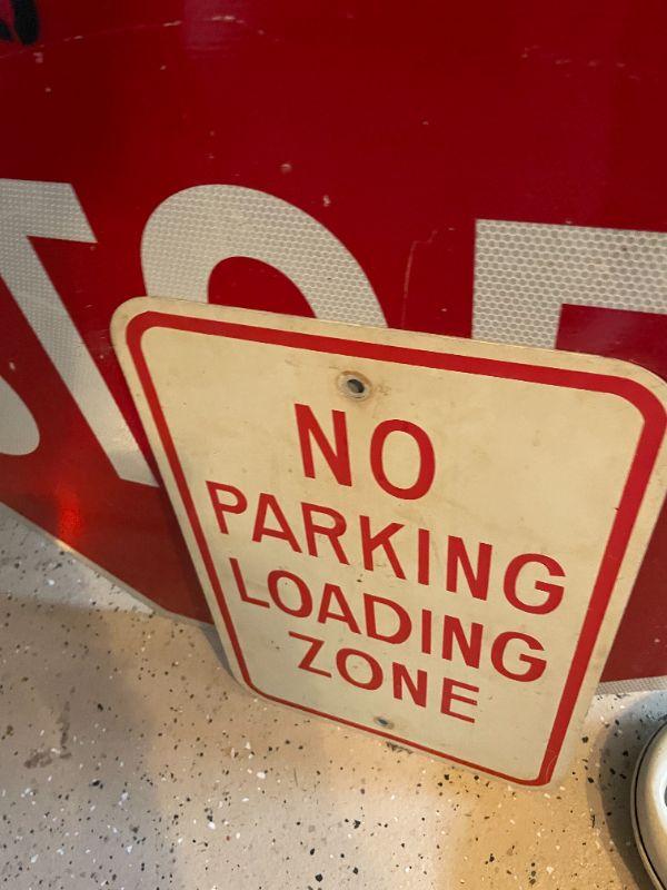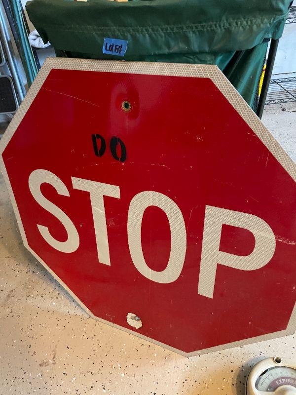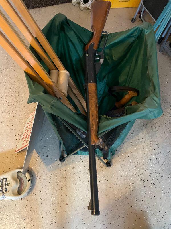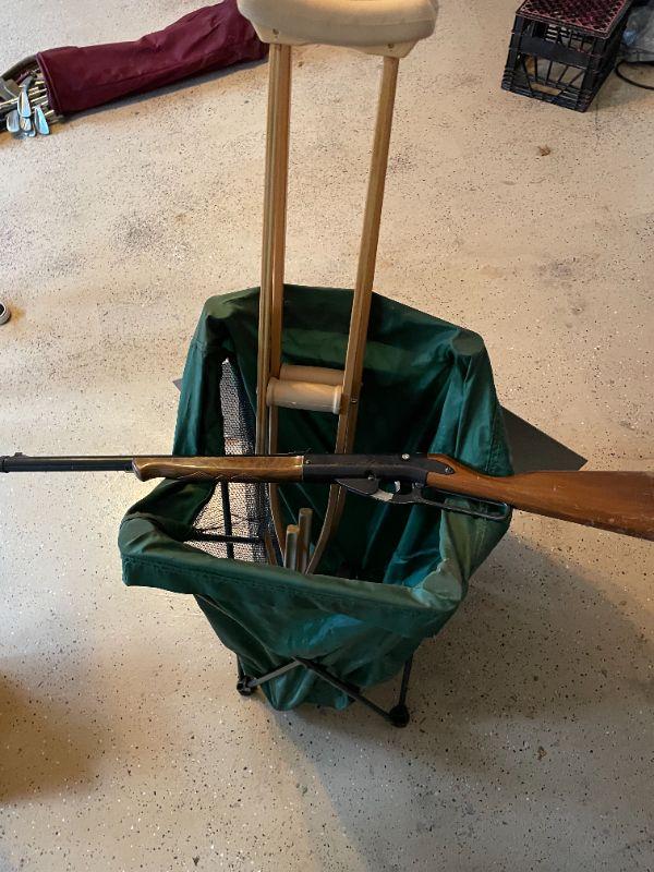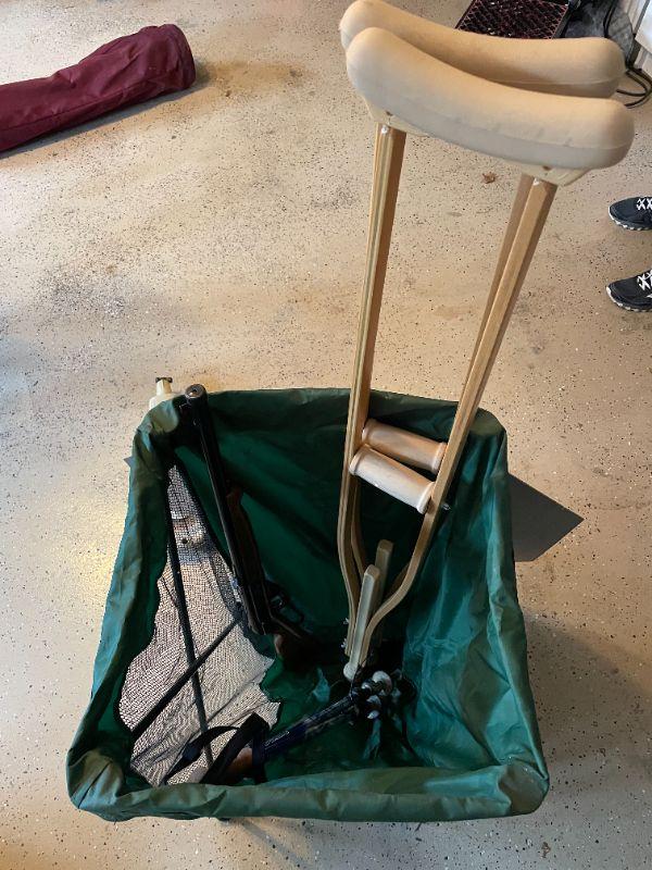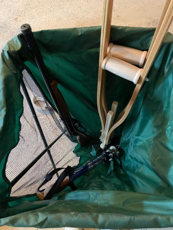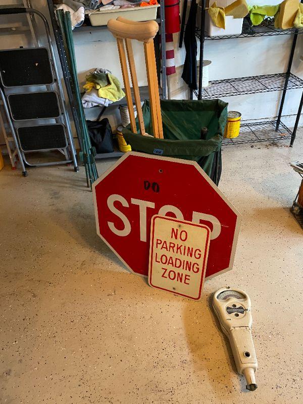 Green standing bag, vintage stop sign, vintage no parking sign, vintage parking meter, crutches, (2) ski poles, BB gun.