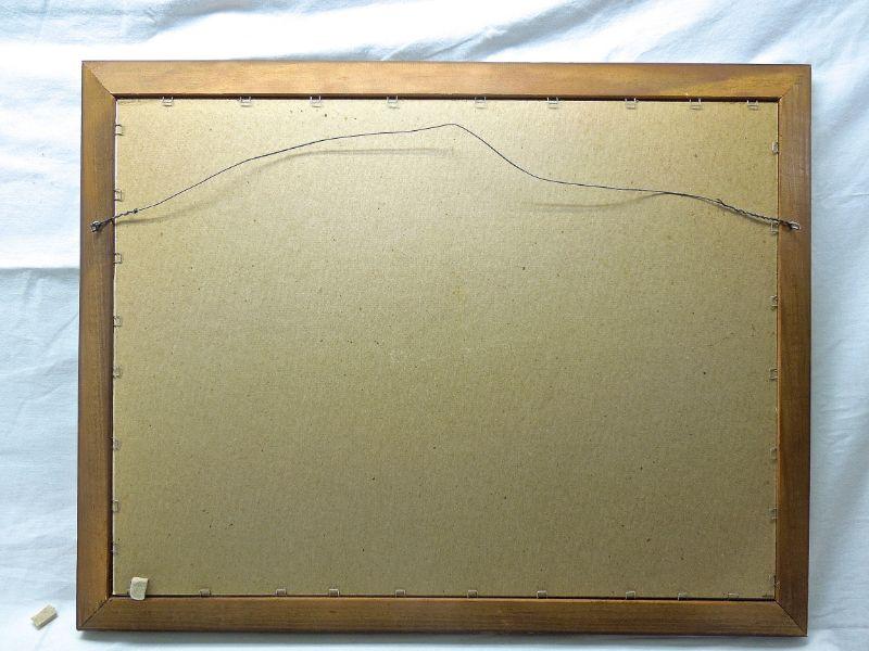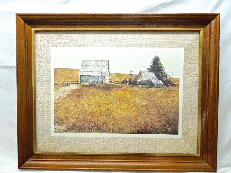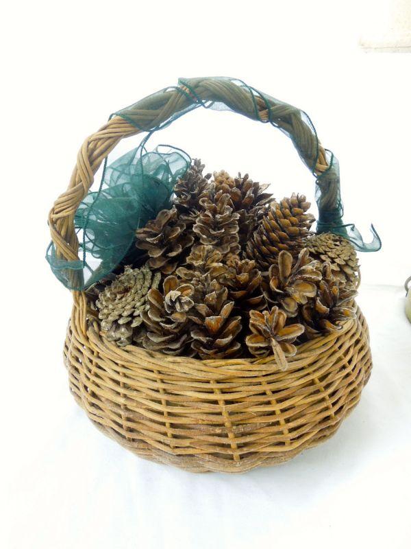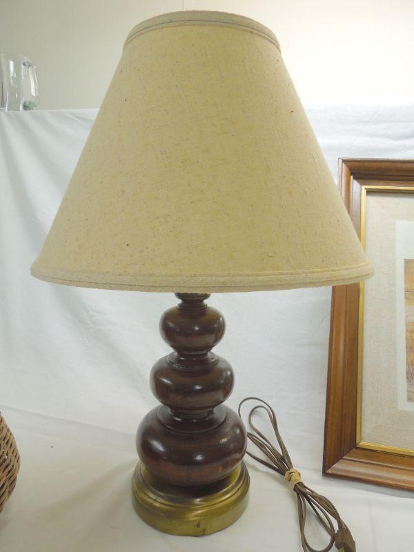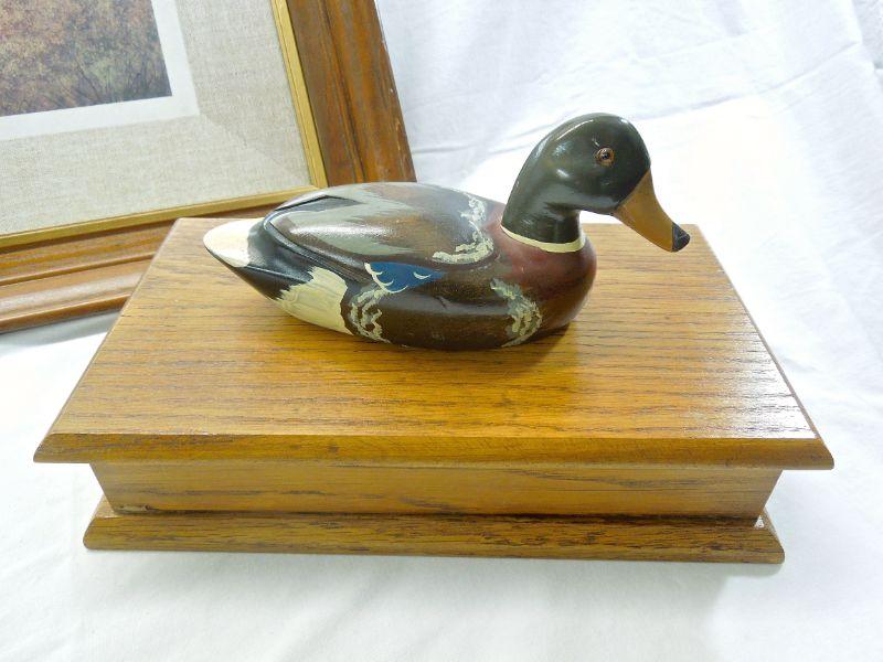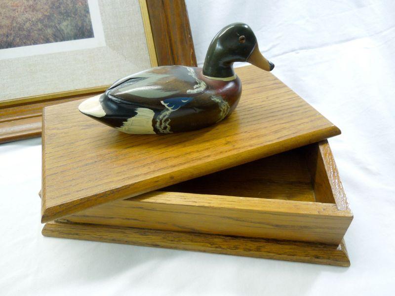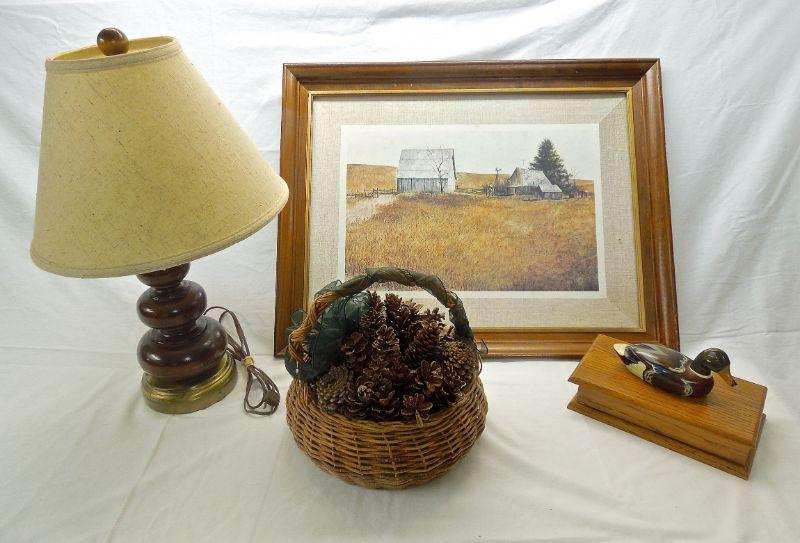 Duck box 10" x 6"; Framed shed picture 28" x 22"; wood lamp with shade 22" tall; handmade basket with pinecones.