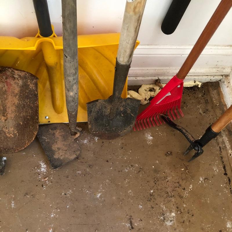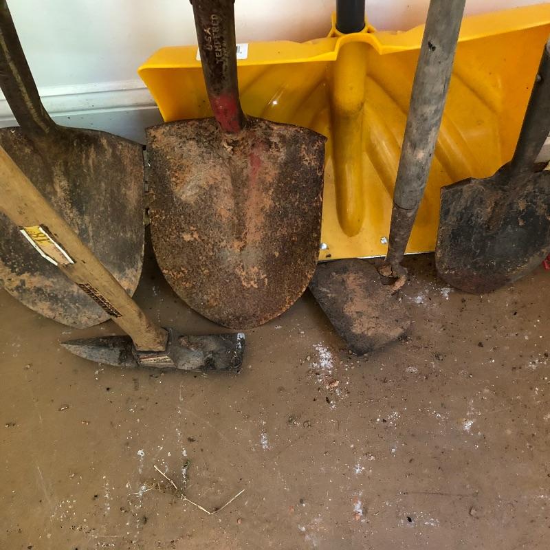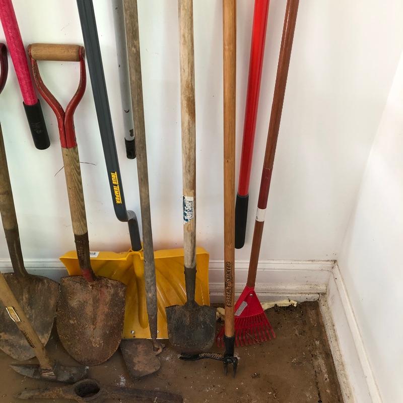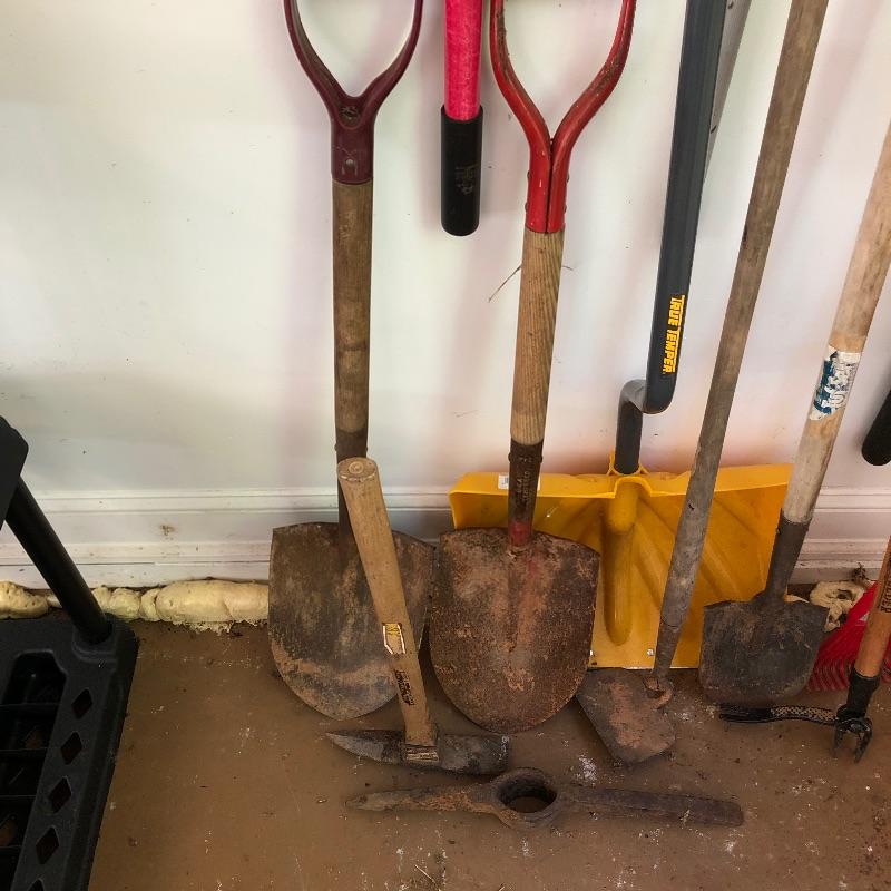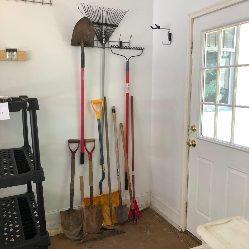 Vintage and new gardening tools here that includes both a heavy and a leaf rake, multiple shovels, a plastic snow shovel, pick ax and more, see images. Hooks are not included.