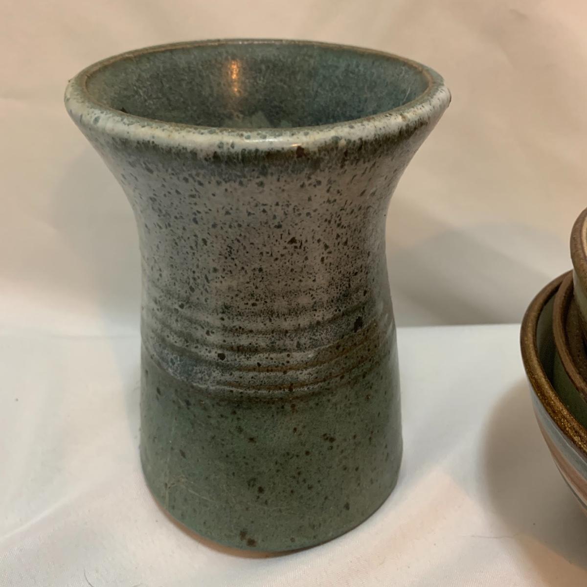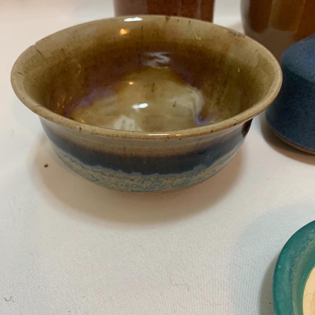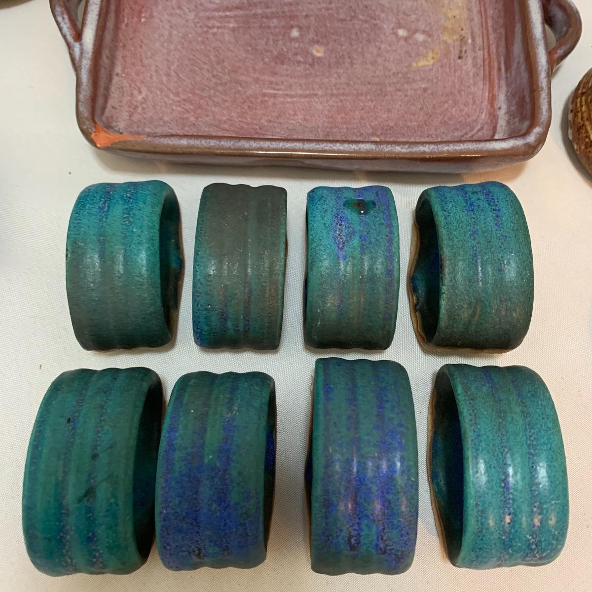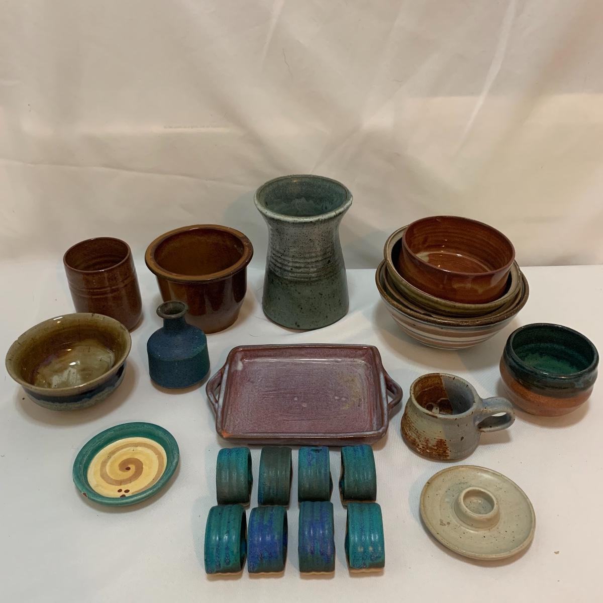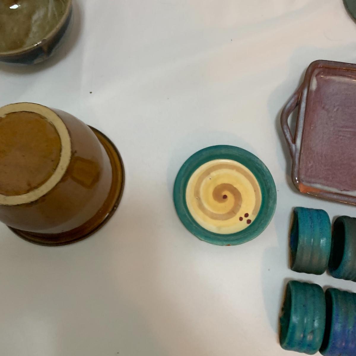 This pottery lot is absolutely GORGEOUS!!! Included are several bowls, a cup, a mug, a covered dish, a vase, a candle holder, a tray, and a stunning set of napkin rings. Take a good look through the pics and you’ll realize how beautiful this pottery is! All pieces are handmade and most are signed. The vase is 7", the largest bowl is 7"x3". As with lots of functional pottery there are a few chips here and there. See pics to determine content and condition.