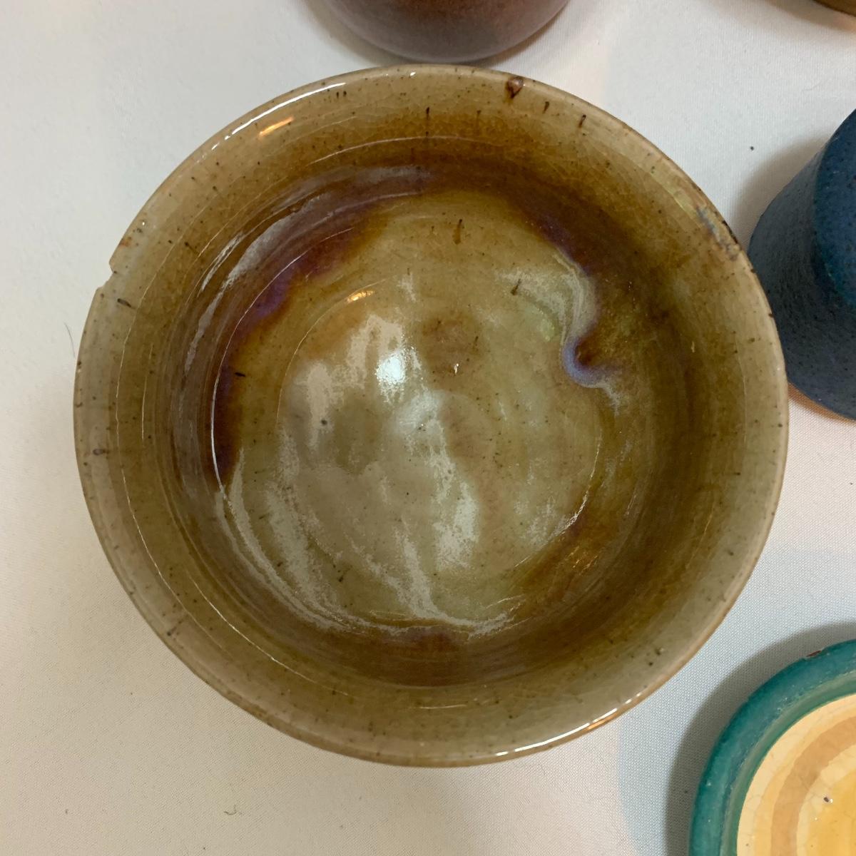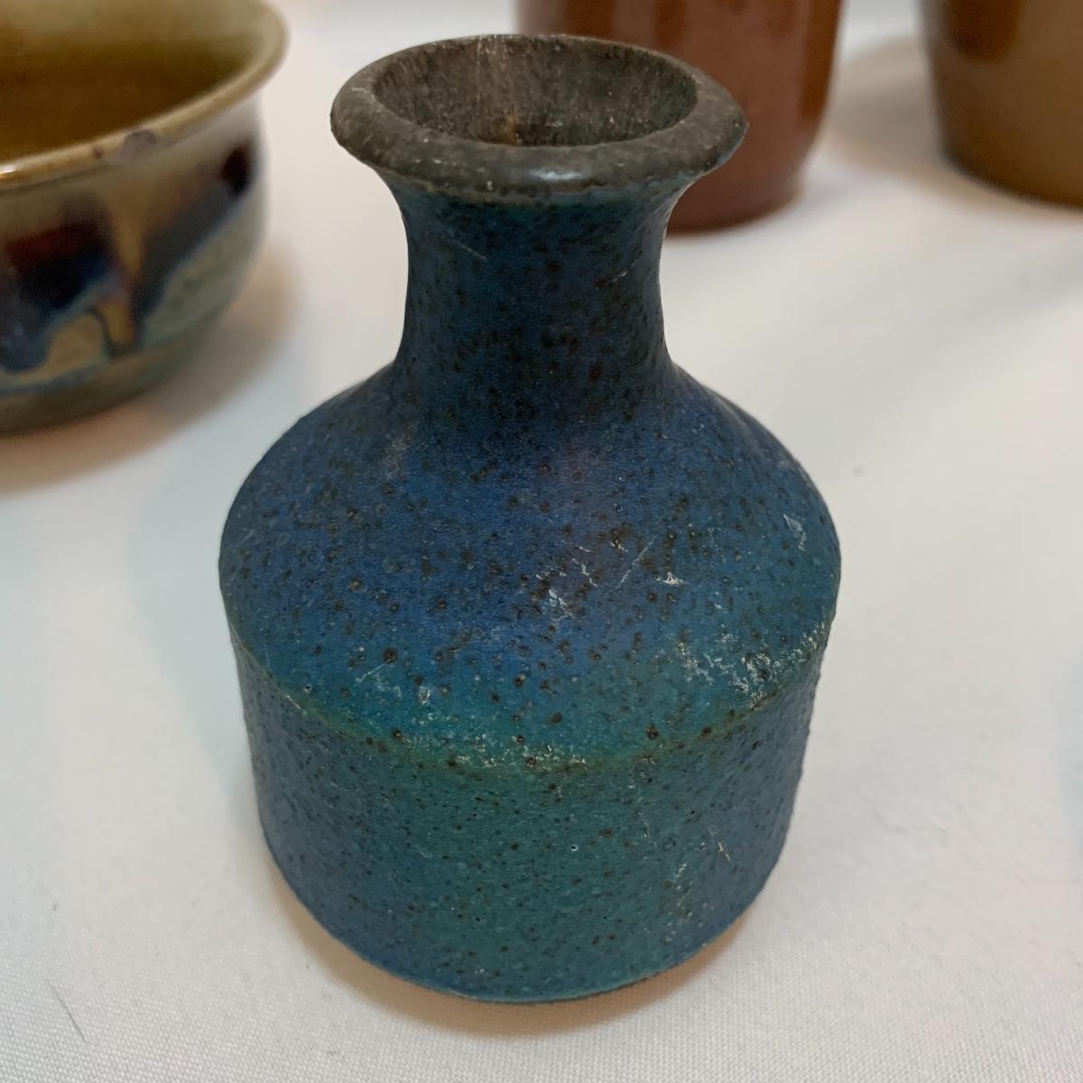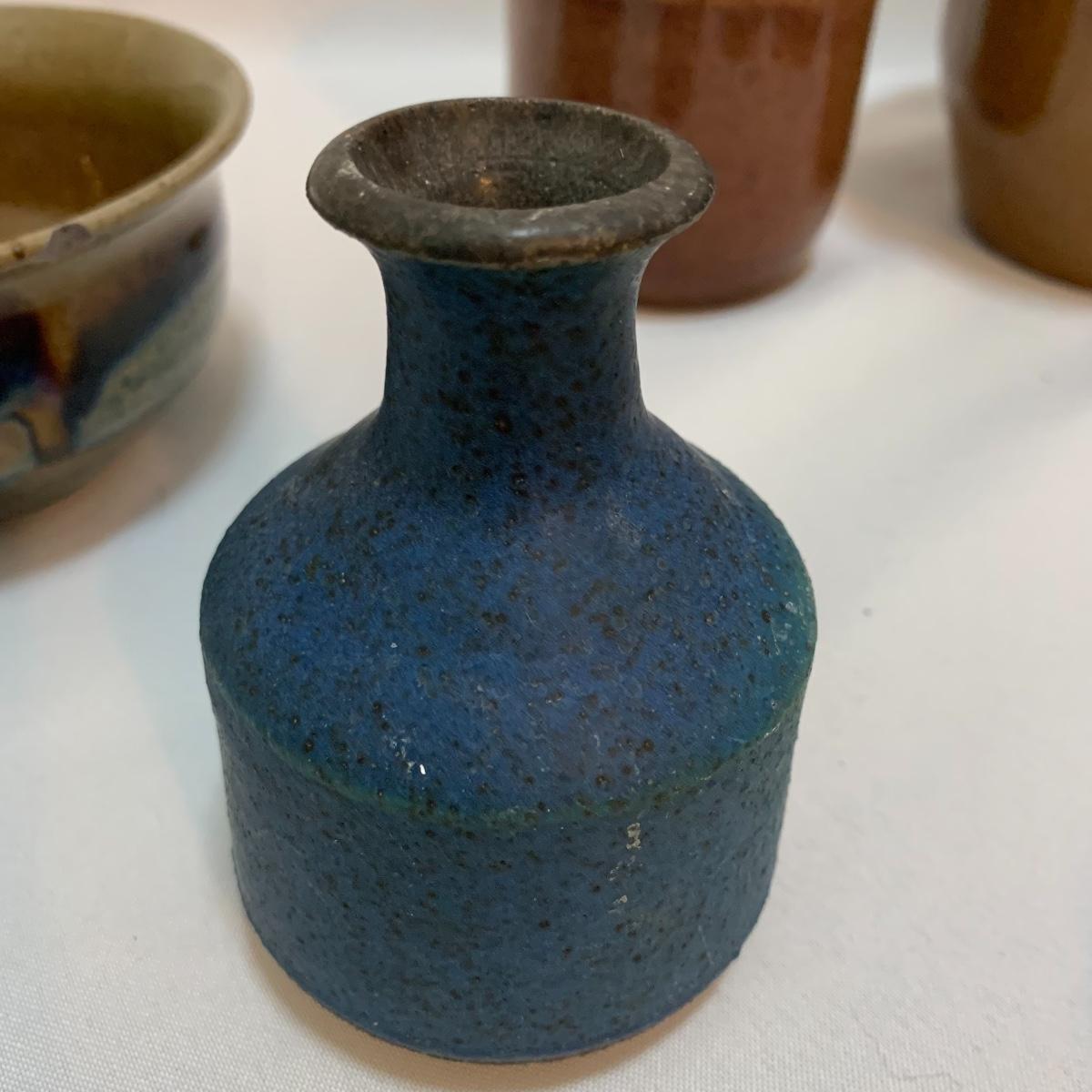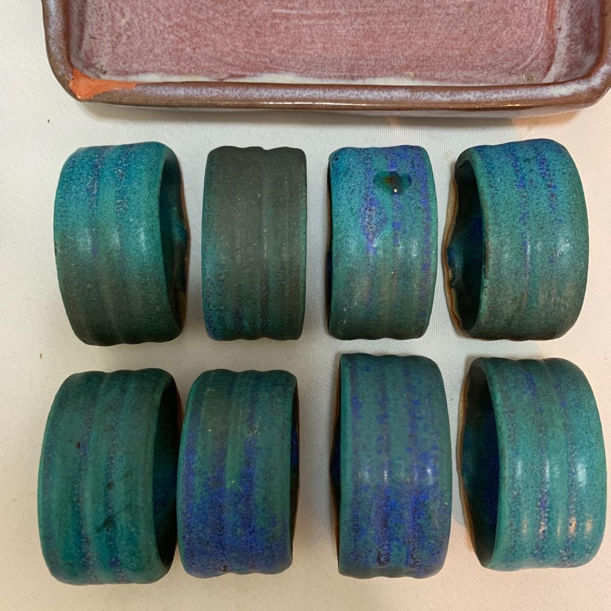 This pottery lot is absolutely GORGEOUS!!! Included are several bowls, a cup, a mug, a covered dish, a vase, a candle holder, a tray, and a stunning set of napkin rings. Take a good look through the pics and you’ll realize how beautiful this pottery is! All pieces are handmade and most are signed. The vase is 7", the largest bowl is 7"x3". As with lots of functional pottery there are a few chips here and there. See pics to determine content and condition.