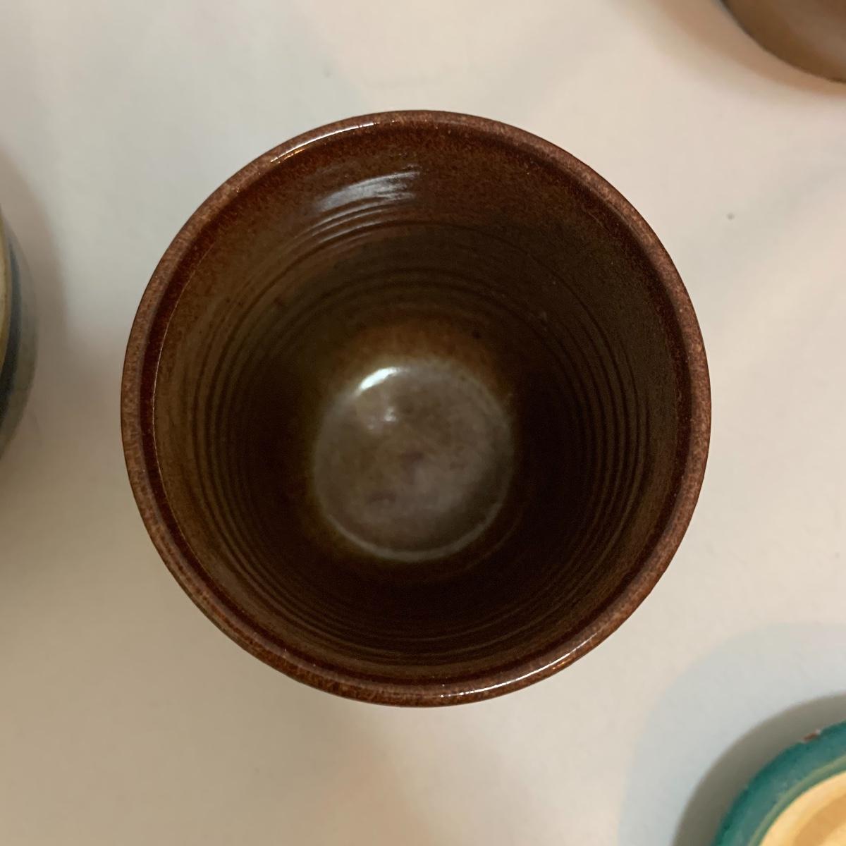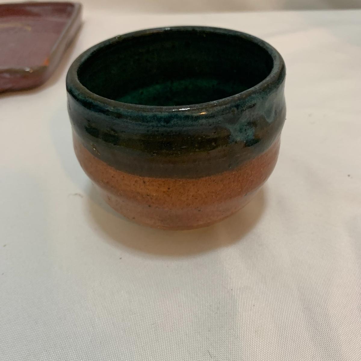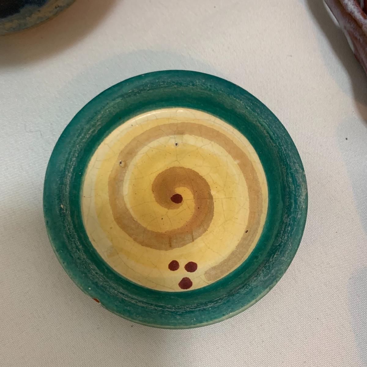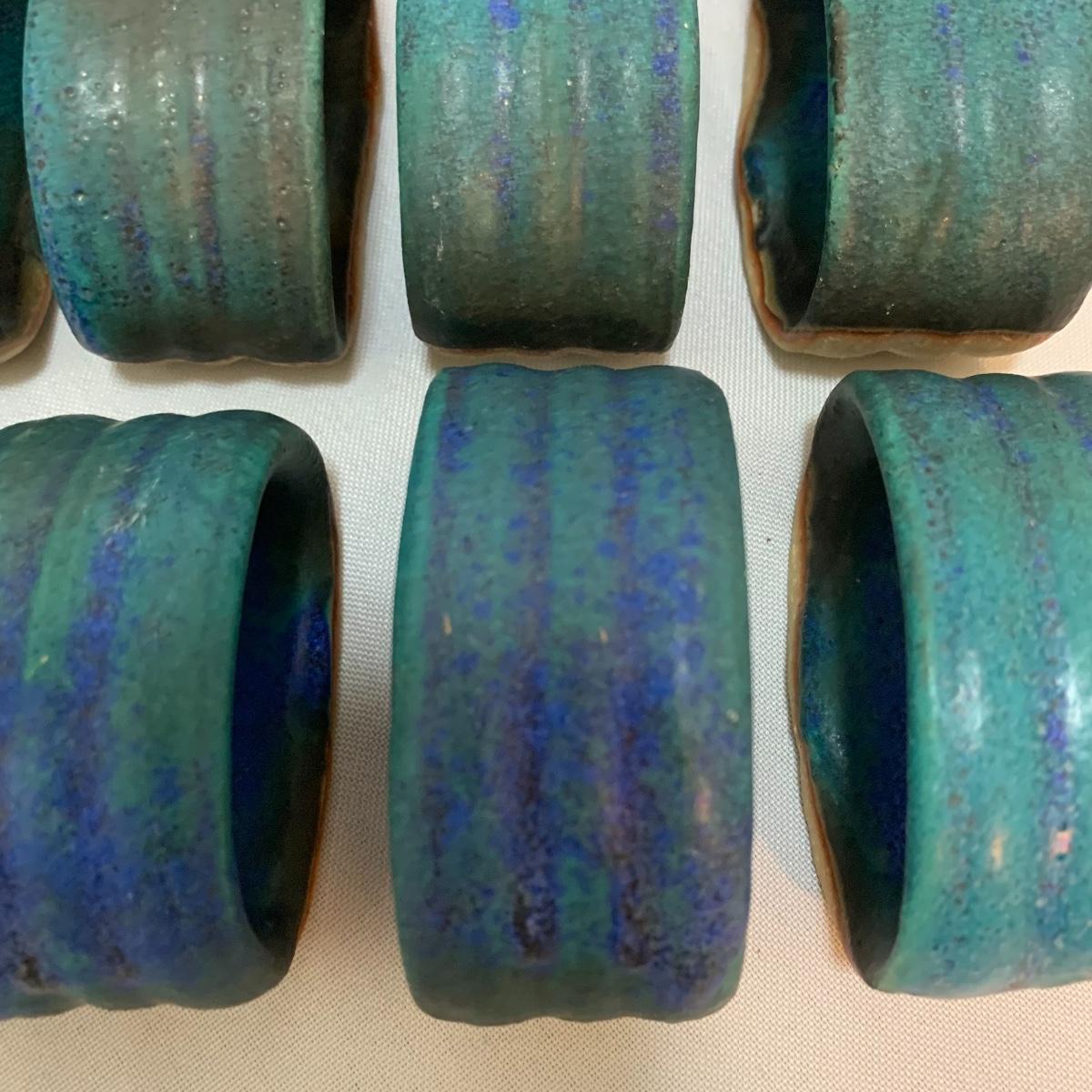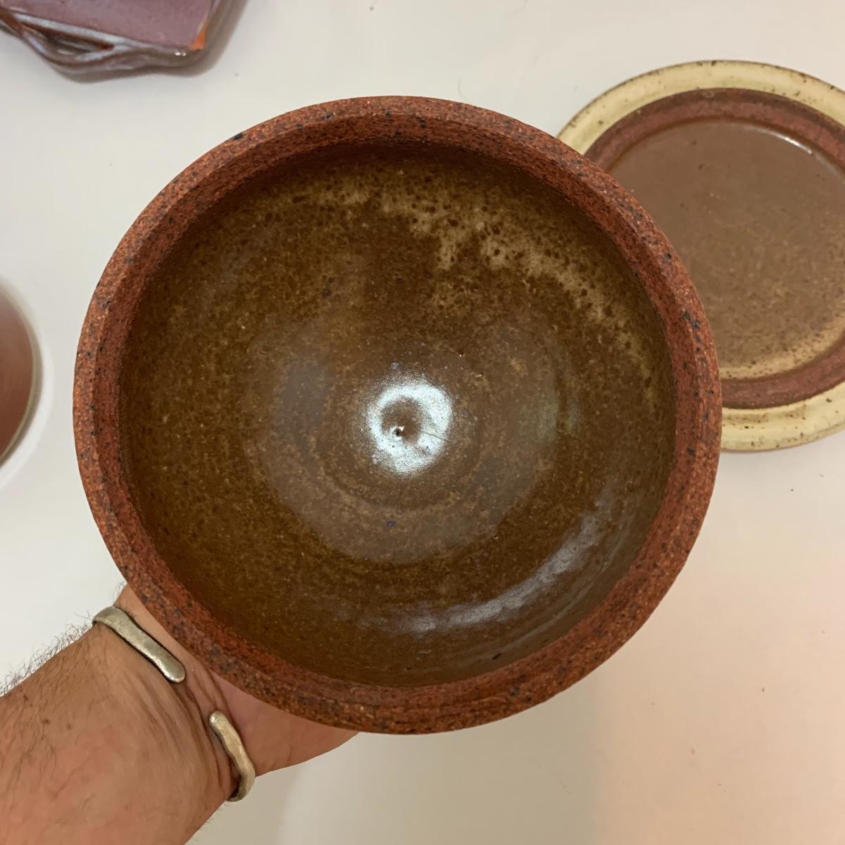 This pottery lot is absolutely GORGEOUS!!! Included are several bowls, a cup, a mug, a covered dish, a vase, a candle holder, a tray, and a stunning set of napkin rings. Take a good look through the pics and you’ll realize how beautiful this pottery is! All pieces are handmade and most are signed. The vase is 7", the largest bowl is 7"x3". As with lots of functional pottery there are a few chips here and there. See pics to determine content and condition.