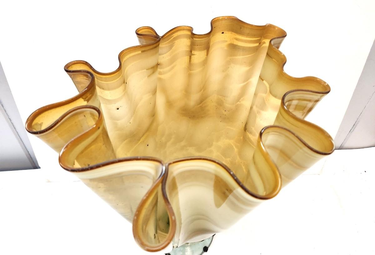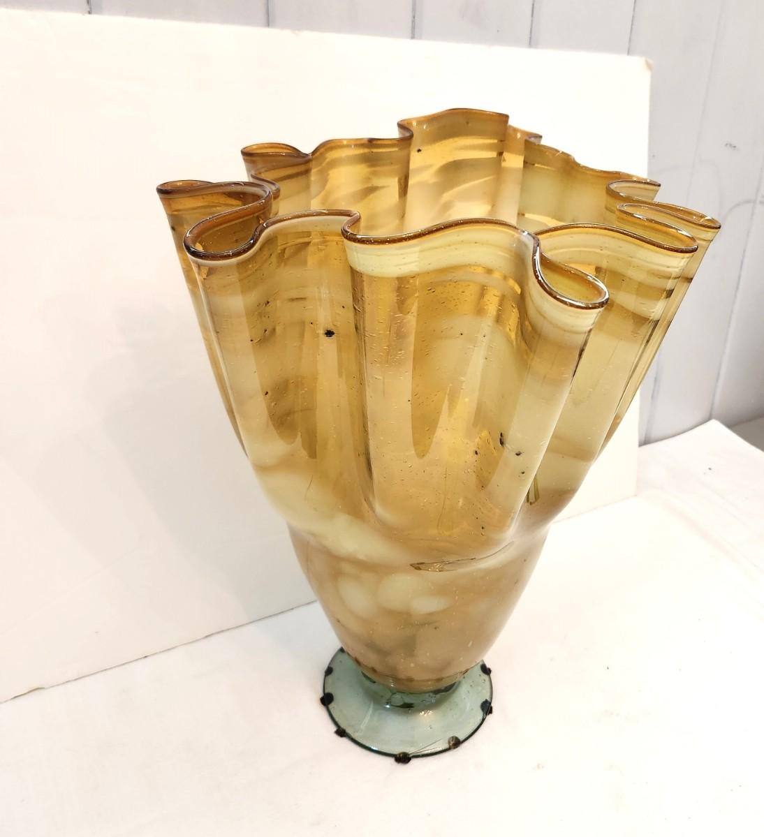 Large Art Glass "Handkerchief" Vase, hand blown, no chips. 17.5" tall. Good condition. Heavy colored glass with dark inclusions.