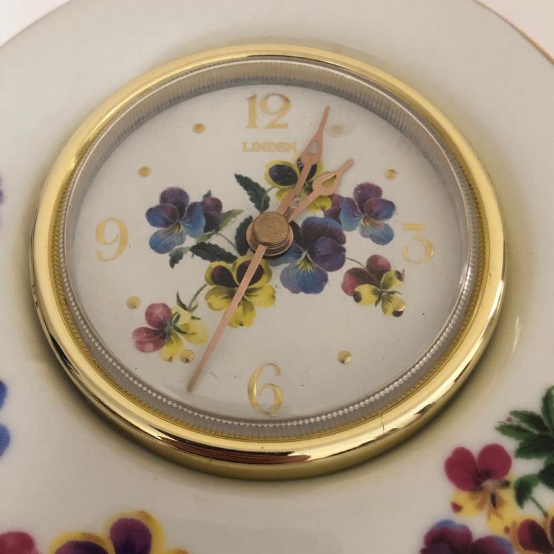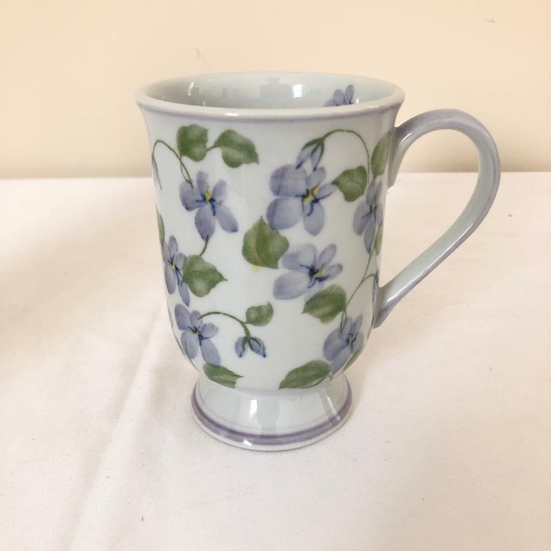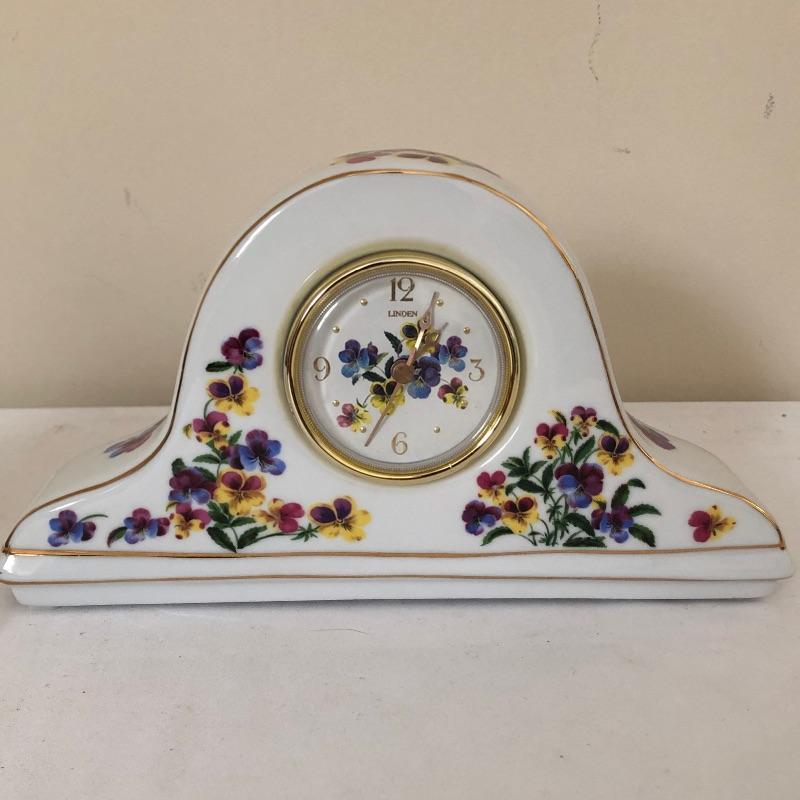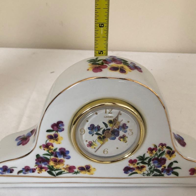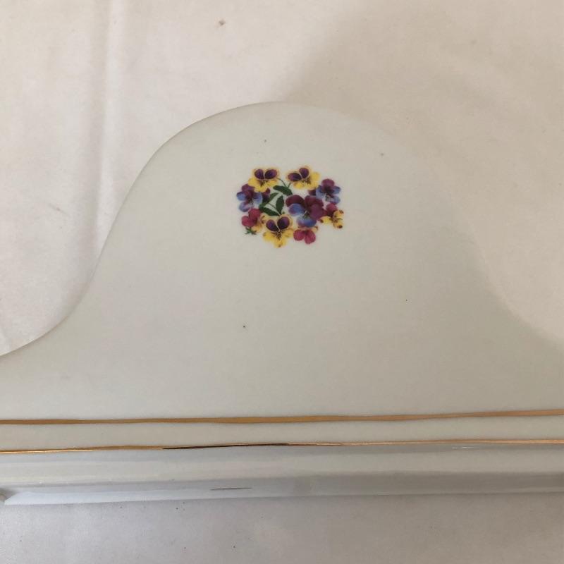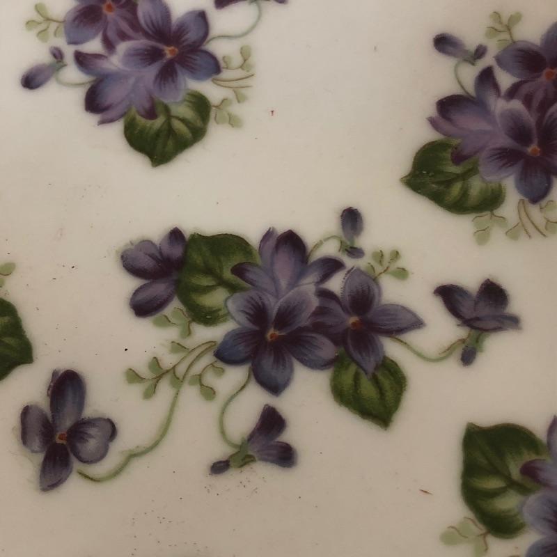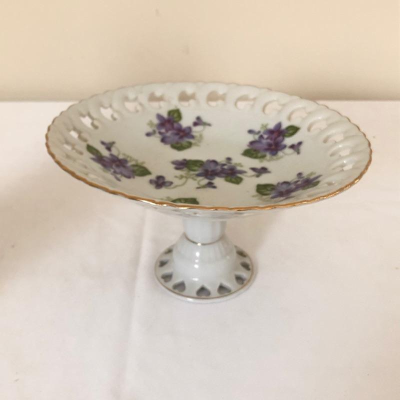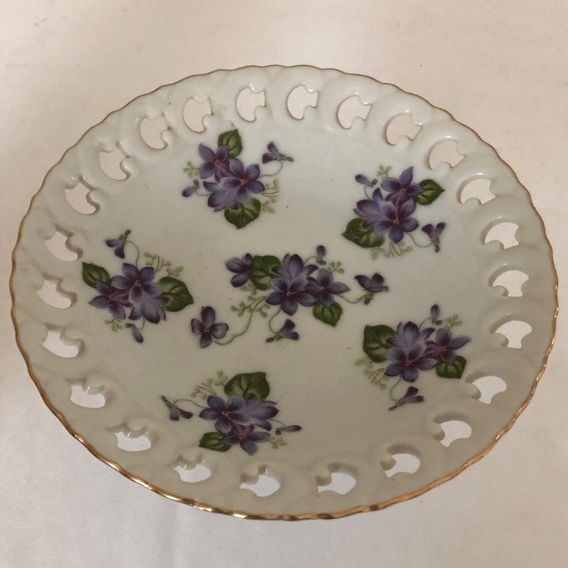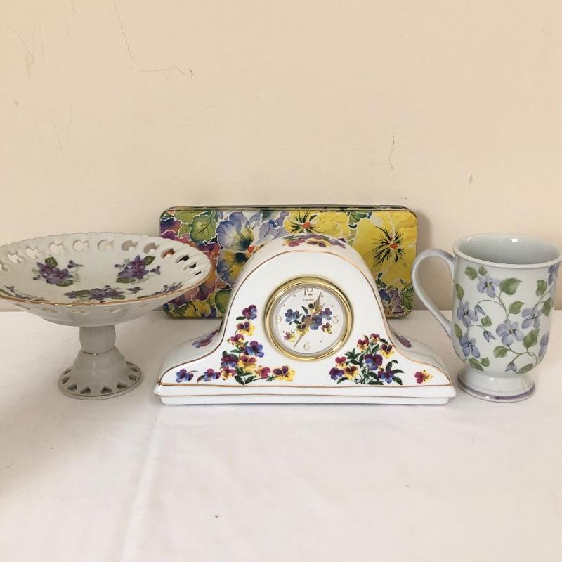 This assortment of perfectly pretty purple floral pieces are adorable. The cake/candy stand is Lefton white China with purple flowers and a gilt trim, measuring 7” diameter x 4” tall. Lot also includes a battery operated (not tested) porcelain mantle clock, a china cup and a tin. Shipping available