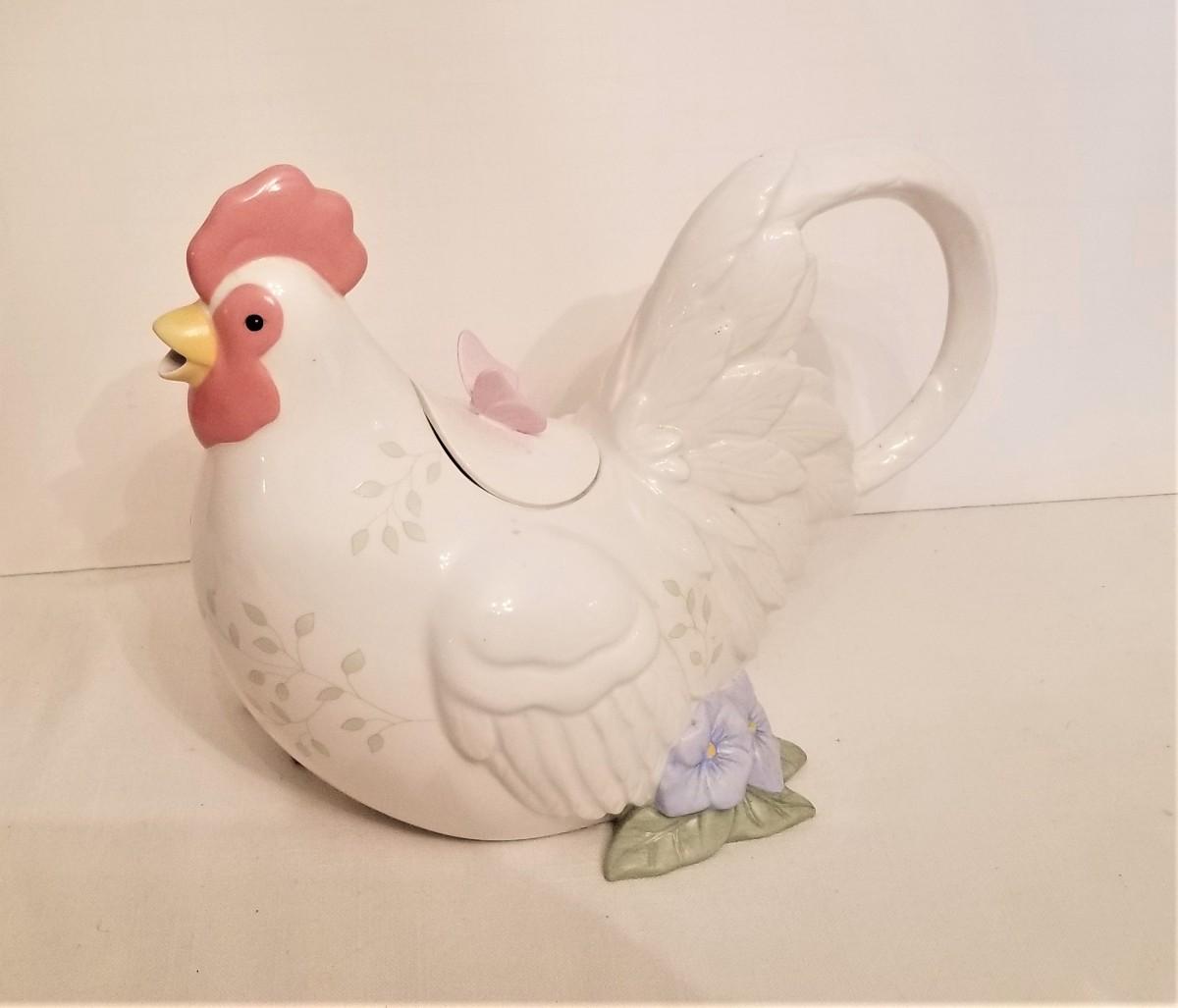 Teapot in the form of a rooster - in the LENOX "Butterfly Meadow" pattern. Good condition. 9.25" across, 8" tall.