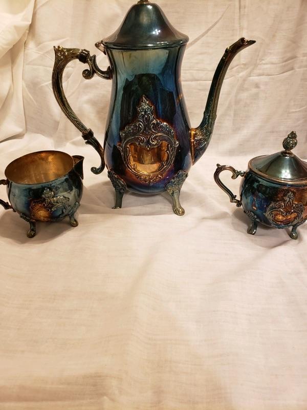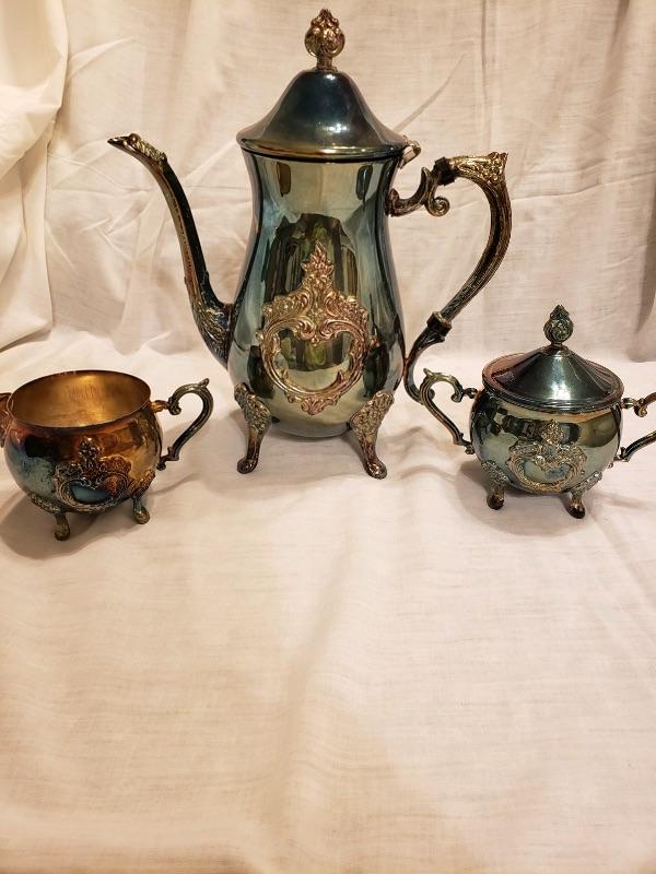LOT #53. Vintage Leonard Silverplate 3-piece coffee service. Coffee pot, covered sugar and creamer