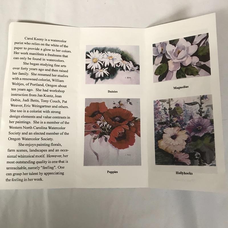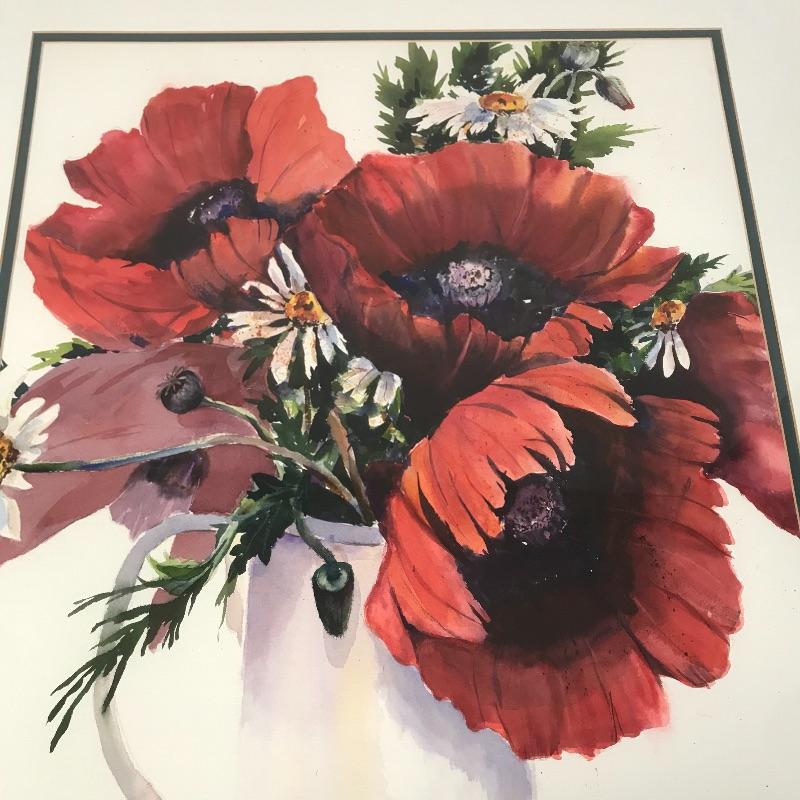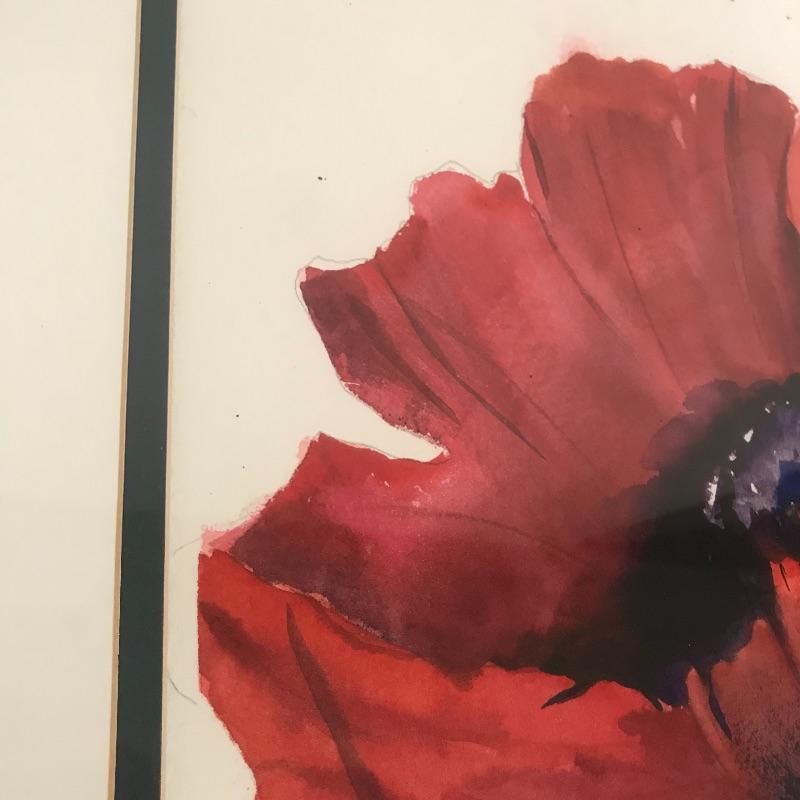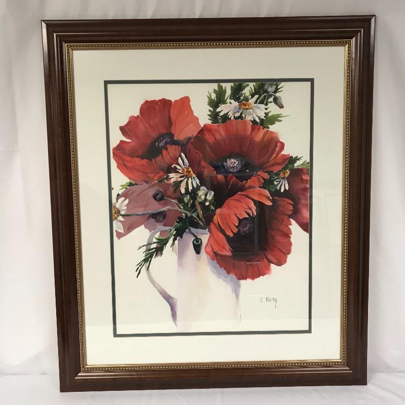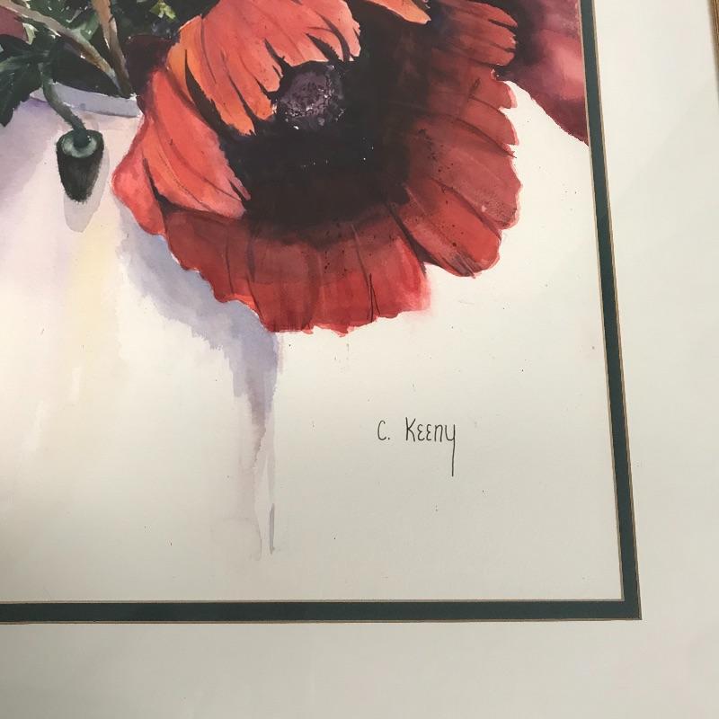 Large framed “Poppies” watercolor by Candler artist C. Keeny. Frame is high quality from wood with complementary matting and art behind glass. Art has an imprint of some sort of stamp in the lower left corner. Likely from the watercolor paper company. See pix. This is a large piece. Frame measures 36” x 42”.