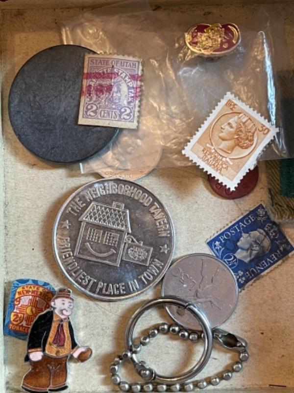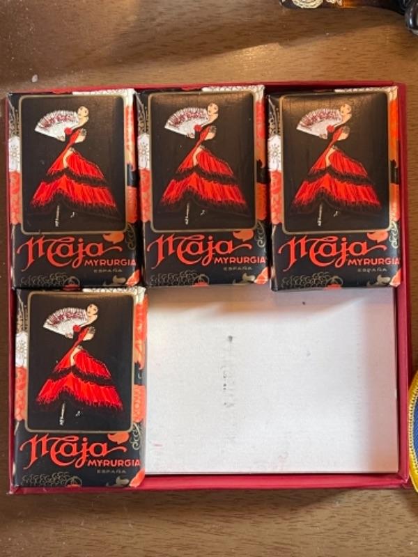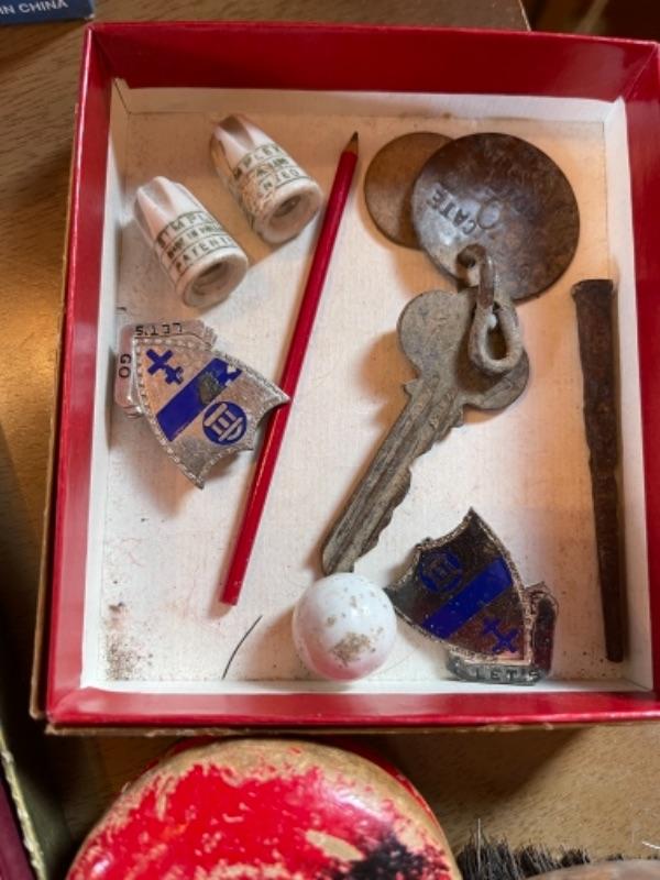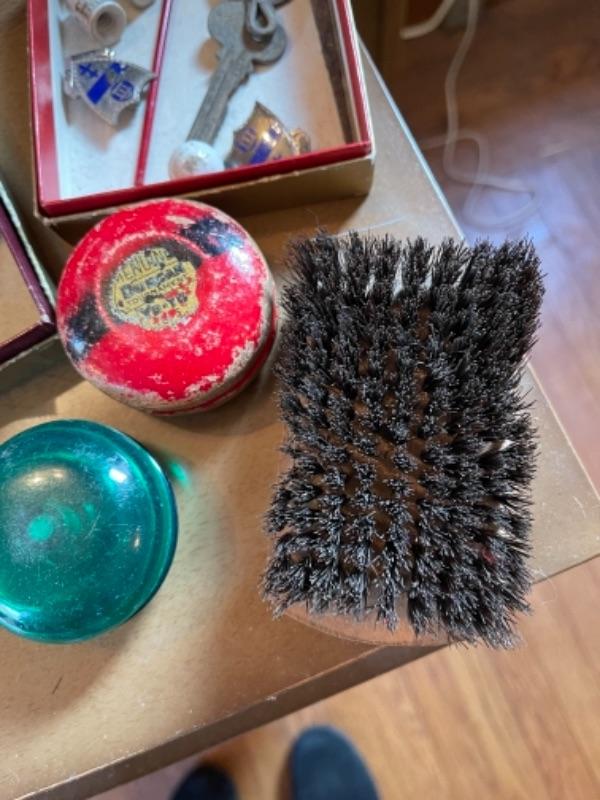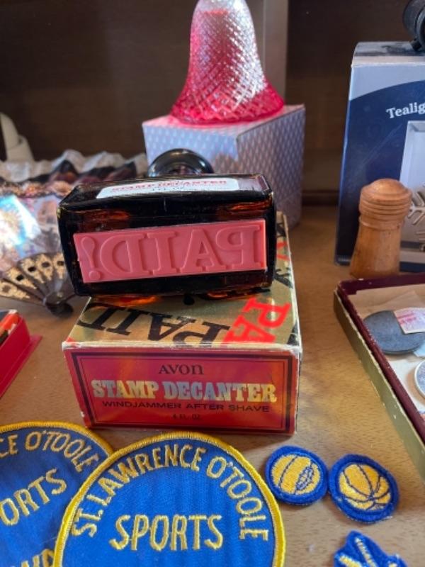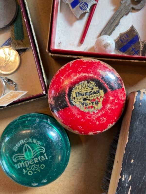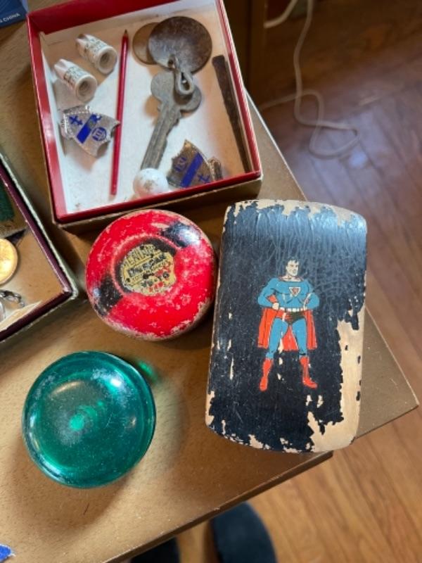 Lot 54. Lot of Avon perfumes, Maja soap bars, two vintage yo-yos, badges, Superman brush, etc.--Was $30 - - Now $18