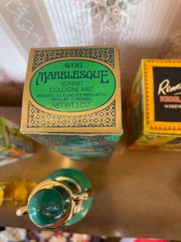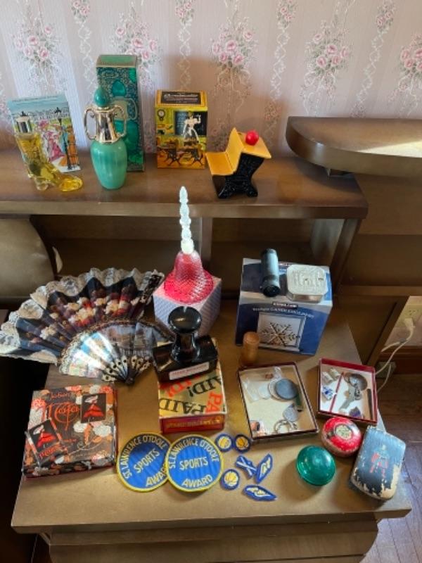 Lot 54. Lot of Avon perfumes, Maja soap bars, two vintage yo-yos, badges, Superman brush, etc.--$18