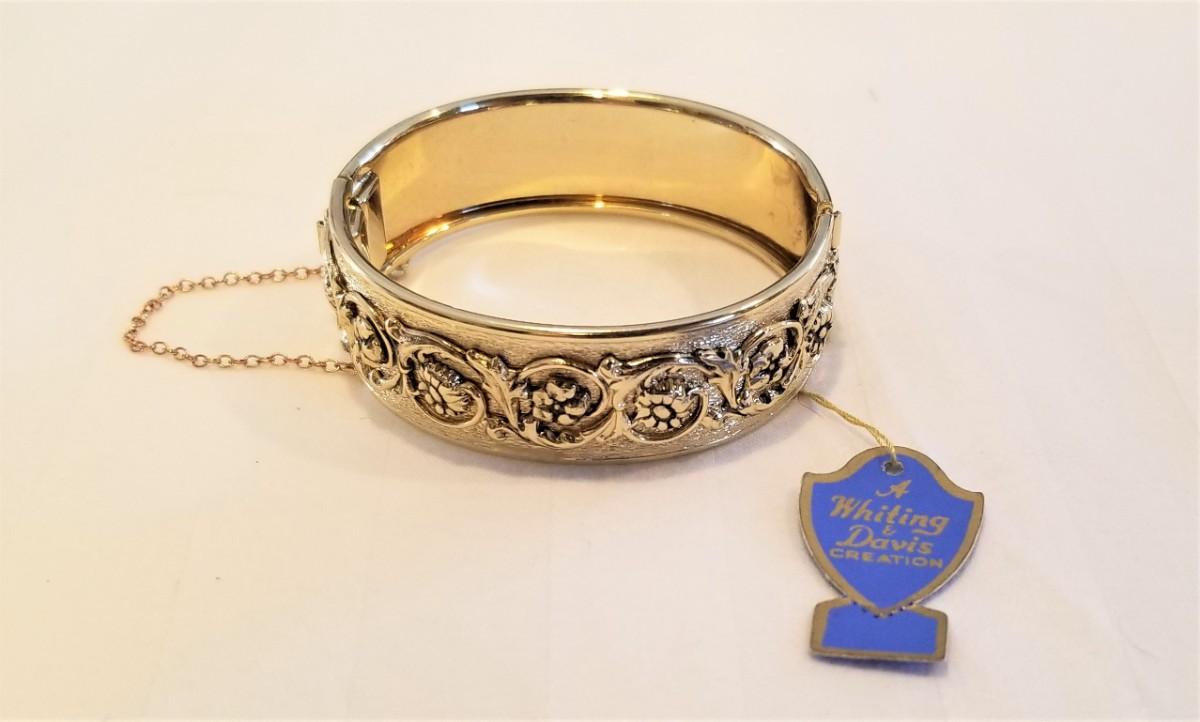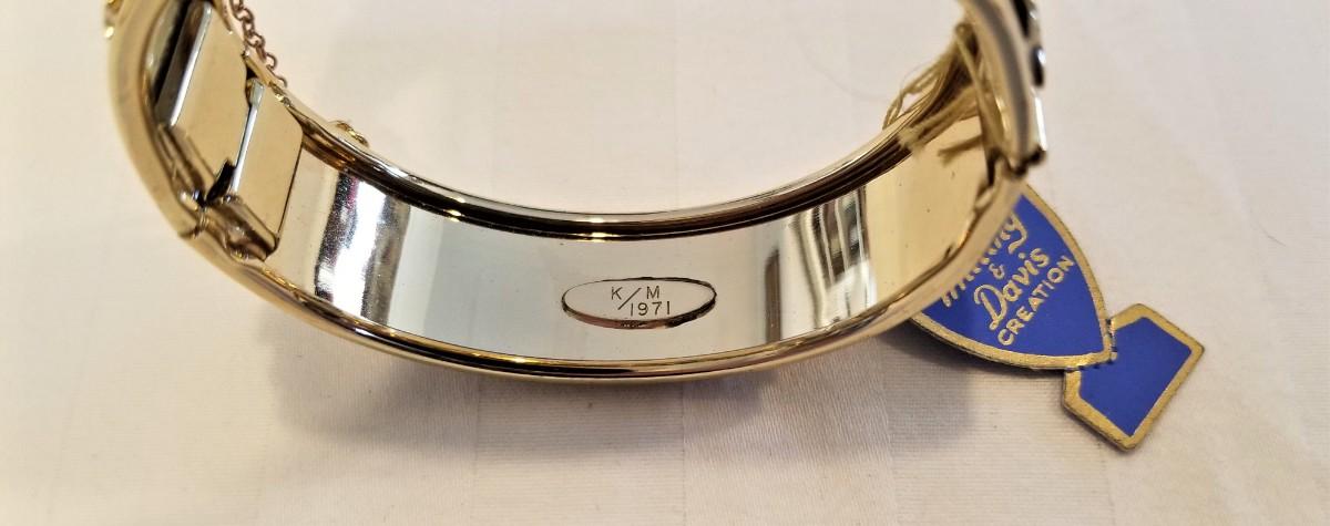 Still has the original tag - Whiting & Davis hinged Bangle Bracelet with safety chain - looks like new - marked K/M 1971. Definitely a krewe favor - Based on the floral motif I think this may be a from the Krewe of Mystery - but it could also be Knights of Momus OR from the Moslem organization (now defunct). Whiting & Davis jewelry is high quality and would be collectible on its own. Opening is 2.5 inches across. A very nice piece.