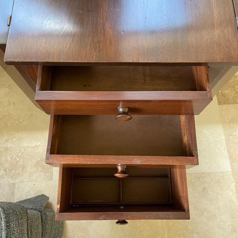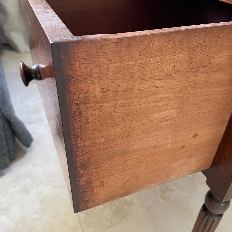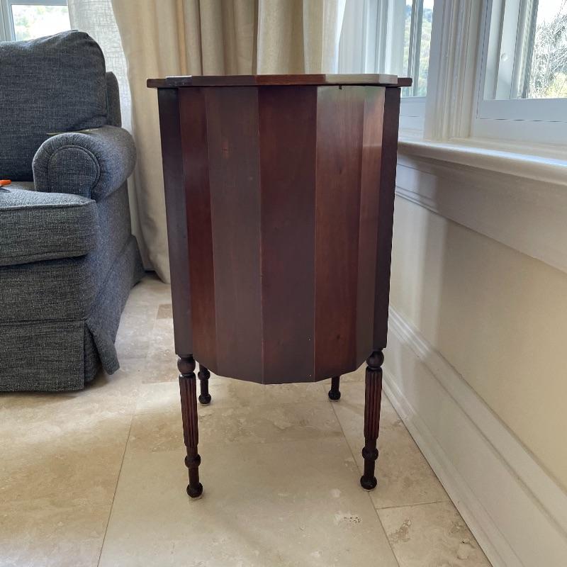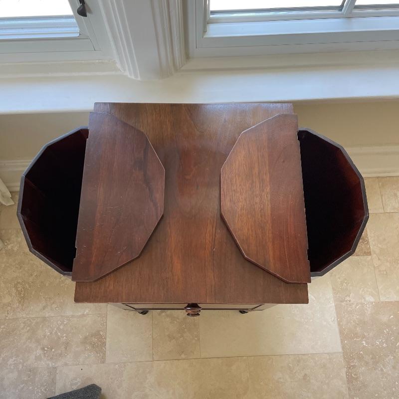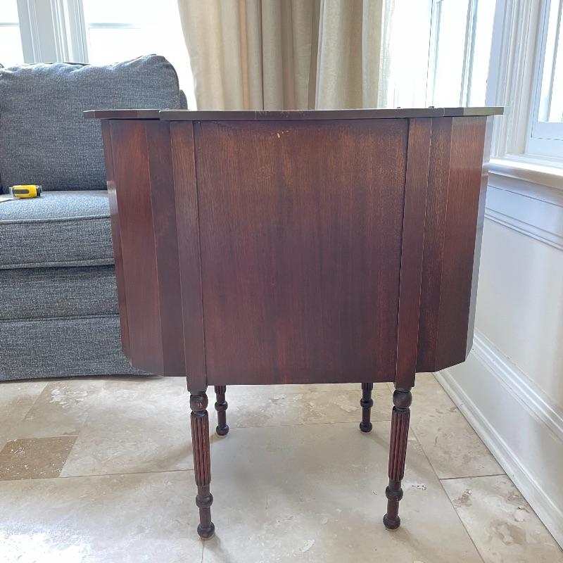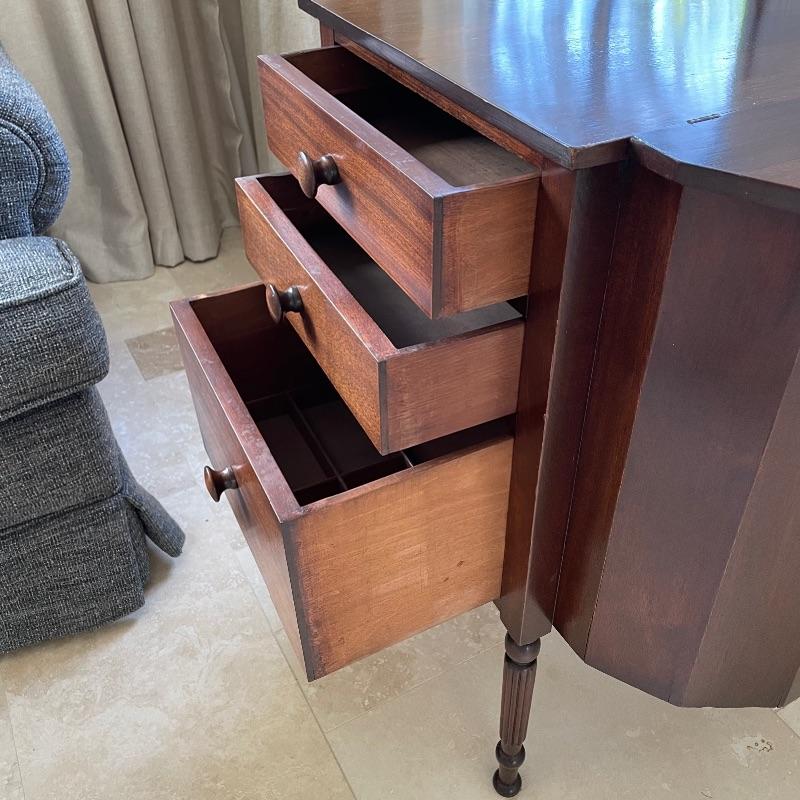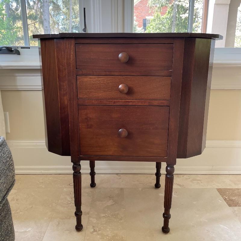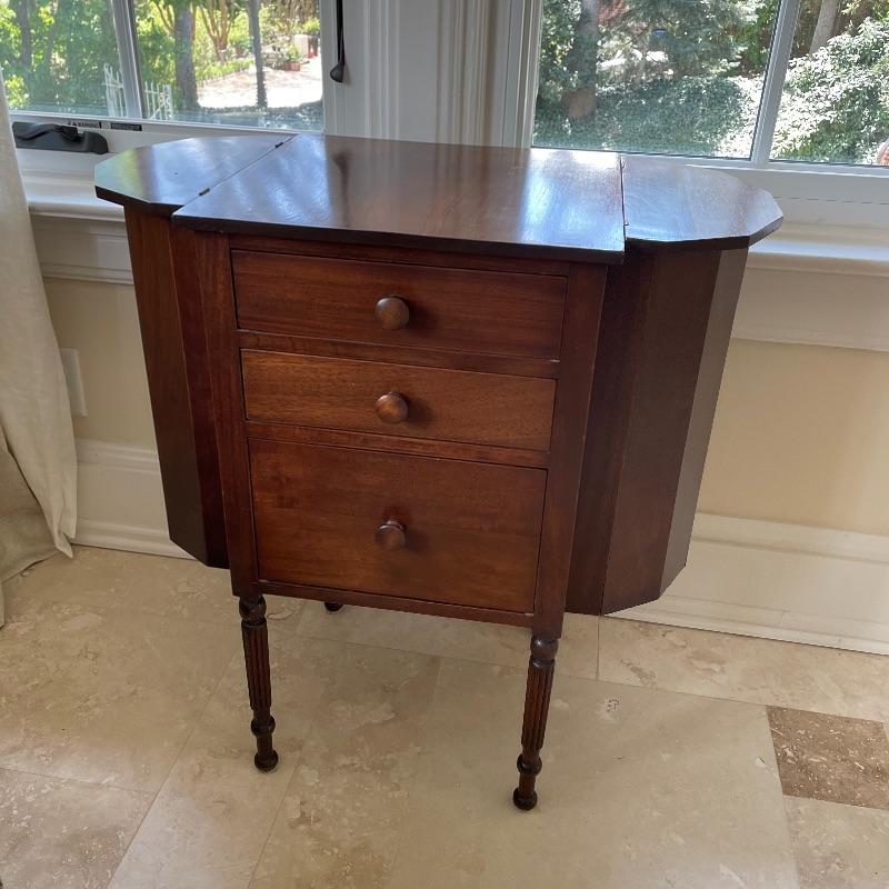 Beauty and storage, what could be better!? Lot features a very nice Martha Washington sewing cabinet with three drawers. This cabinet has a very lovely medium-dark wood stain and nicely carved legs. This piece measures approximately 27” x 15” x 28.25”. Local pick up only.