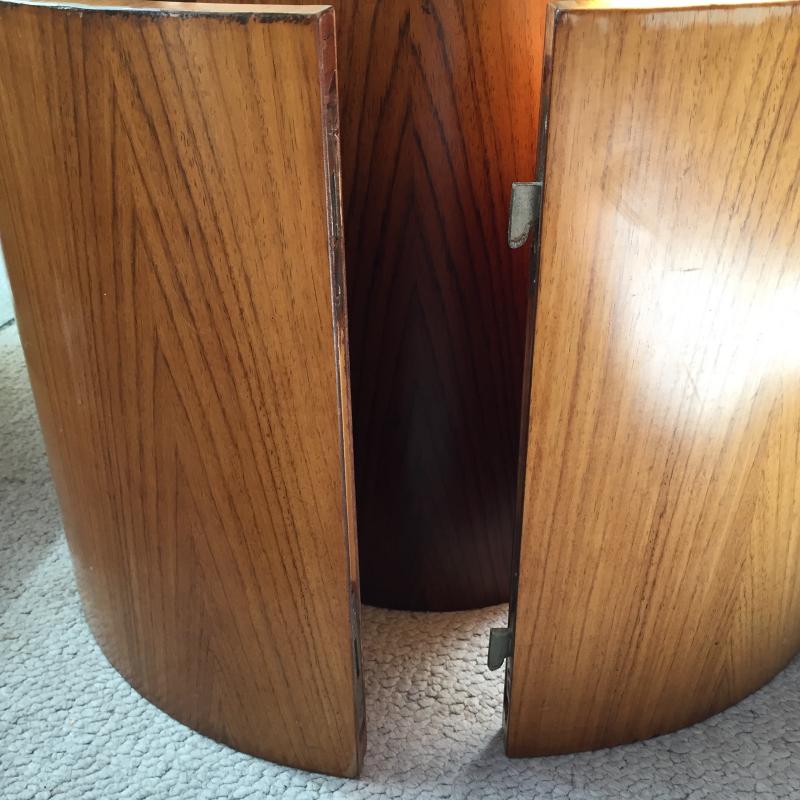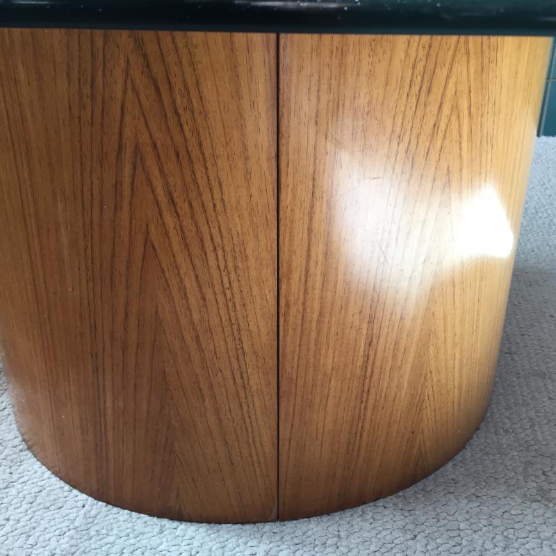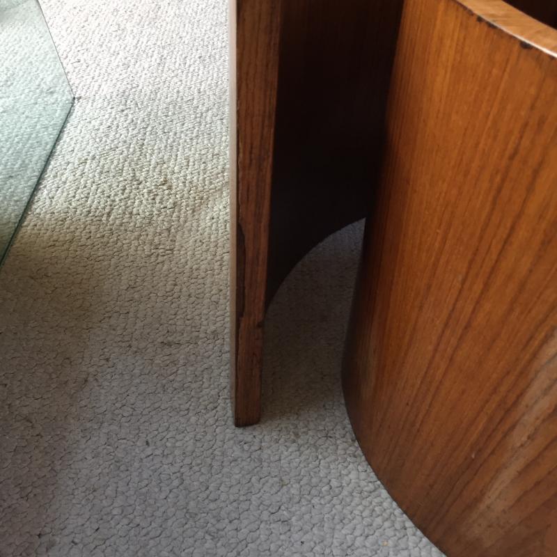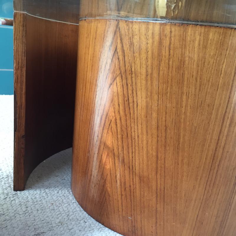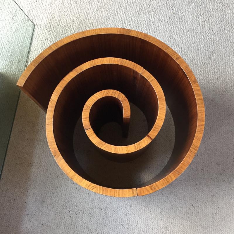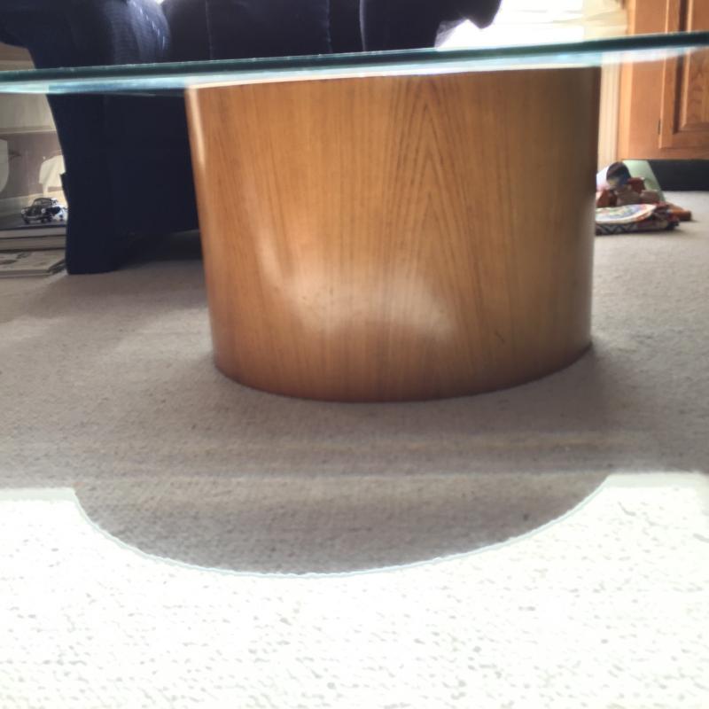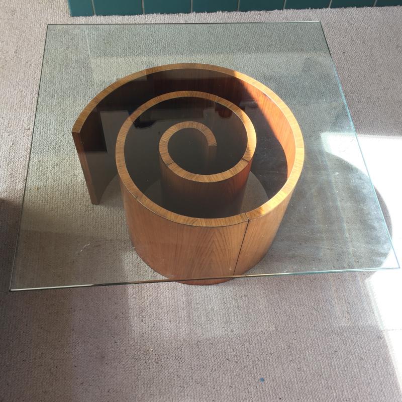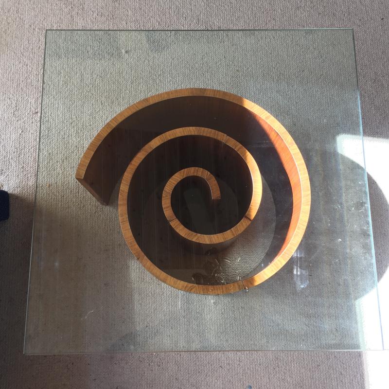 Stunning Modern Coffee Table. Make a statement with this piece! Glass top is removable. Laminated Wood base swirls into place to make a modern base. Interlocking piece keep swirl strong and steady. Base has a piece of laminate loose-See pictures. Table Measures 33” x 33” x 14”. Local Pickup Only