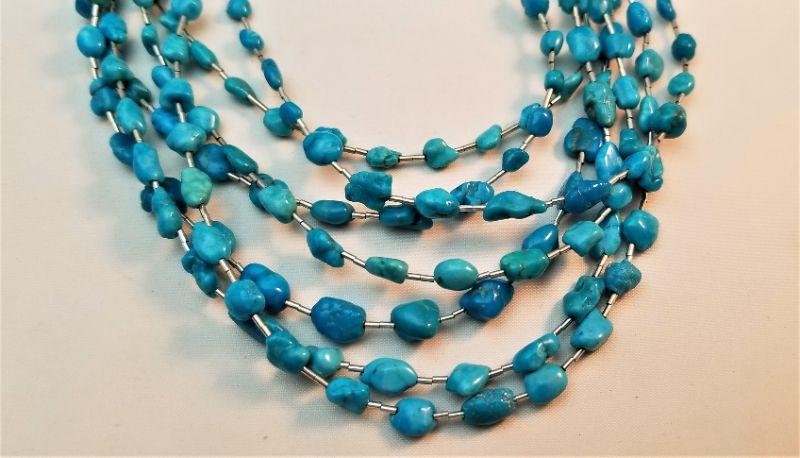 Very attractive multi strand (7 strands) natural turquoise necklace with sterling clasp and spacers. Measures about 19 inches long, but can adjust longer.