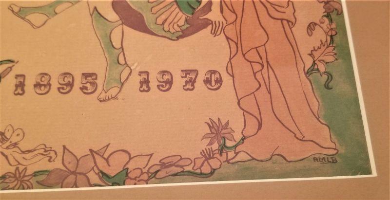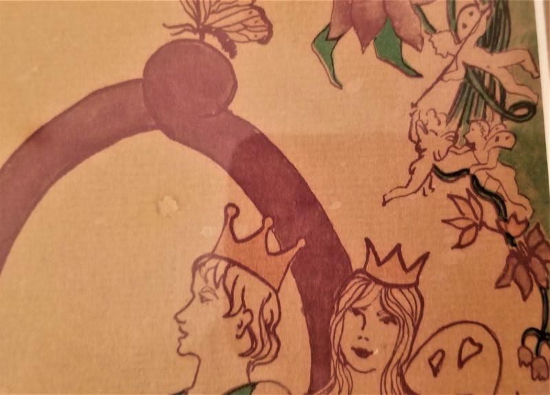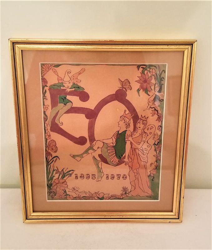 This piece has been framed so I am not sure of this is an invitation or a ball program - either way, it was done for the 75th anniversary of the Elves of Oberon. Charming illustration - please check all photos - Measures about 10" x 11".