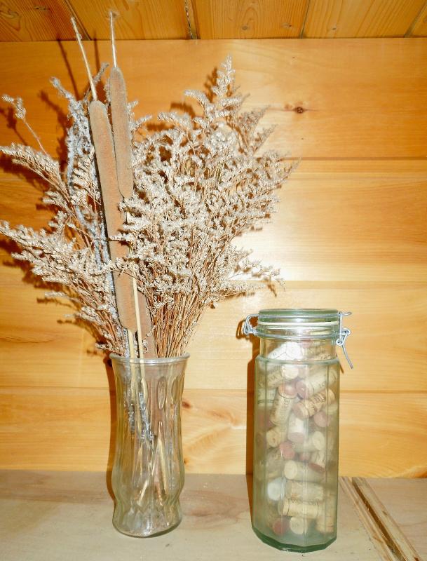 Sealed metal latch glass storage container full of wine corks and glass vase filled with dried grass and cat tails for decoration. Tallest container is 11".