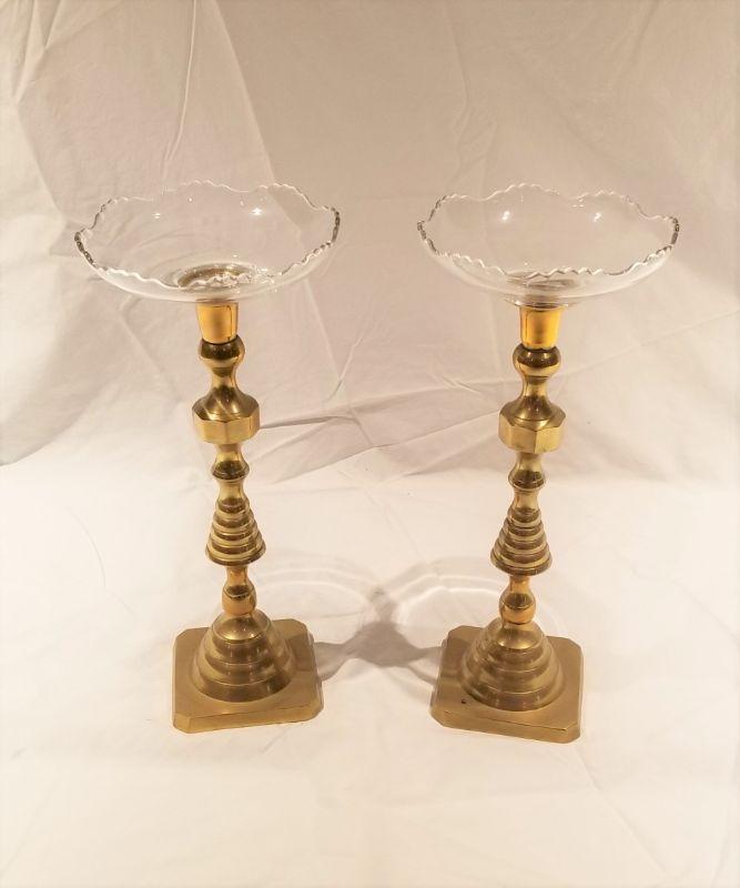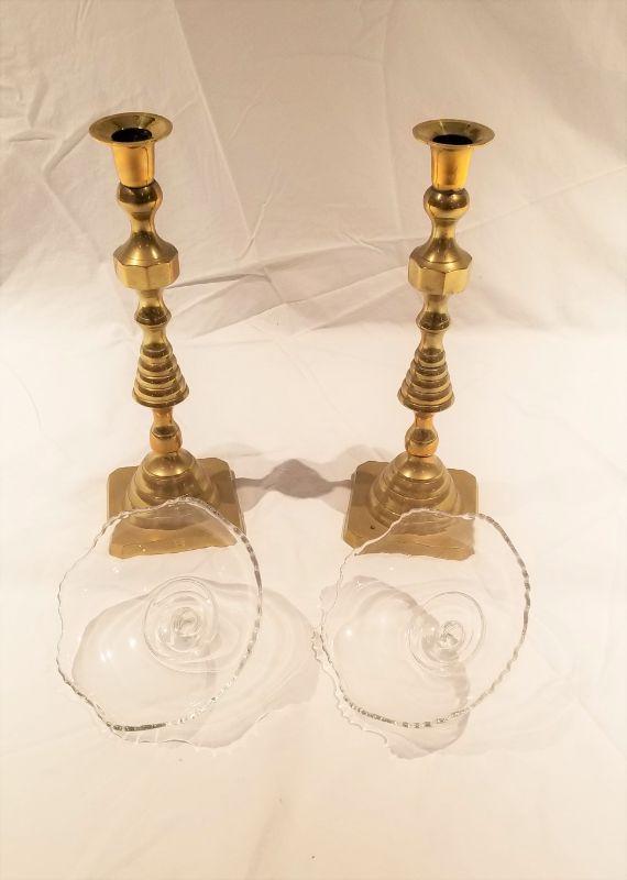 Nice Vintage pair of brass candlesticks that have glass inserts you can use to turn them into epergnes. Each stands 13 1/4" tall, Glass insert is 6" across. Price is for the pair. Nice condition.