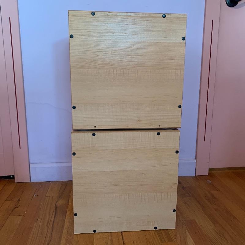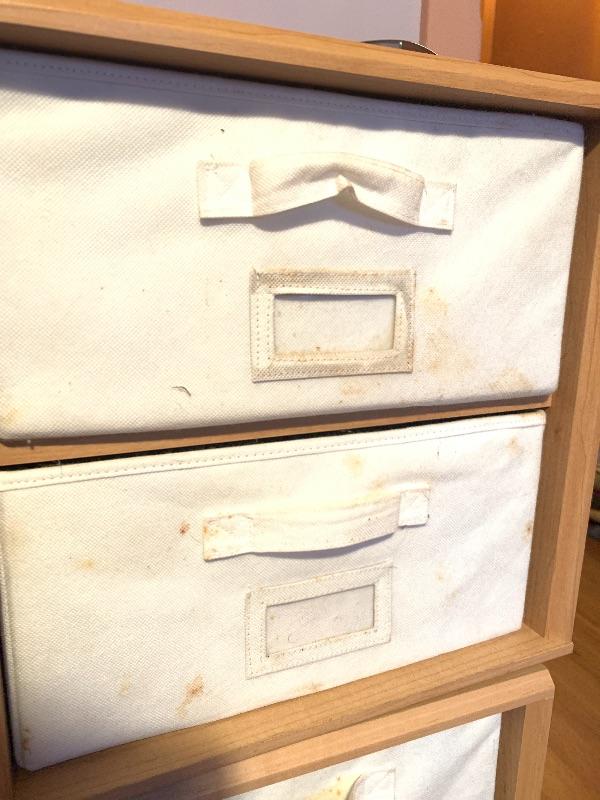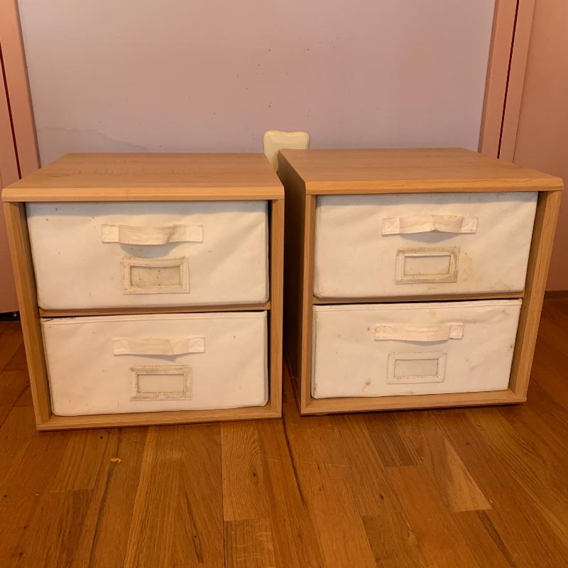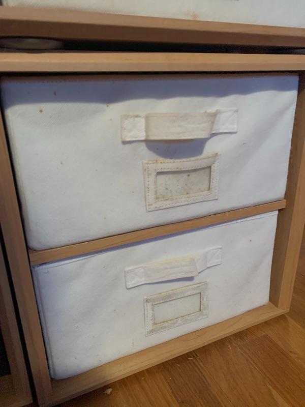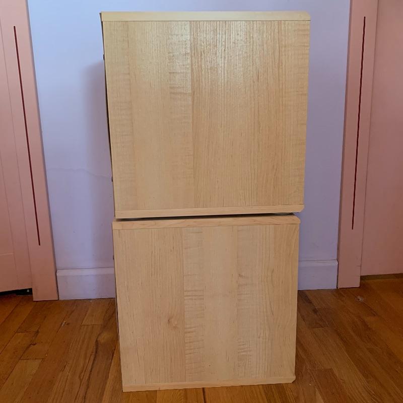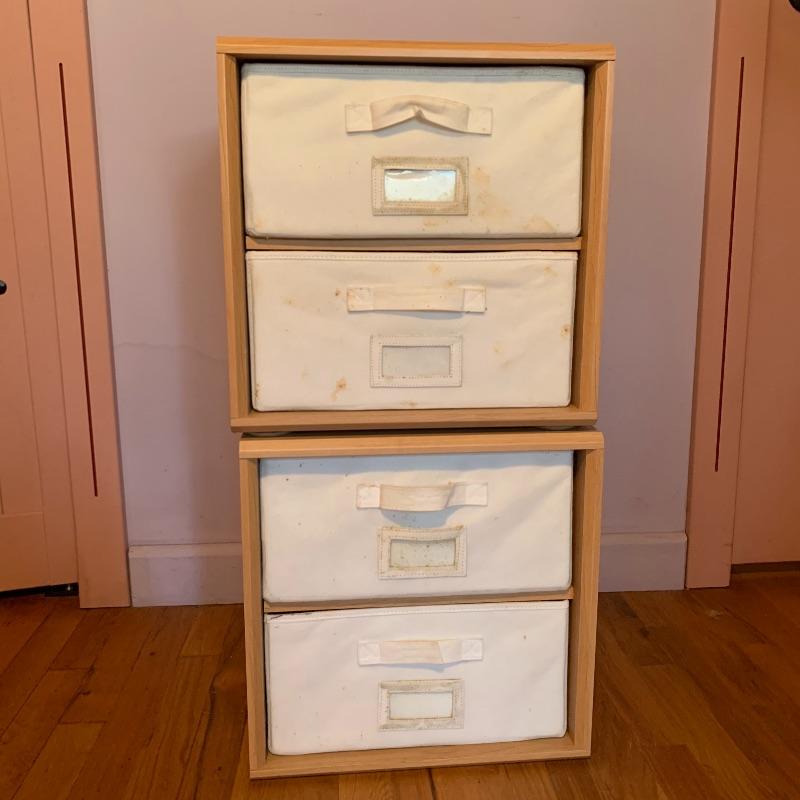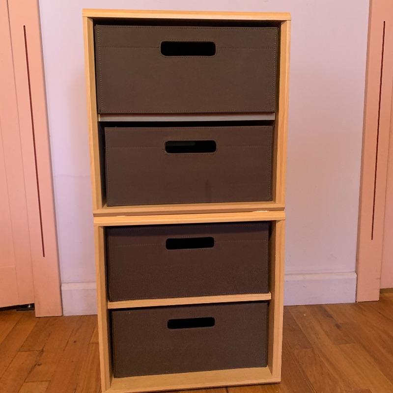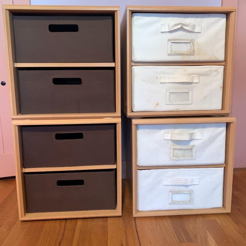 This lot includes 4 manufactured wood storage cubes with fabric bins. The wood is light but sturdy. One set of bins are connected with removable brackets while the other set does not (see pictures). The bins can be pulled completely out but the fabric on the white bins are stained. There is also a little discoloration on the top of one bin. The stacked bins each measure about 15in x 15in x14.5”. Local pick up only.