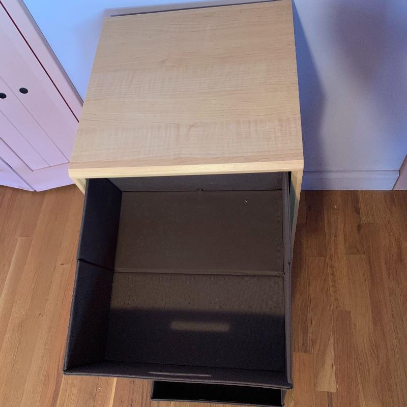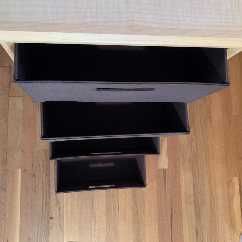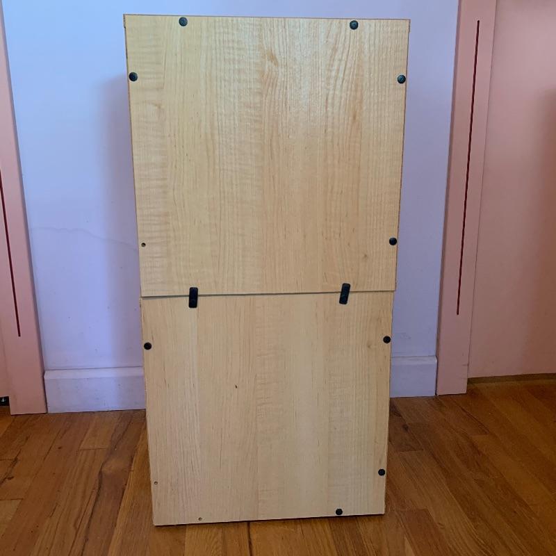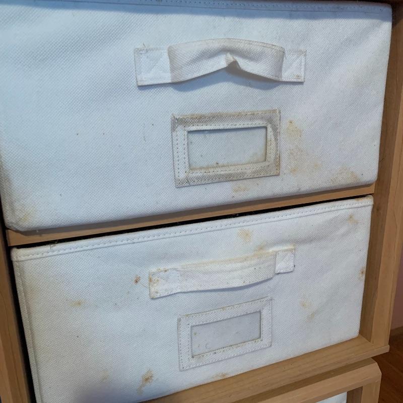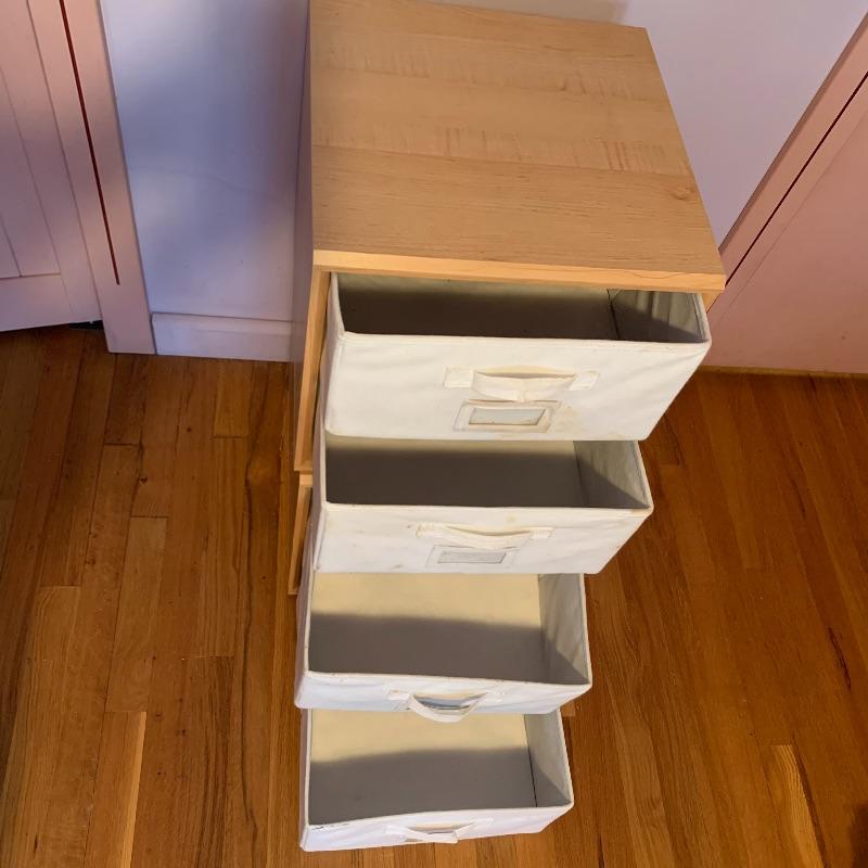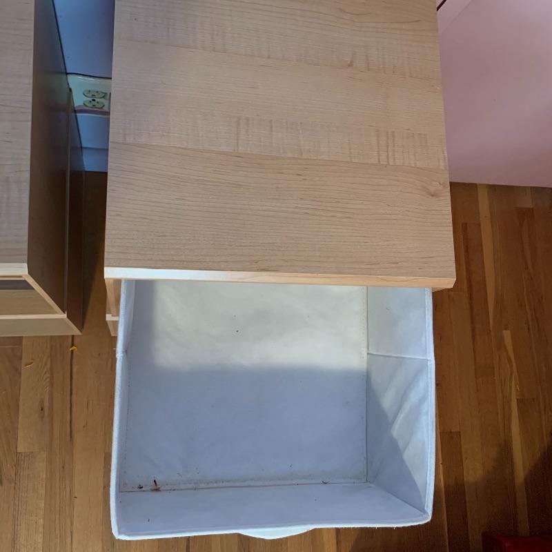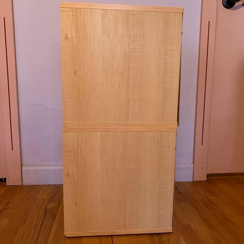 This lot includes 4 manufactured wood storage cubes with fabric bins. The wood is light but sturdy. One set of bins are connected with removable brackets while the other set does not (see pictures). The bins can be pulled completely out but the fabric on the white bins are stained. There is also a little discoloration on the top of one bin. The stacked bins each measure about 15in x 15in x14.5”. Local pick up only.