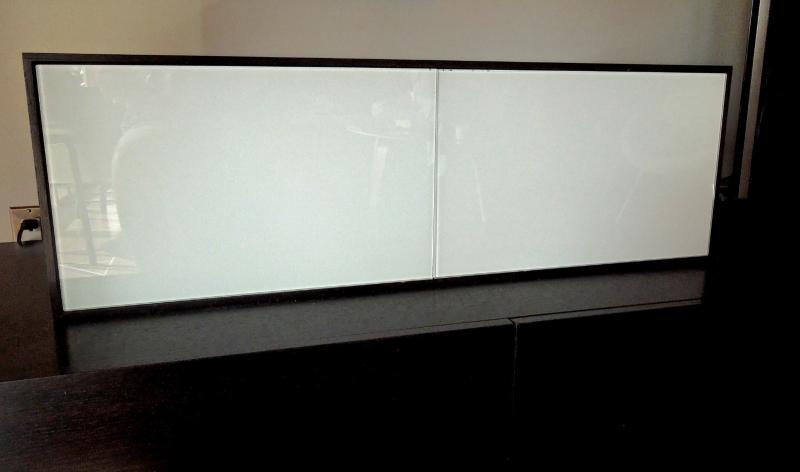 Measures 39" x 18 x 12". Rift sawn oak finished in dark chocolate stain. Designed for media storage by Paul Schulman Design. Gorgeous complementary frosted glass doors with magnetic push latch. Coordinates with media console being sold separately Lot 55. Has been drilled for media compatibility.