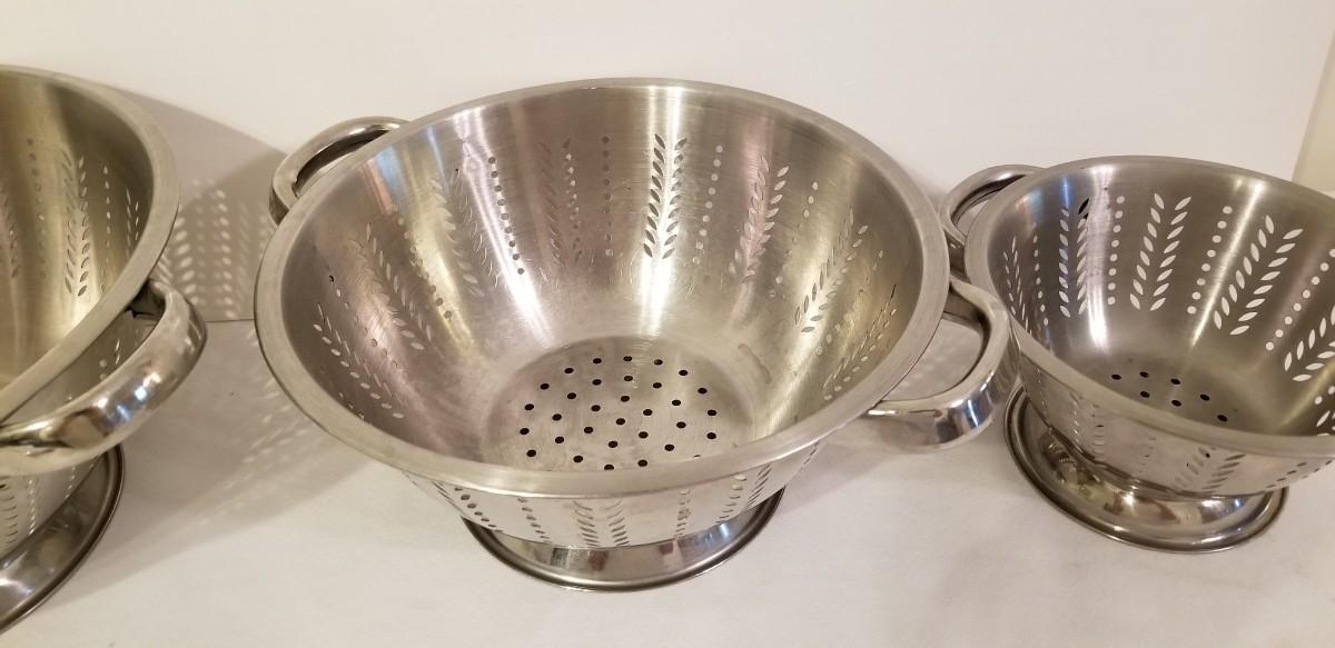 You get all you see here - three graduated stainless steel colanders - good condition. The largest is 13" across handle to handle - 5" tall.