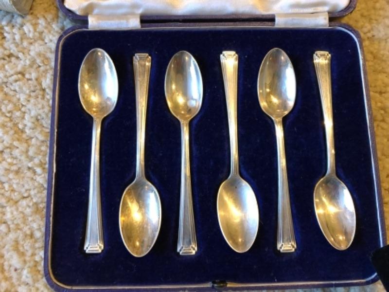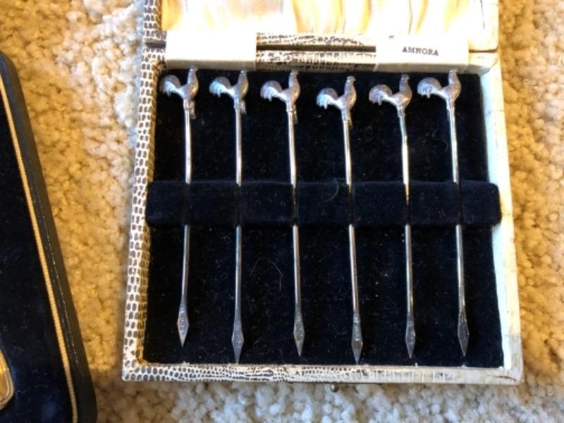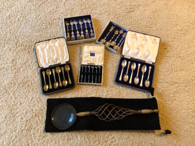 Lot 54. Six demitasse spoons in case (Mappan and Webb Ltd.), sterling and silver plate, demitasse and hors d’oeuvres spoons and forks; large fancy magnifying glass in velvet case, etc.---WAS $125““NOW $62.50