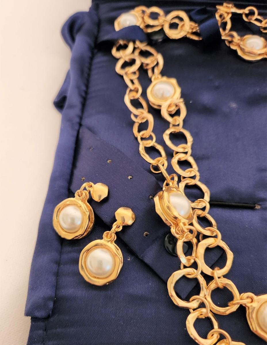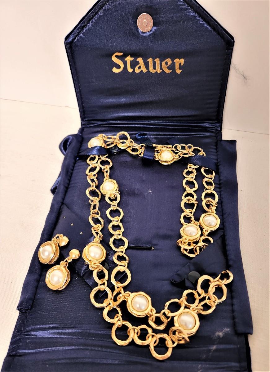 From STAUER - gold tone necklace and earring "pearl" set - Stauer is known for its quality costume jewelry. Double rope necklace is 20" long, earrings are pierced (they are 1.5" long) Good condition.