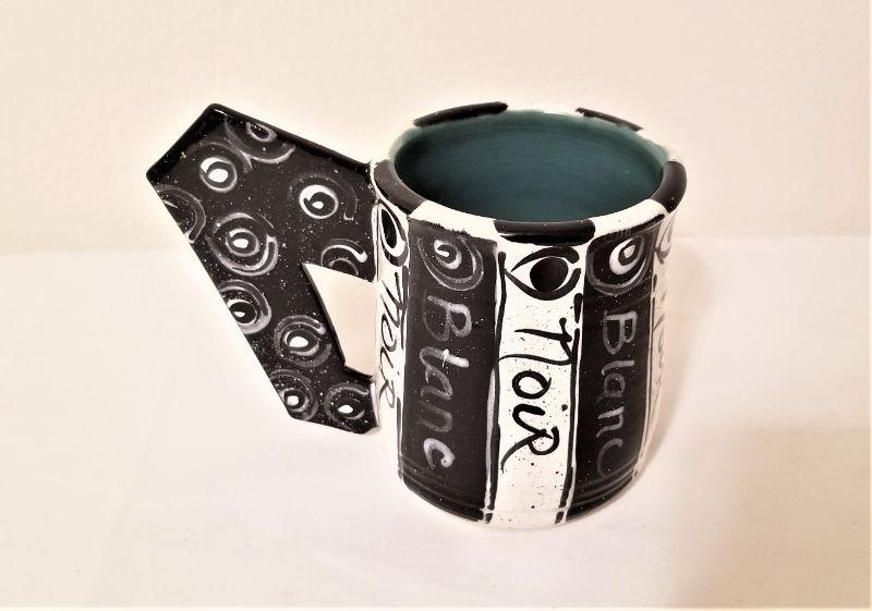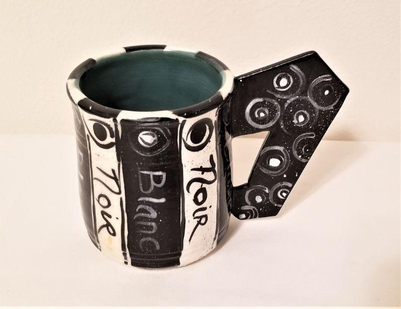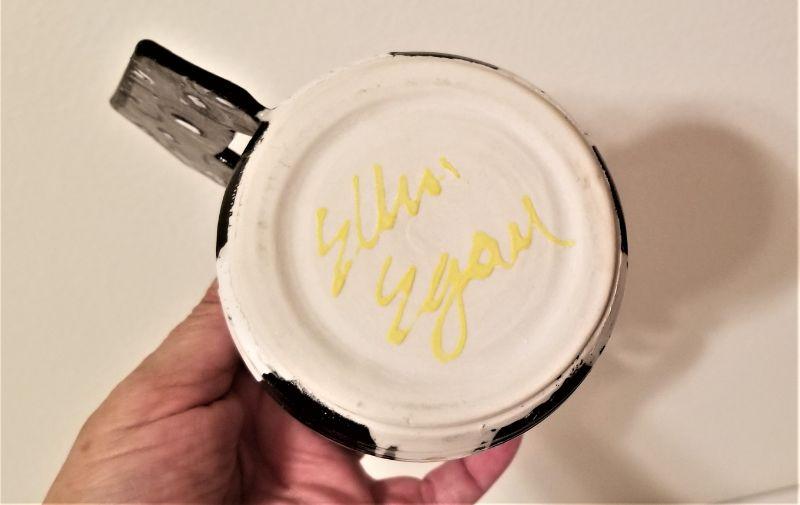 Black/White potter mug by well known local artist Ellin Egan - signed on bottom. Good condition - 4" tall.