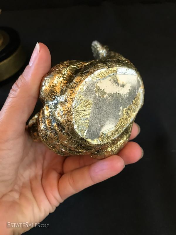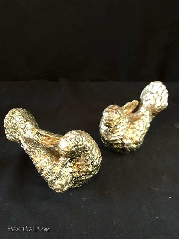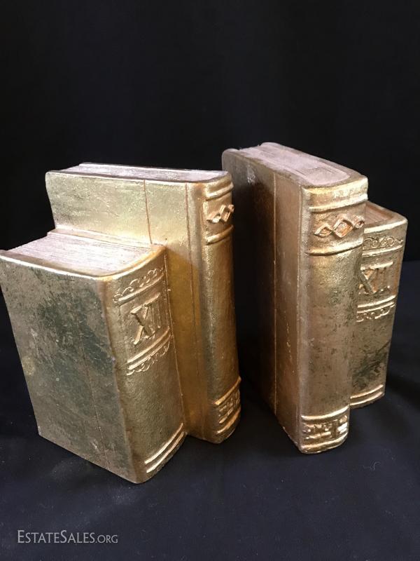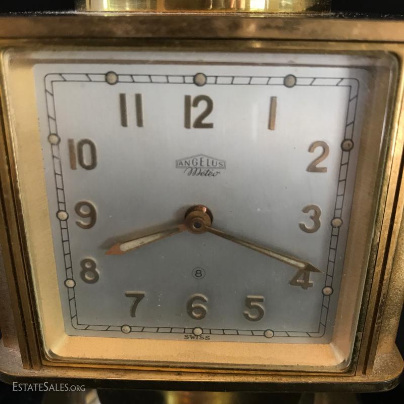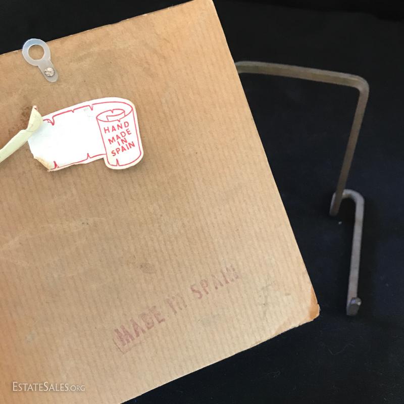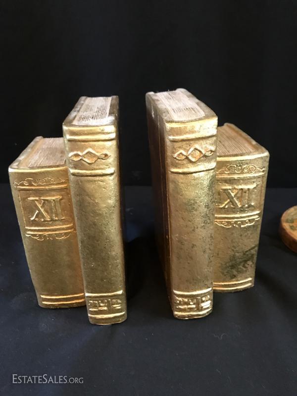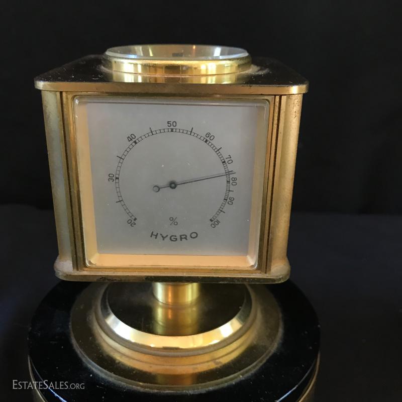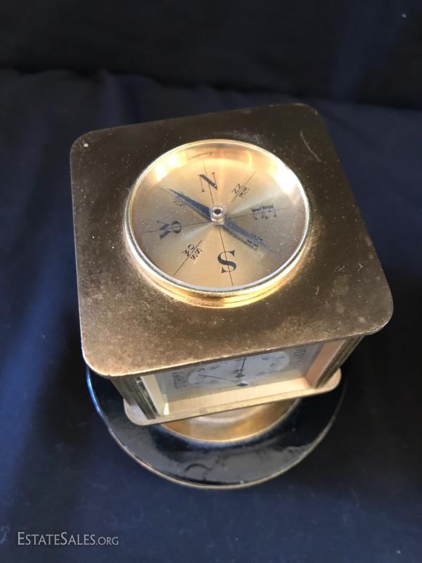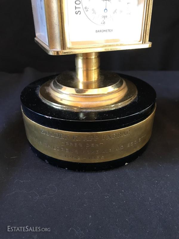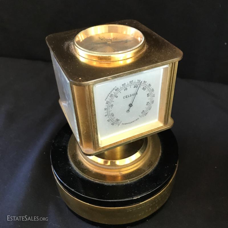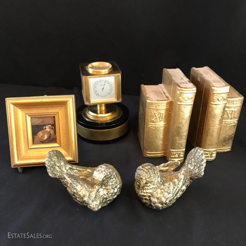 Brass tabletop barometer, compass, Angelus clock, hygrometer and thermometer. Top spins. Heavy brass base has engraving from 1955 for president of IL Children's Home and Aid Society. Measures 6" high on 5" diameter base. Lot also includes small still life painting from Spain. Measures 4.75" square. Gilded bookends and pair of birds complete the lot. Shipping available or local pick up in Flat Rock, NC.