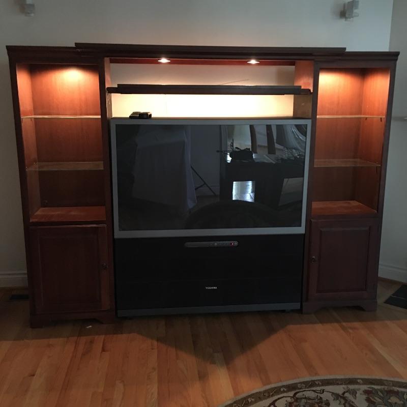 Toshiba model # 57H82 TV with remote and adjustable entertainment center with four lights, six open shelves and cabinets on bottom. TV powered on when tested.