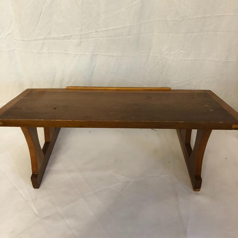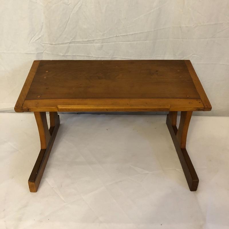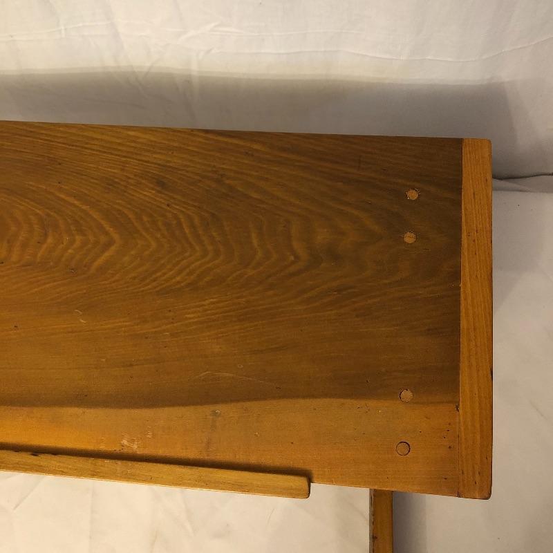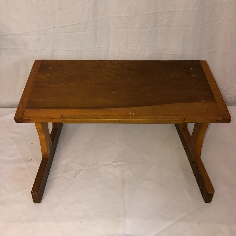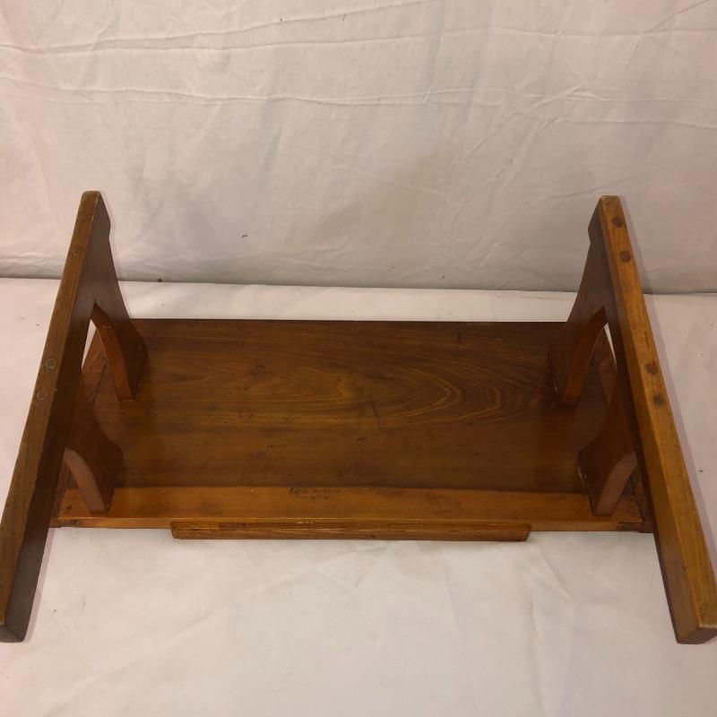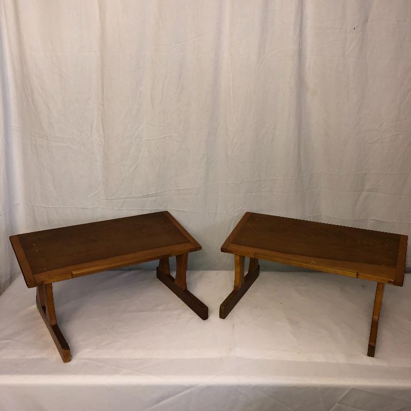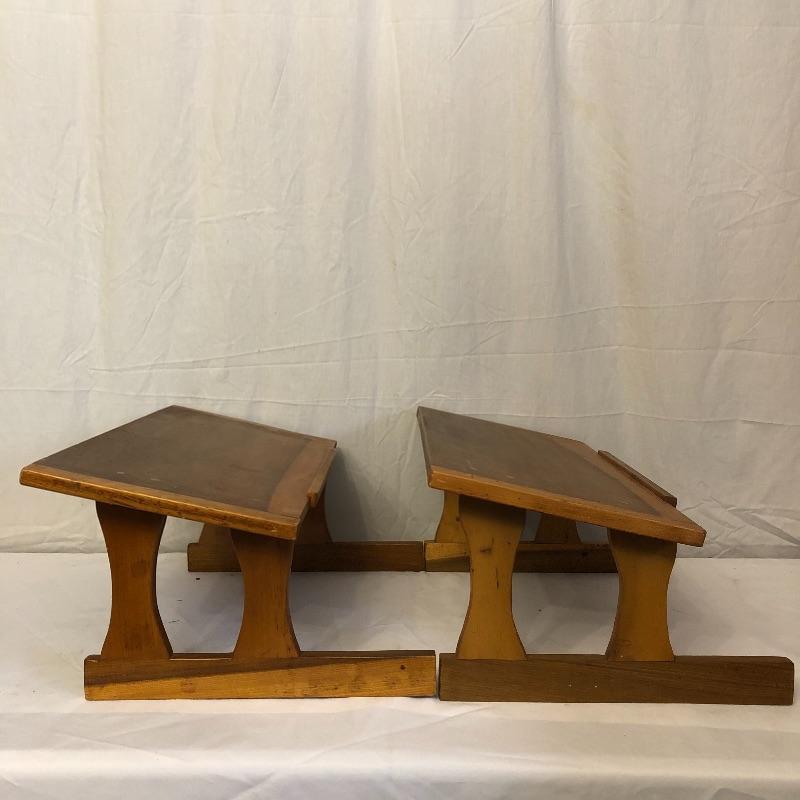 This pair of hand built lap desks are 25” long. The feet on both are 16” long and they are 11” tall from the bottom to the highest part of the table top. The table tops are just under 1 foot tall. Both lap desks have convenient pencil catchers centered on the bottom of the table tops.