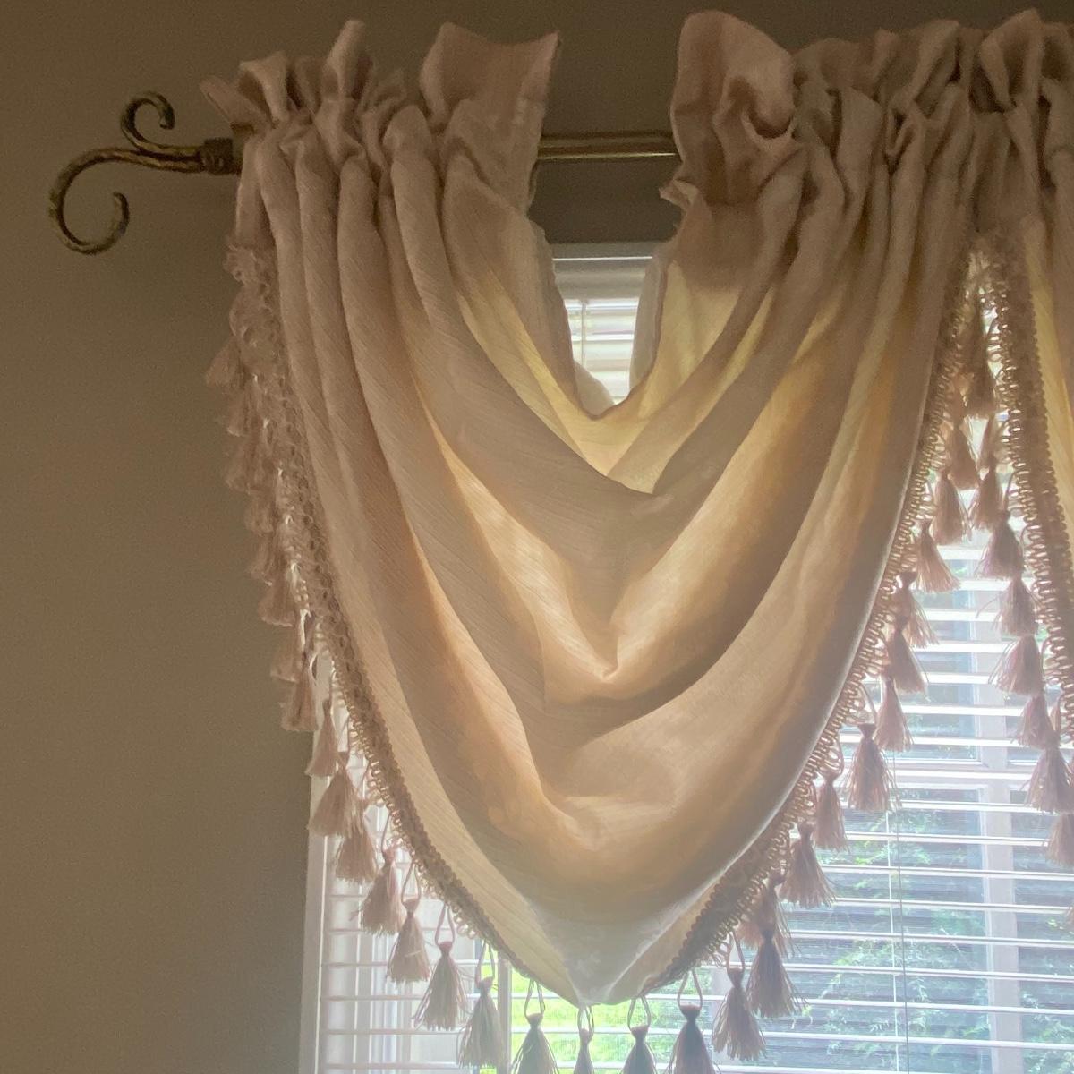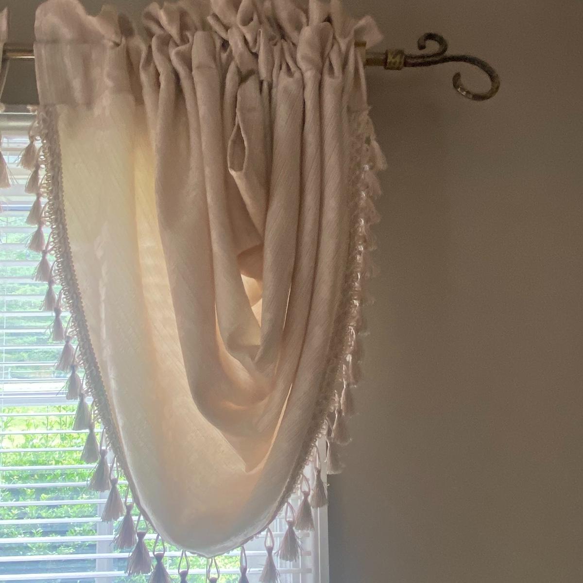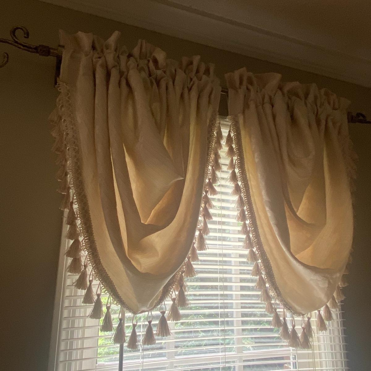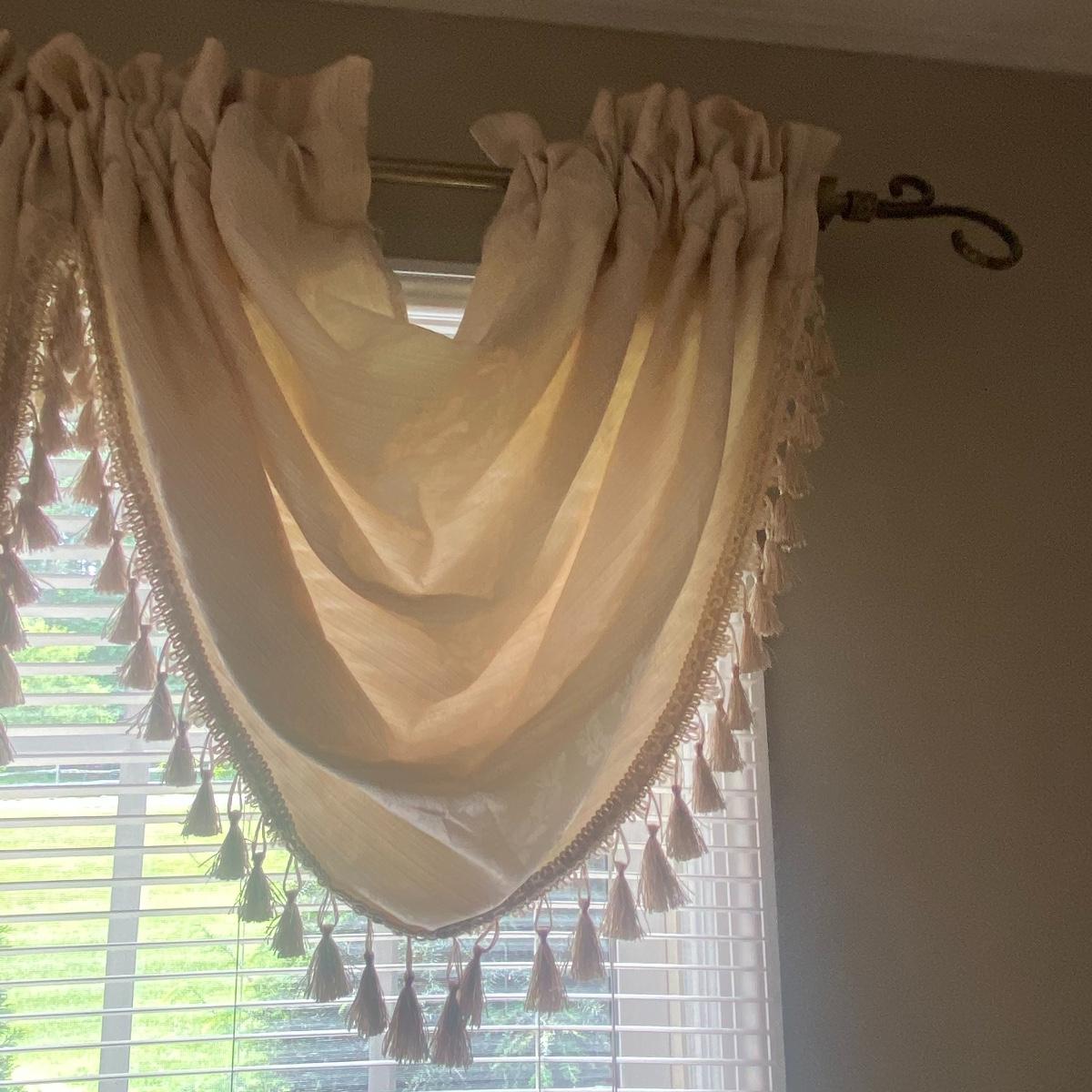 Lot includes stunning entryway decor. Notice golden colored oval mirror that has unique details and a bow detail on top. Lot also includes four panels of cream colored valances with tassel accents. Two sets of adjustable rods with curved finials, and mounts are included as well. Valances can be adjusted to a preferred U-shape. See photos for details and tags. Shipping is available.
