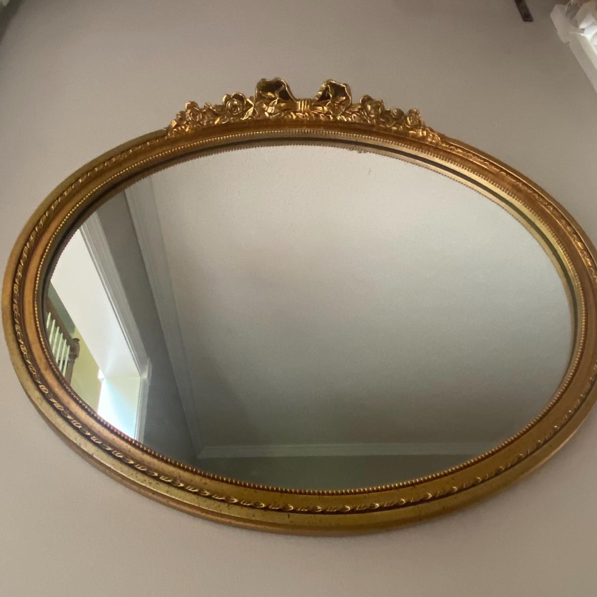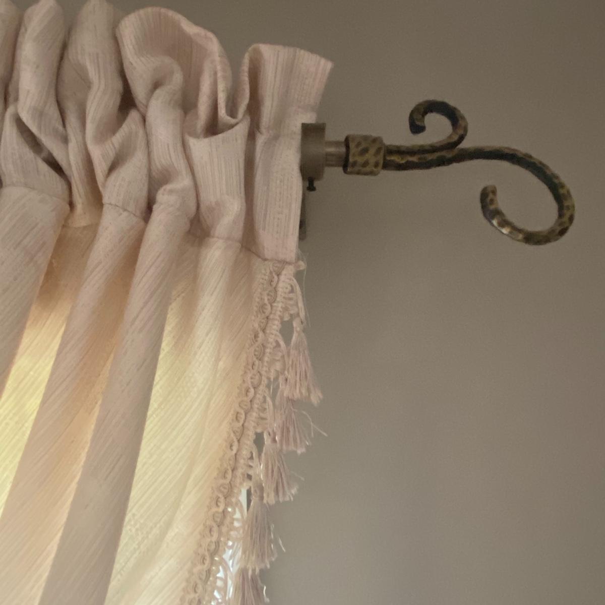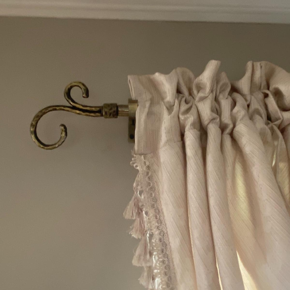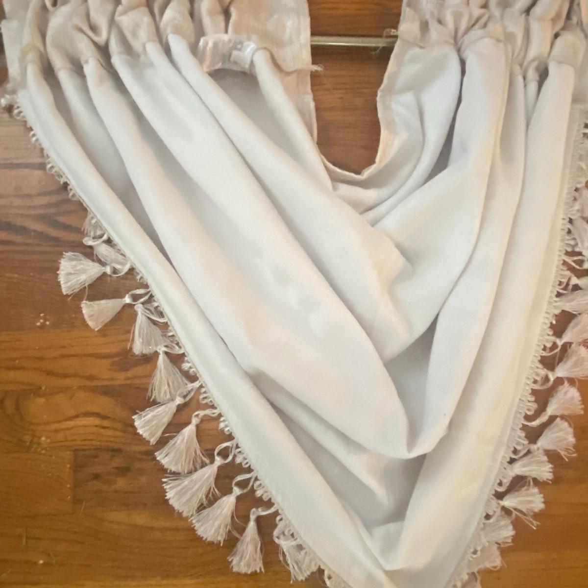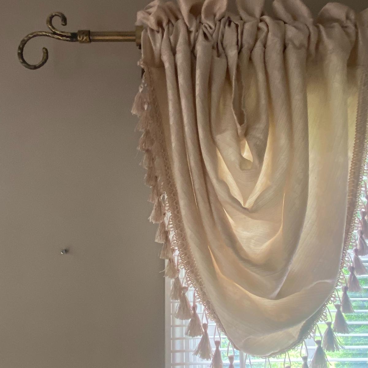 Lot includes stunning entryway decor. Notice golden colored oval mirror that has unique details and a bow detail on top. Lot also includes four panels of cream colored valances with tassel accents. Two sets of adjustable rods with curved finials, and mounts are included as well. Valances can be adjusted to a preferred U-shape. See photos for details and tags. Shipping is available.