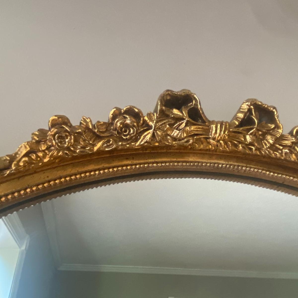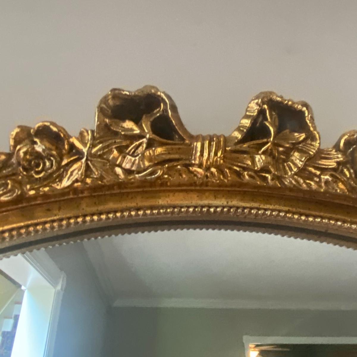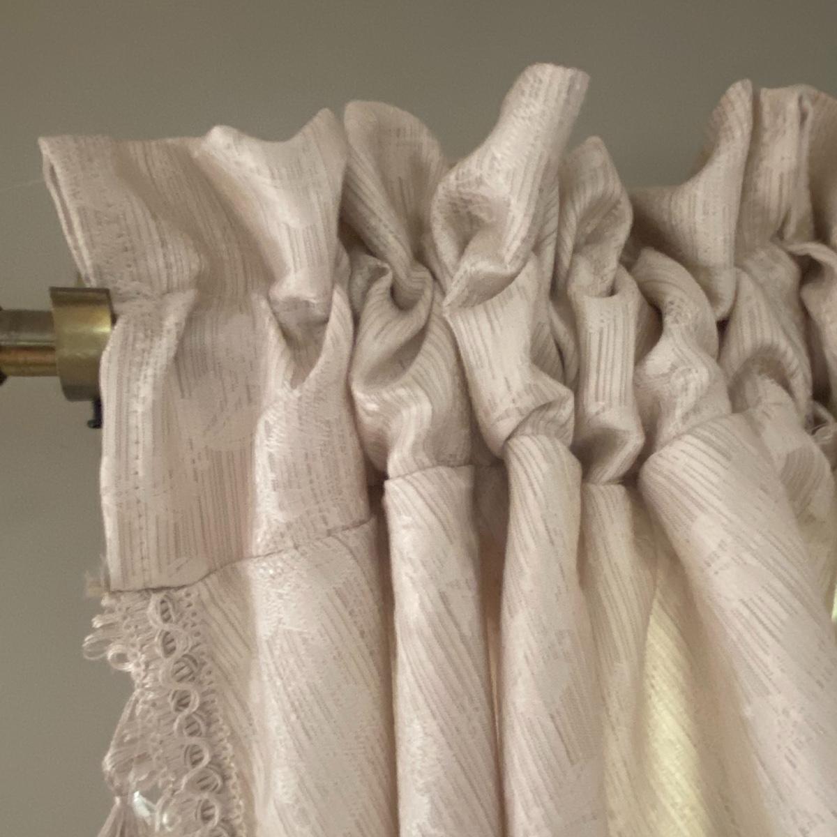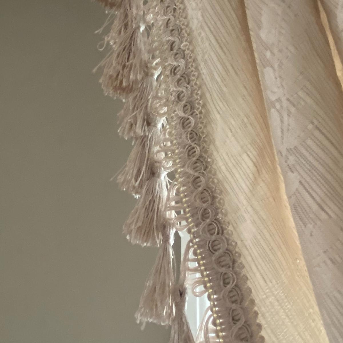 Lot includes stunning entryway decor. Notice golden colored oval mirror that has unique details and a bow detail on top. Lot also includes four panels of cream colored valances with tassel accents. Two sets of adjustable rods with curved finials, and mounts are included as well. Valances can be adjusted to a preferred U-shape. See photos for details and tags. Shipping is available.