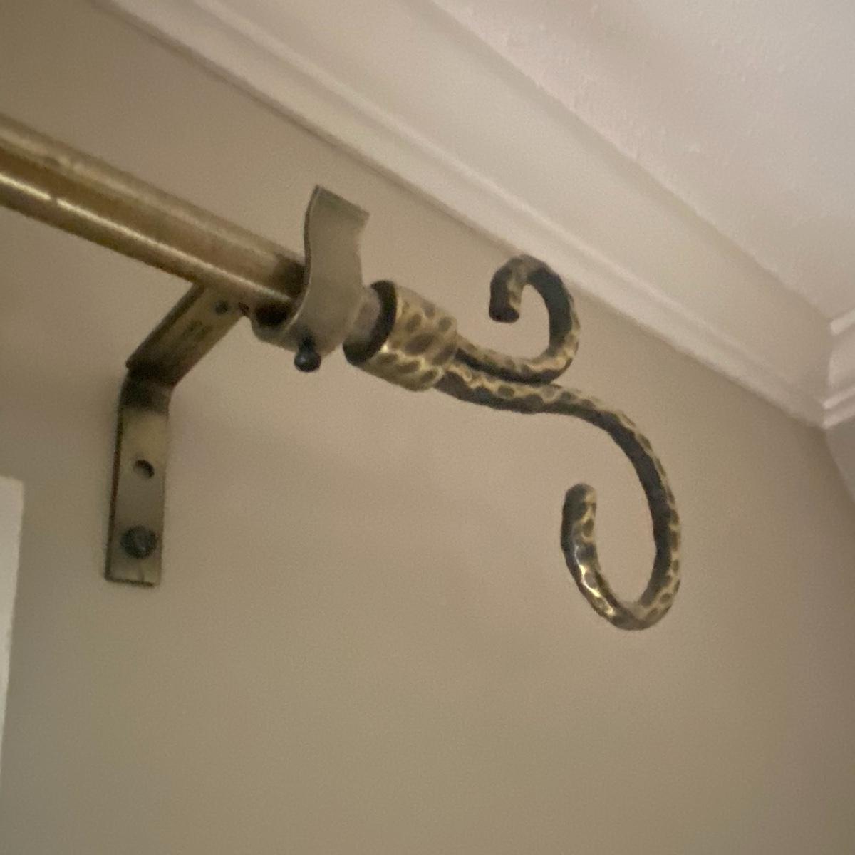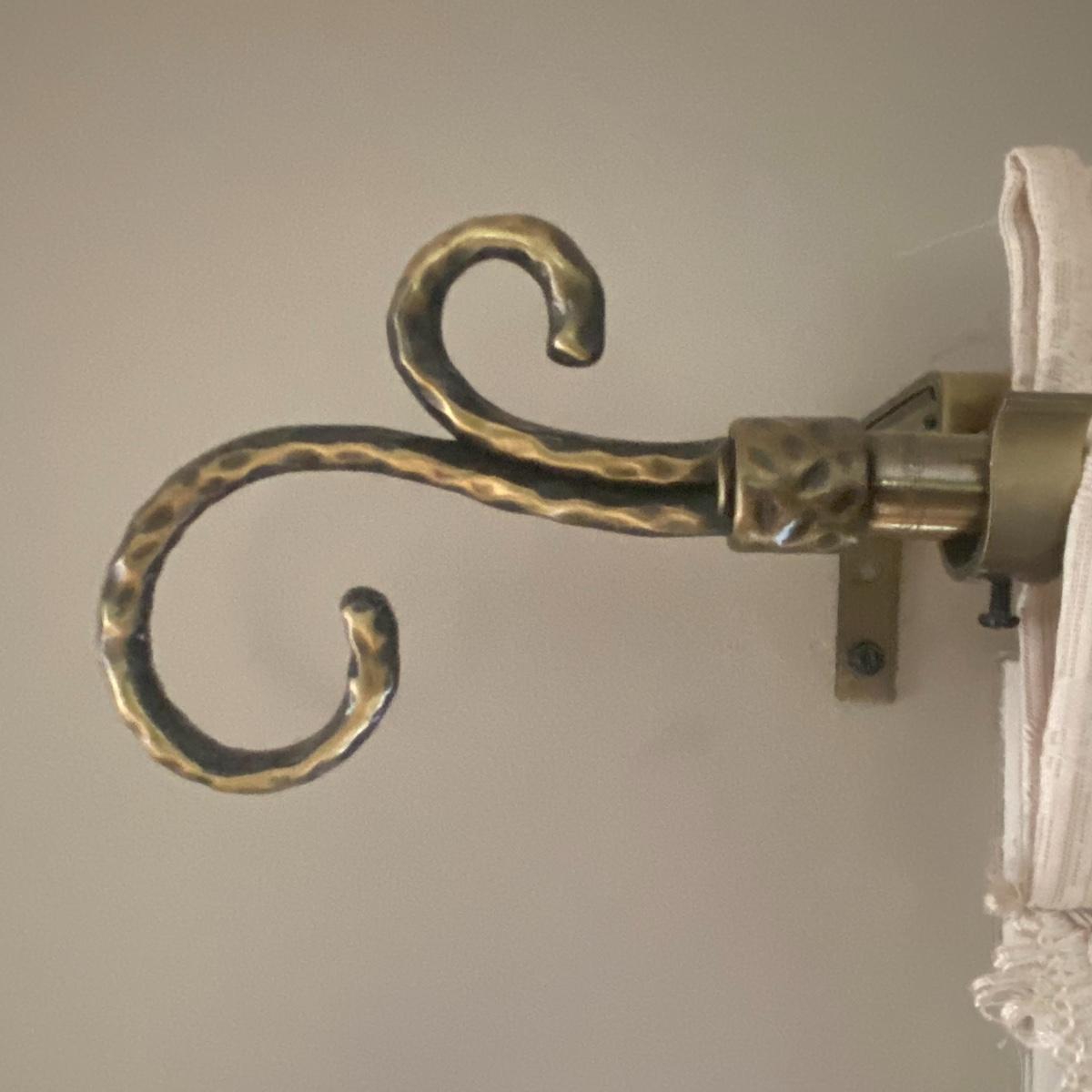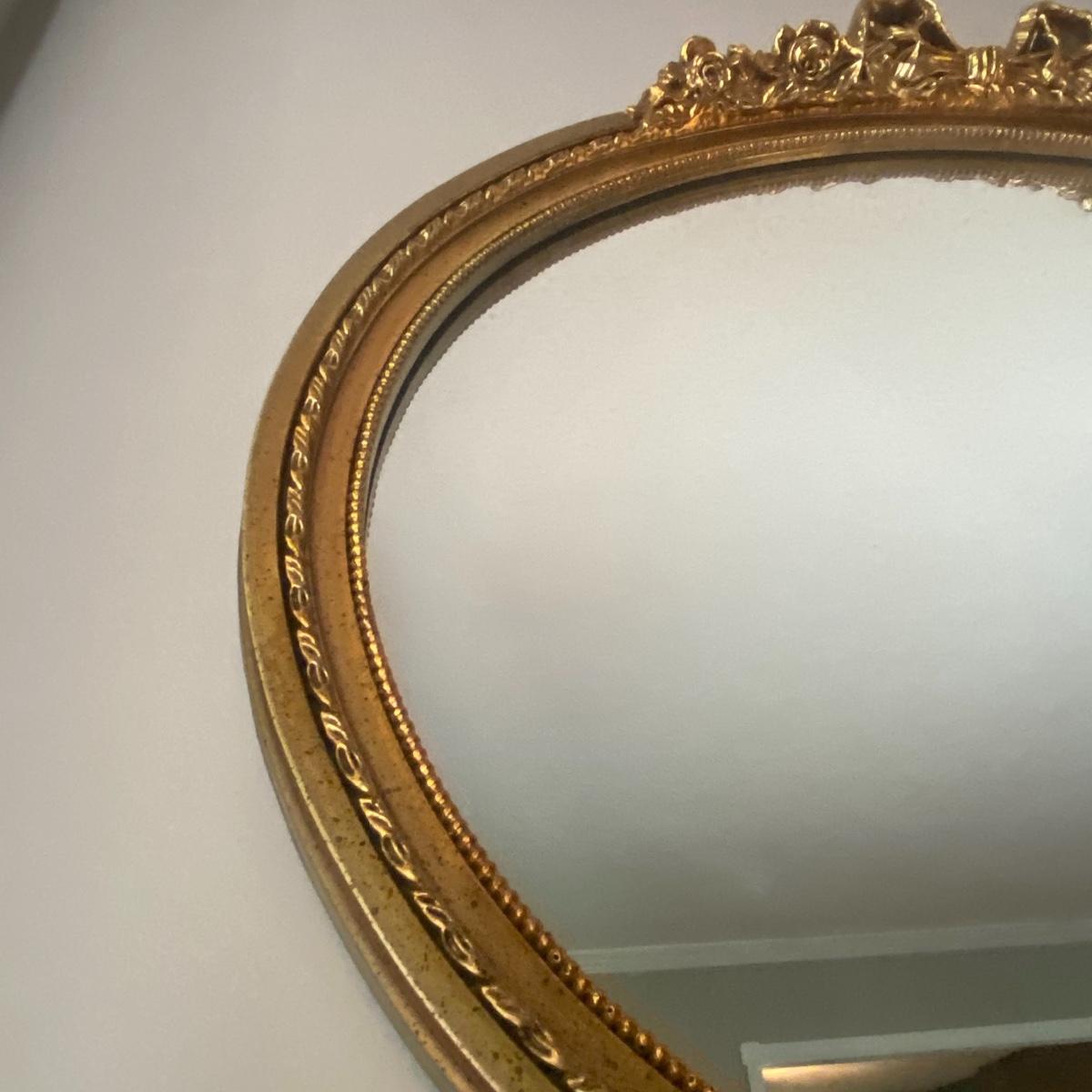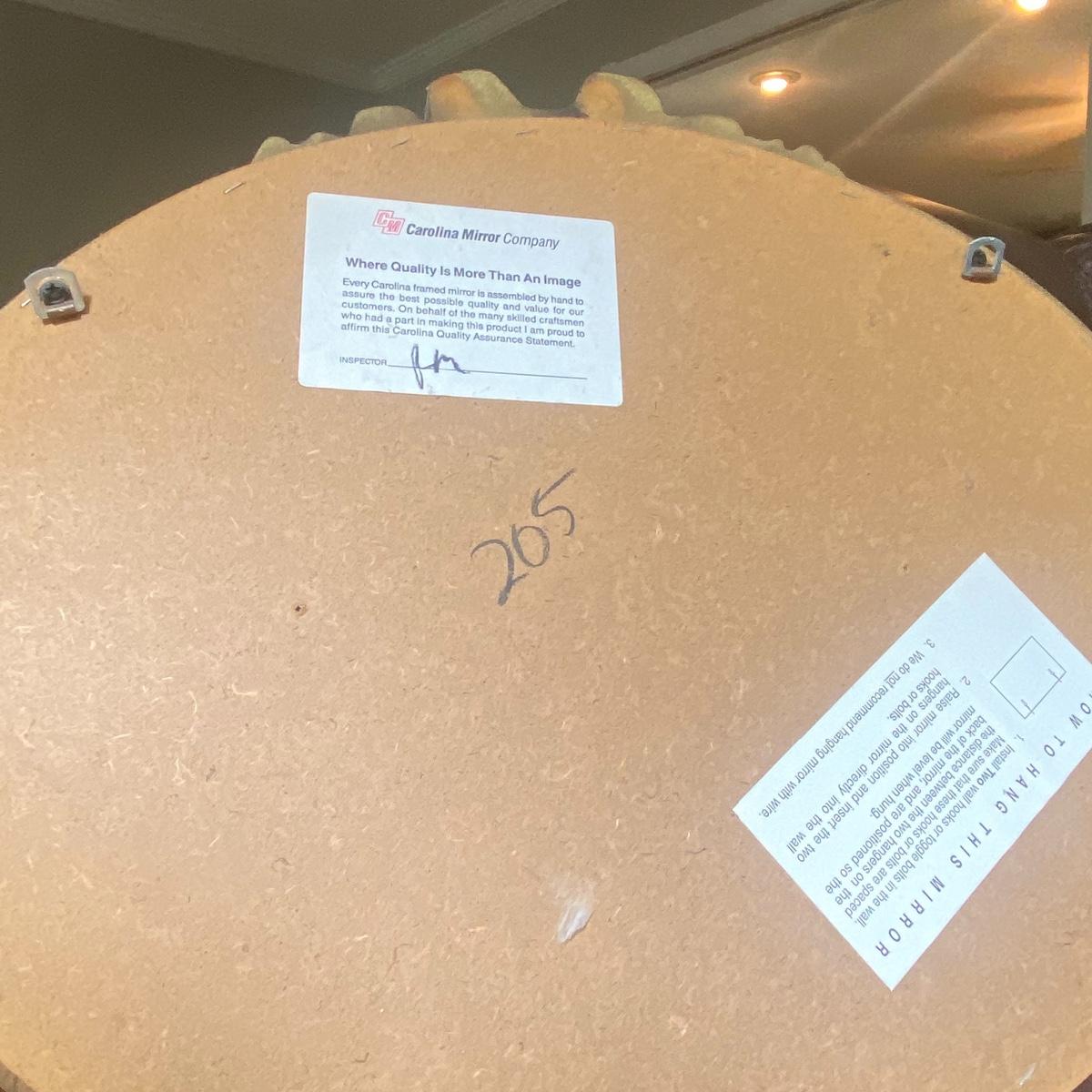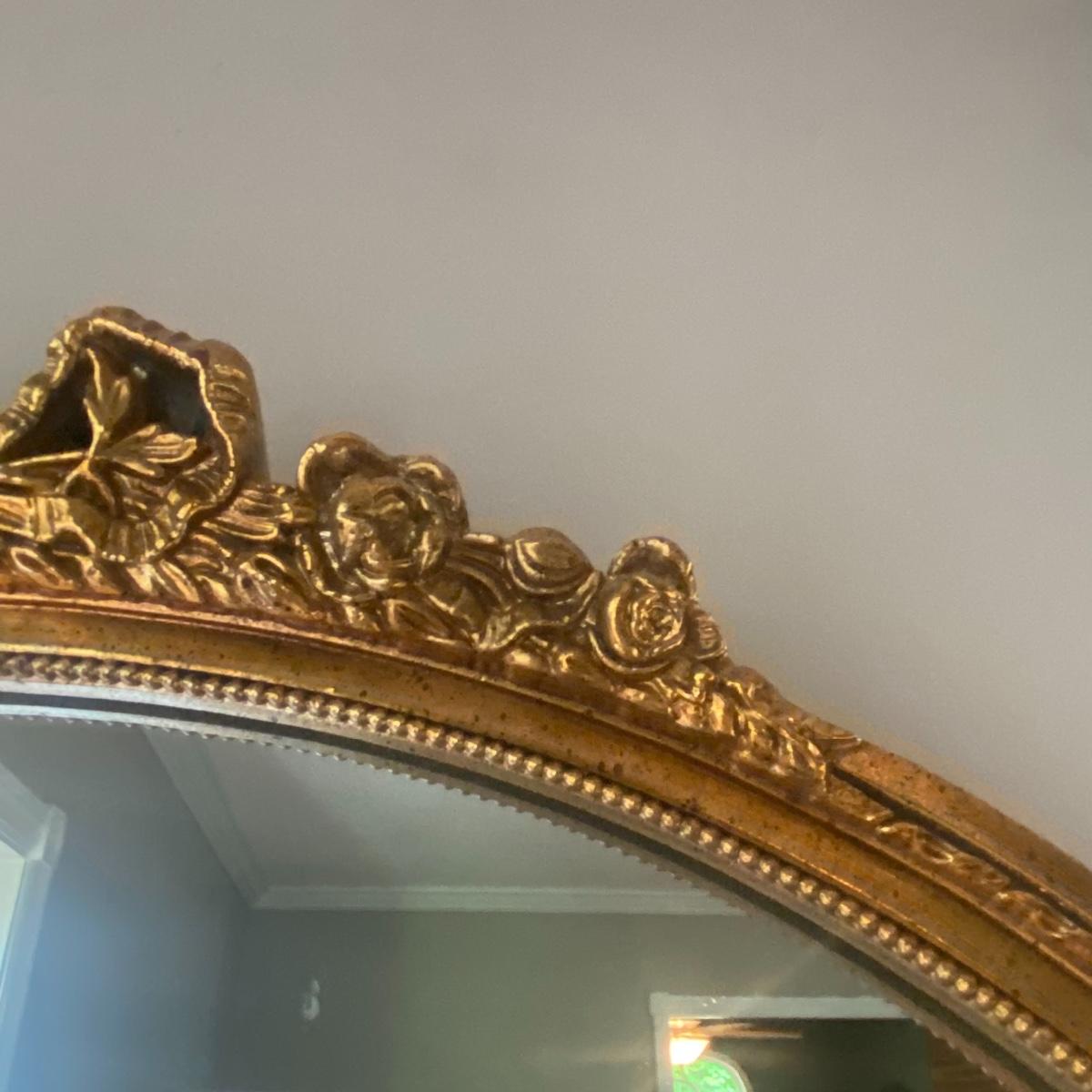 Lot includes stunning entryway decor. Notice golden colored oval mirror that has unique details and a bow detail on top. Lot also includes four panels of cream colored valances with tassel accents. Two sets of adjustable rods with curved finials, and mounts are included as well. Valances can be adjusted to a preferred U-shape. See photos for details and tags. Shipping is available.