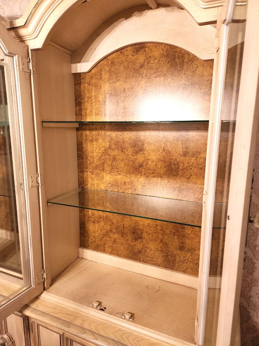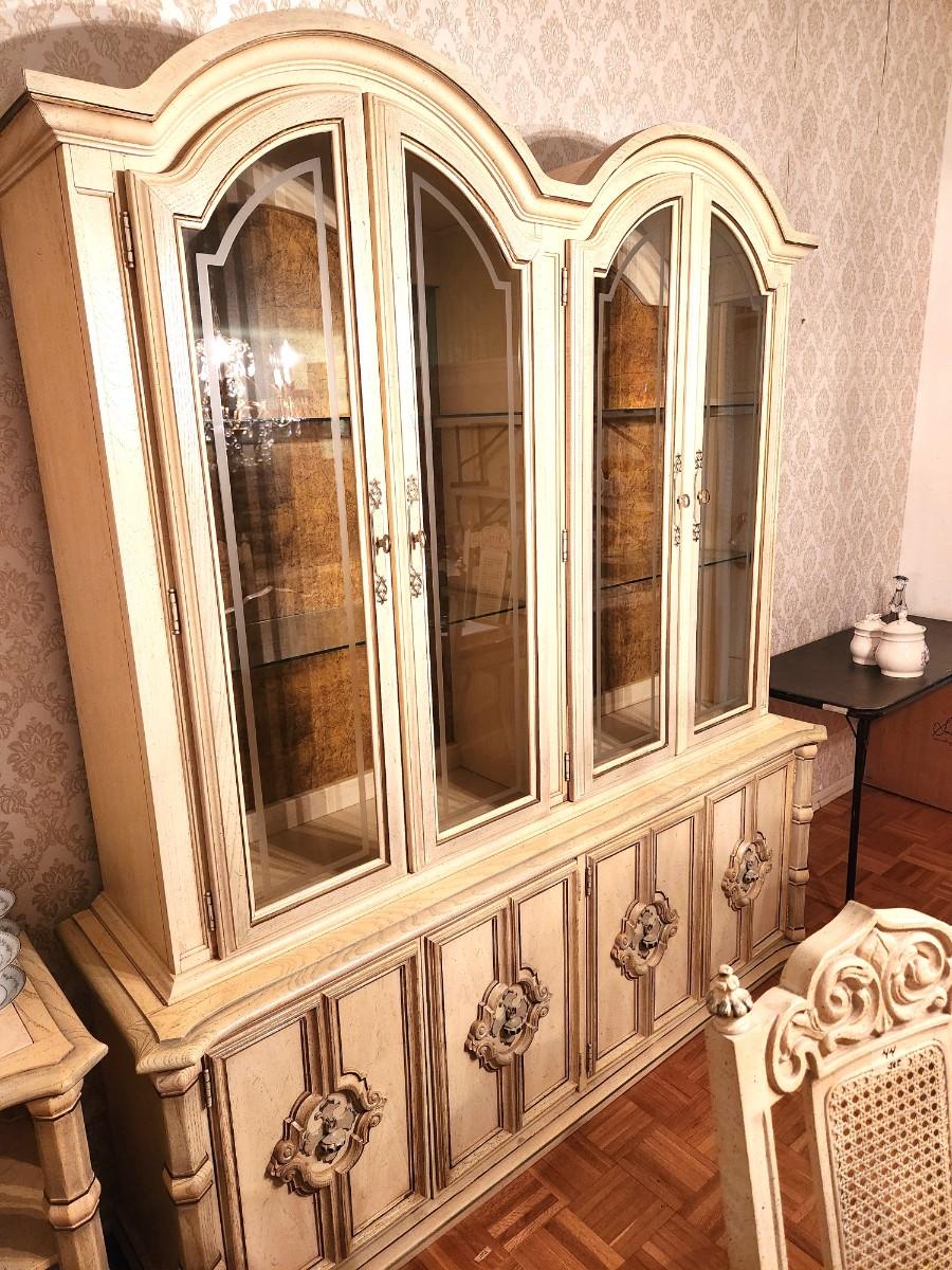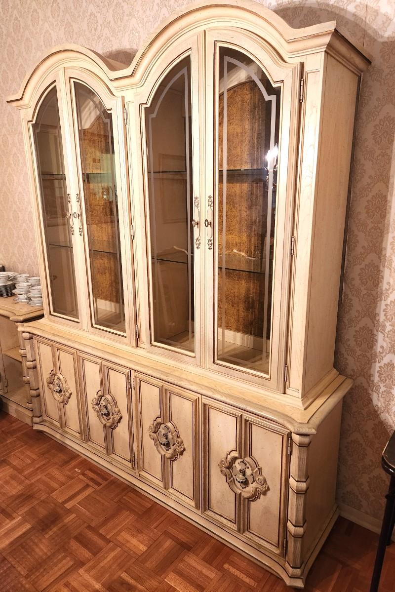 Large French Provincial Farmhouse style china cabinet - 1970s - by Stanley Furniture Company. 6 feet across, 17" deep, 82" tall. Lighted. Glass shelving, lots of storage - has flatware storage section. Good condition. Matches the dining table and servier listed earlier.