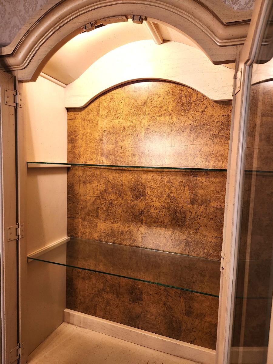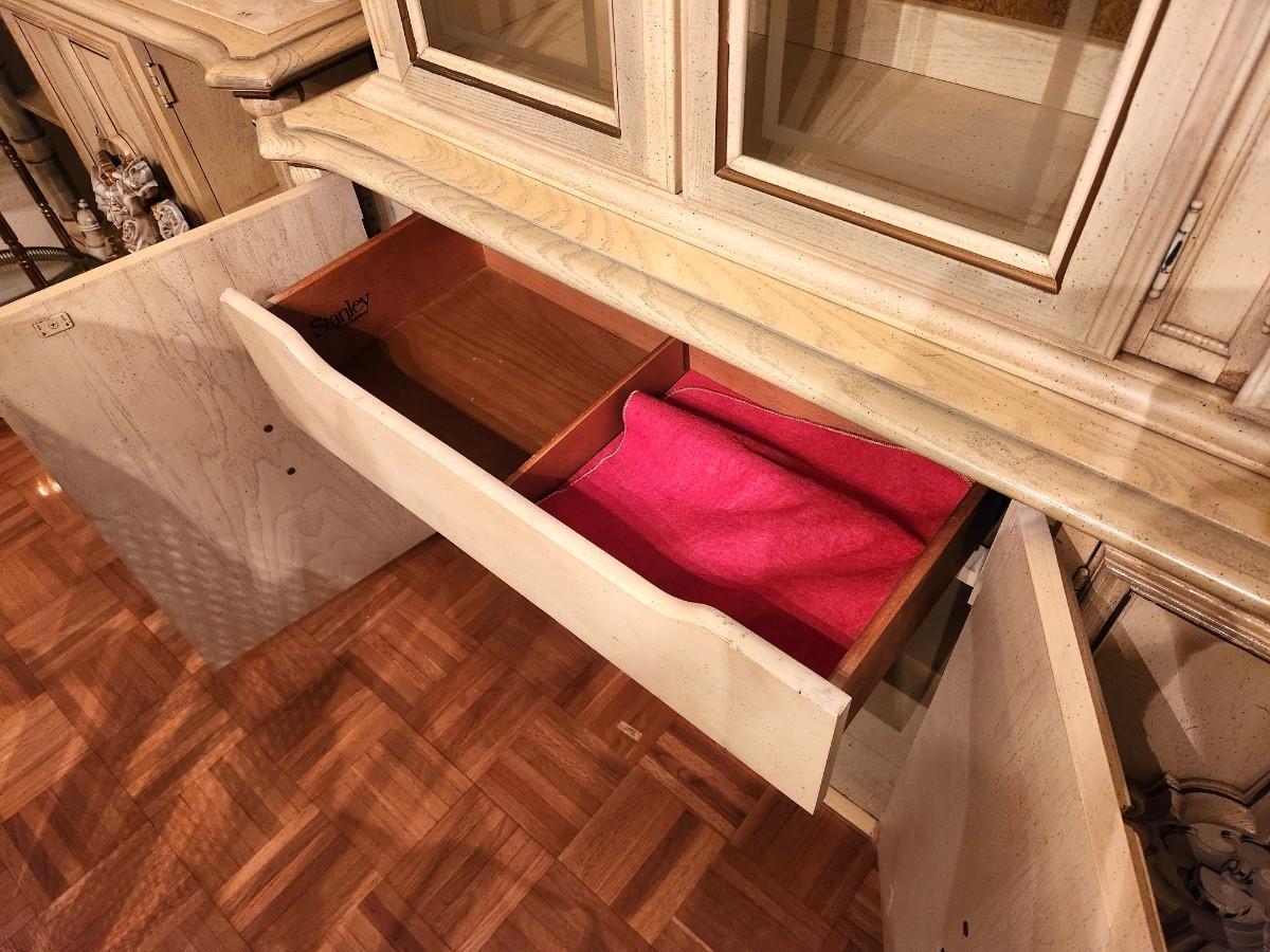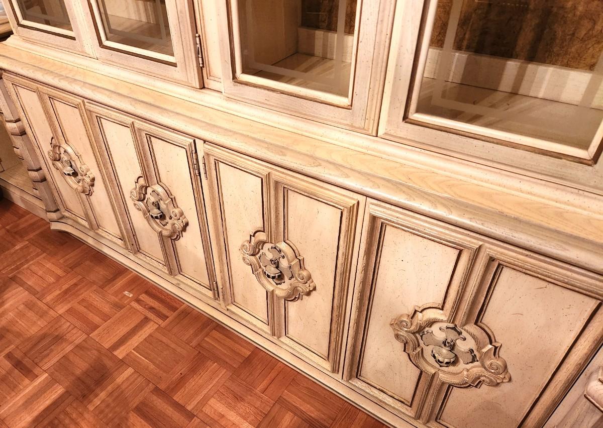Large French Provincial Farmhouse style china cabinet - 1970s - by Stanley Furniture Company. 6 feet across, 17" deep, 82" tall. Lighted. Glass shelving, lots of storage - has flatware storage section. Good condition. Matches the dining table and servier listed earlier.