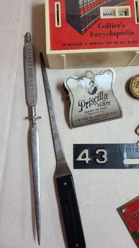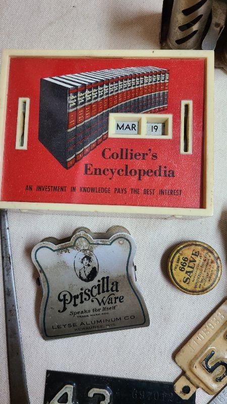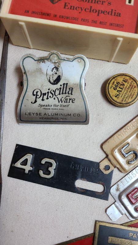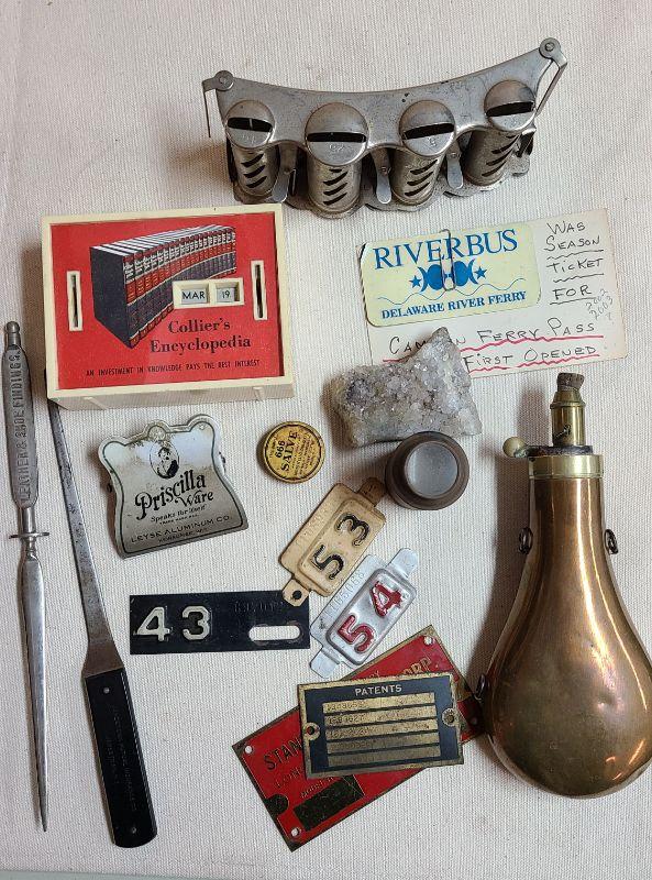 Fun lot of smalls. Gunpowder flask, bank, coin carrier etc. Please see all pictures for condition of the items listed and what is included in the lot. Pictures will also show any measurements if taken and is the best representation of the items. Thank you for looking and have fun bidding! We appreciate Treasure Hunters!
