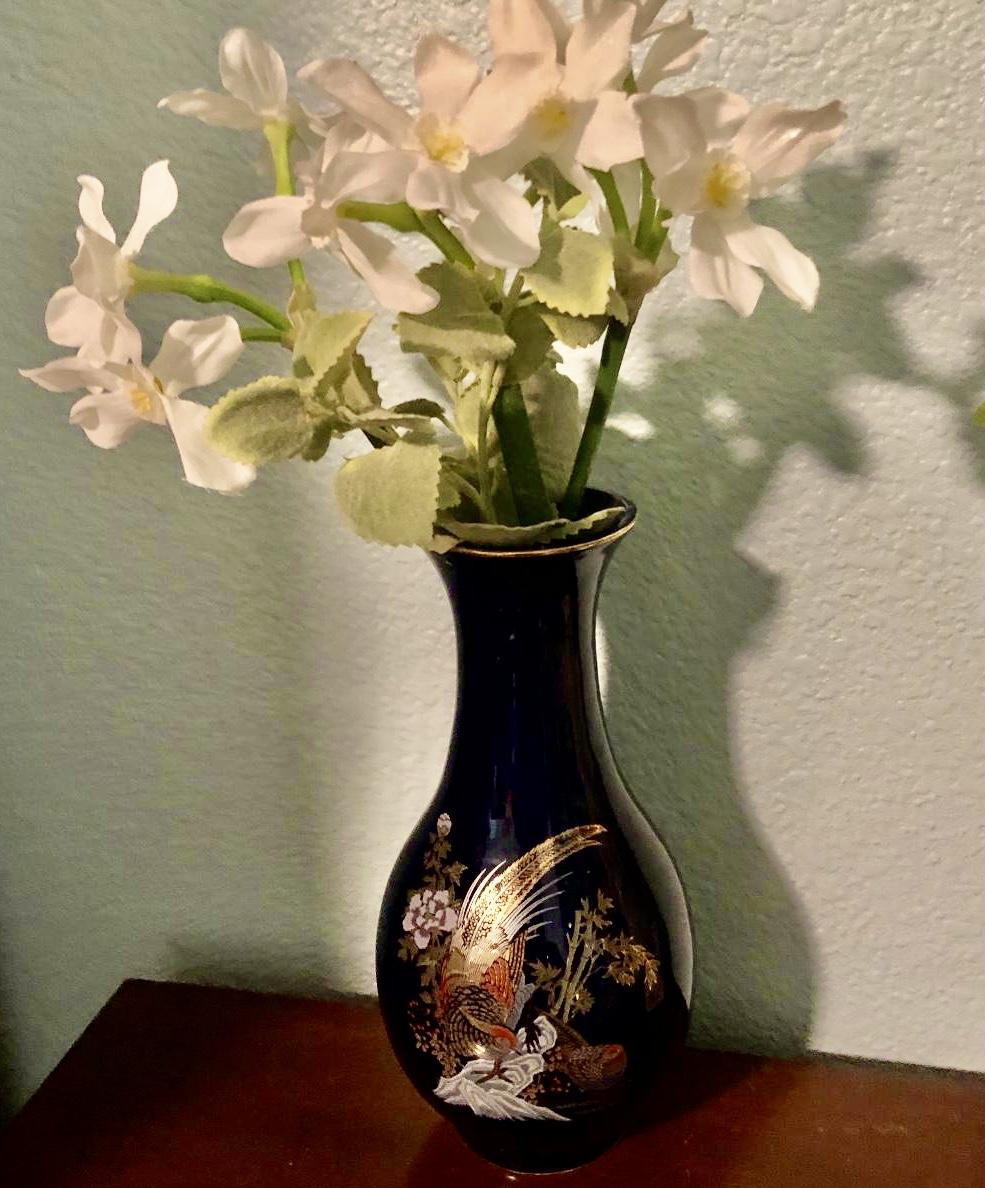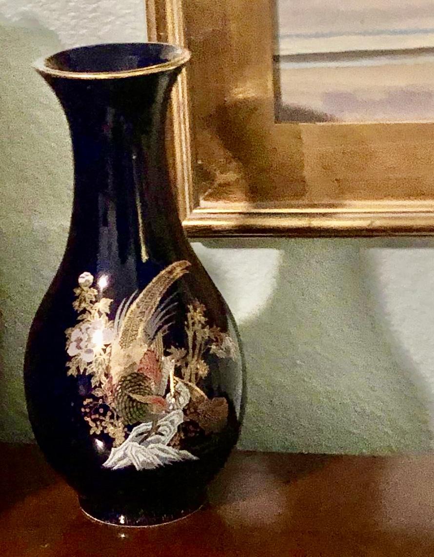 Beautiful blue vase from pre-war Japan. The scale and shape is special on this piece; painted w/ elegant gold lines & flowers.