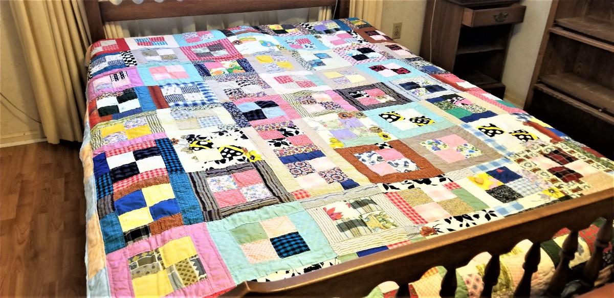 This quilt fits a full/double bed, as shown. Vintage cotton material, hand sewn. Back is a plain light blue. Good condition. 69" across, 88" long.