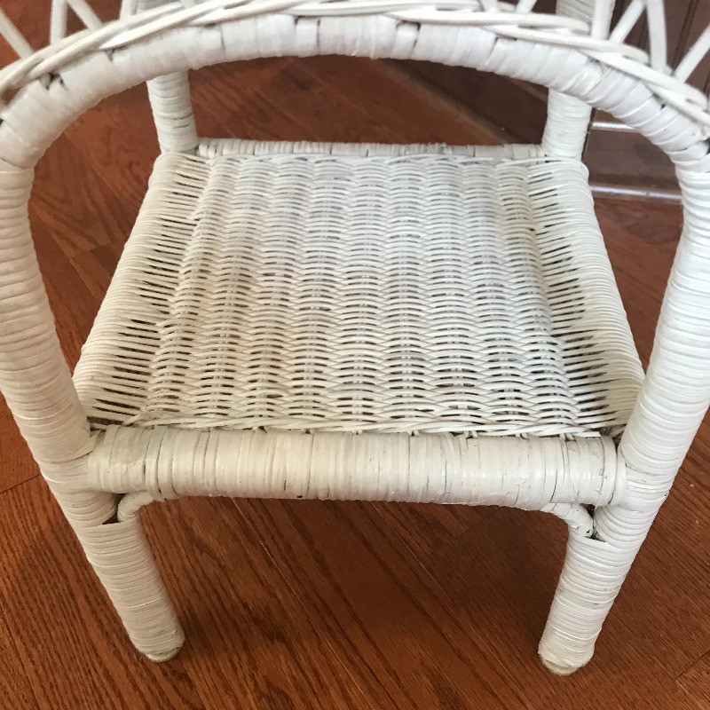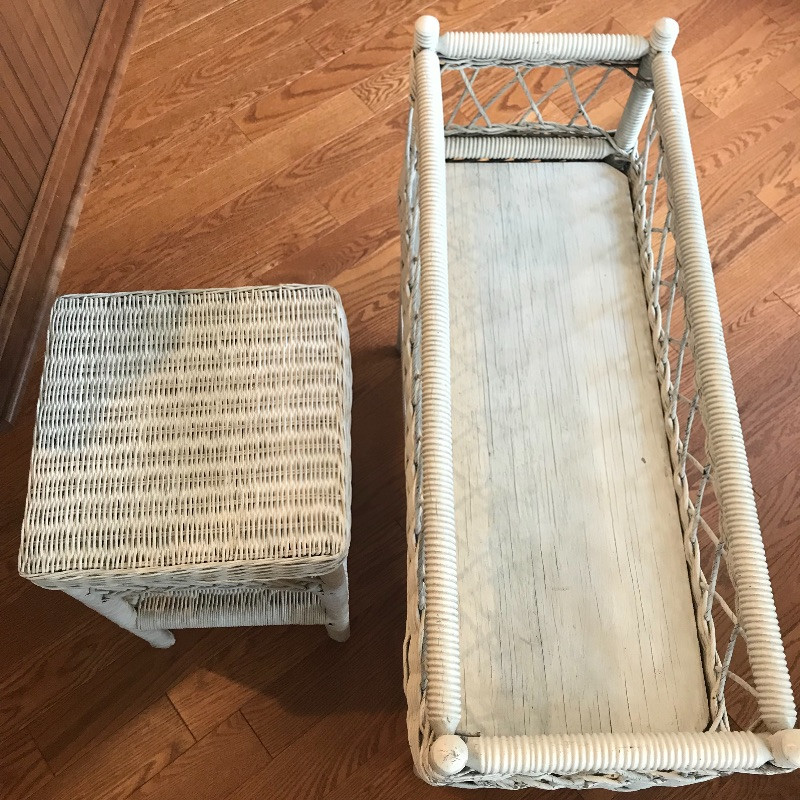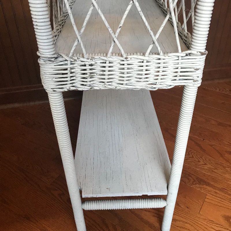 Two nice white wicker plant stands. The larger stand has a 7” deep tray for a planter or whatever decor you choose. The shelves are white painted wood and it measures approximately 27” x 10” x 28”. The smaller wicker stand measures approximately 12”sq x 21.5”. Local Pickup Only.